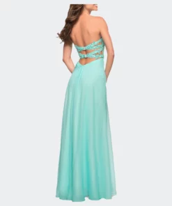 La Femme Strapless Chiffon Prom Gown With Criss Cross Back