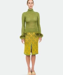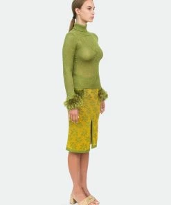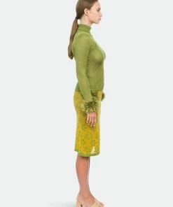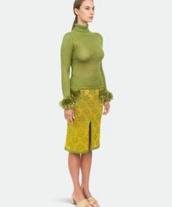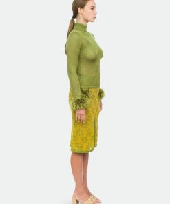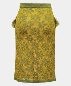 Green knit skirt with handmade knit details is cut from lightweight high quality knit with a hint of stretch. The skirt has floral print and handmade knit details on the pockets. Style the skirt with yellow knit turtleneck with handmade knit details and a pair of mules.