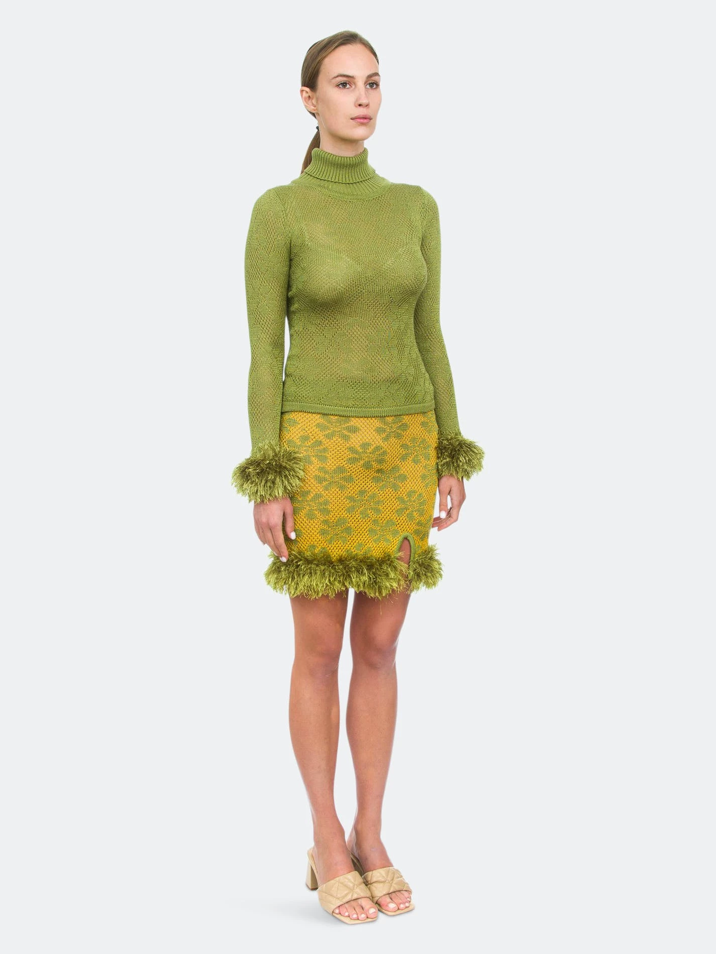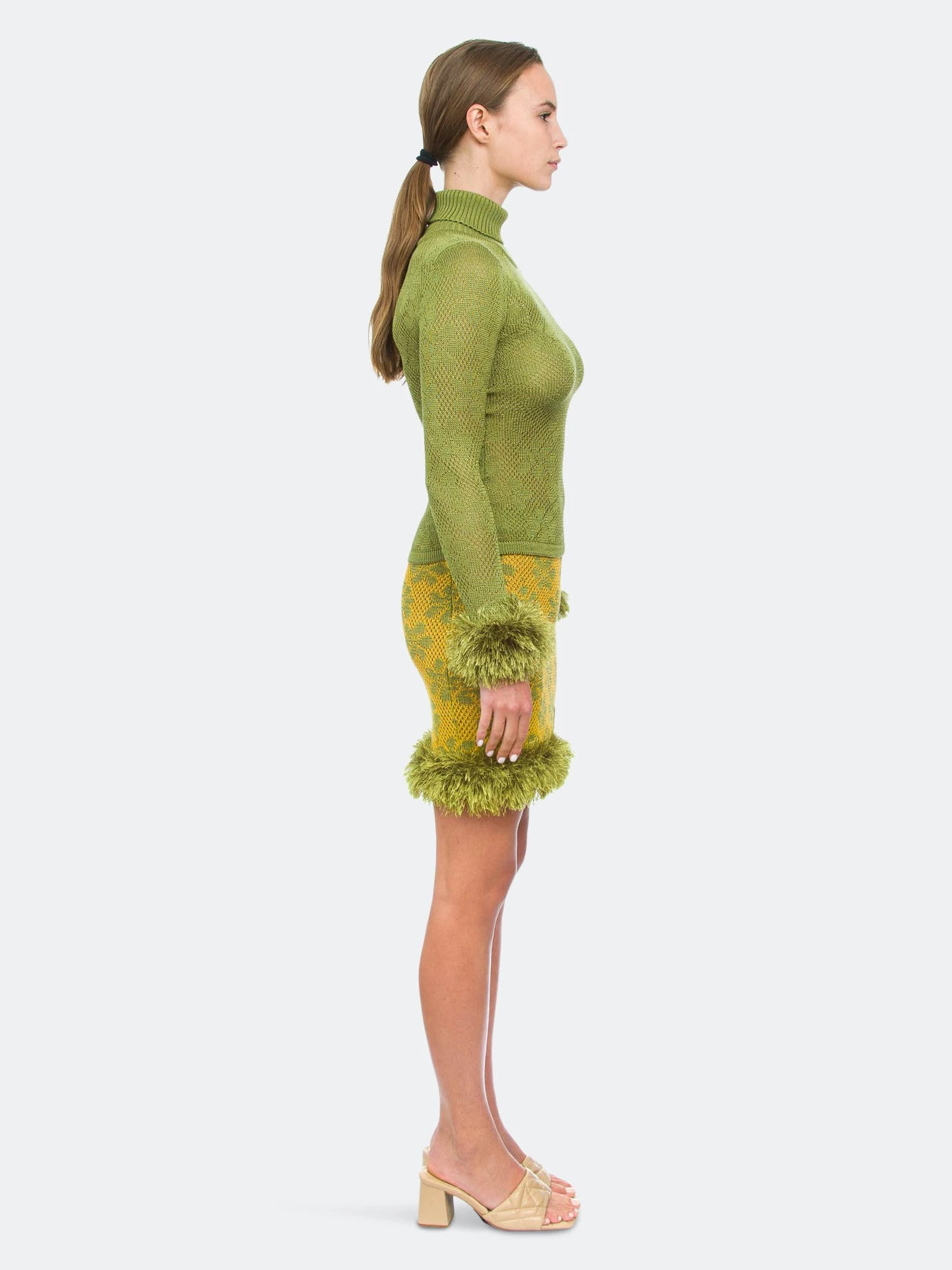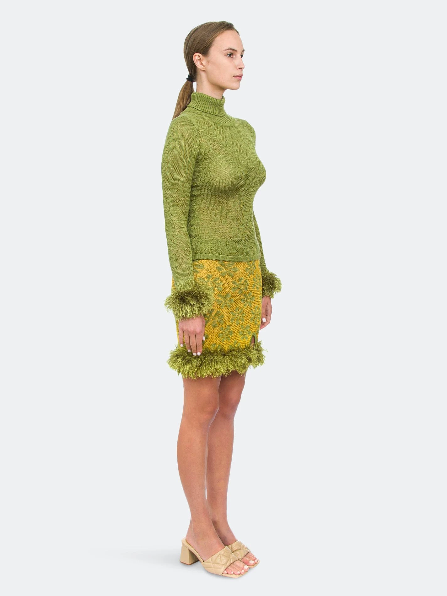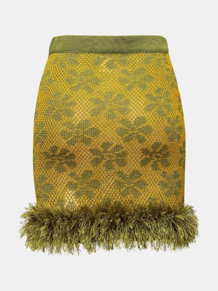 Mini green knit skirt with handmade knit details is cut from lightweight high quality knit with a hint of stretch. The skirt has floral print and handmade knit details. Style the skirt with green knit top and a pair of mules.