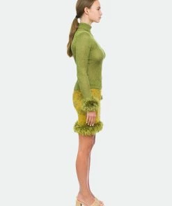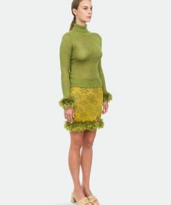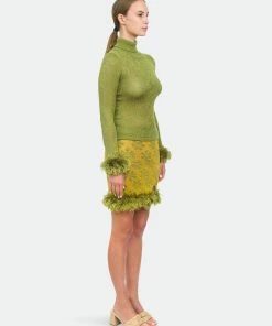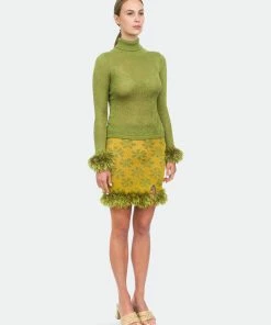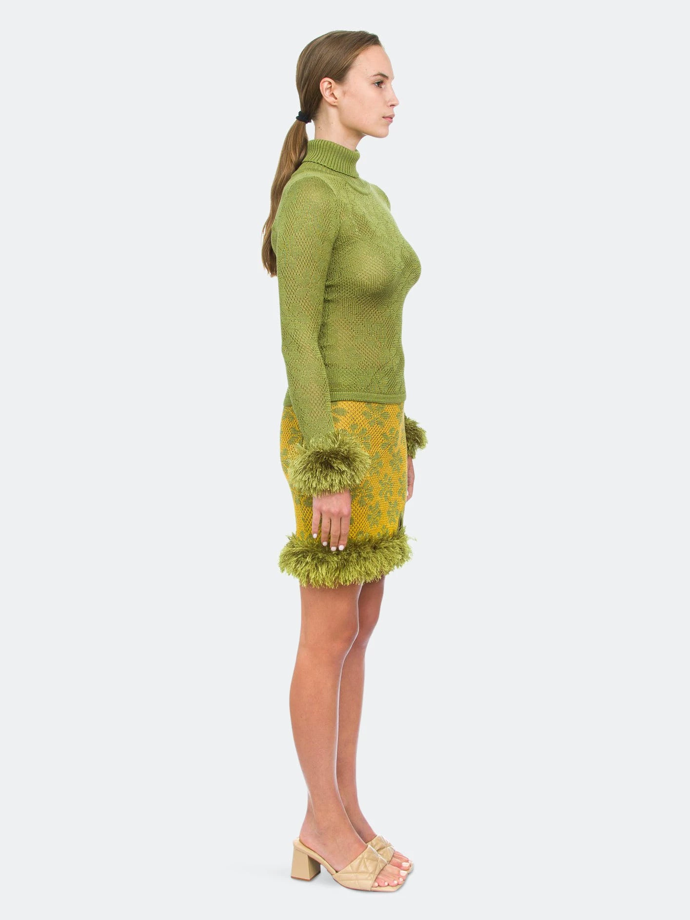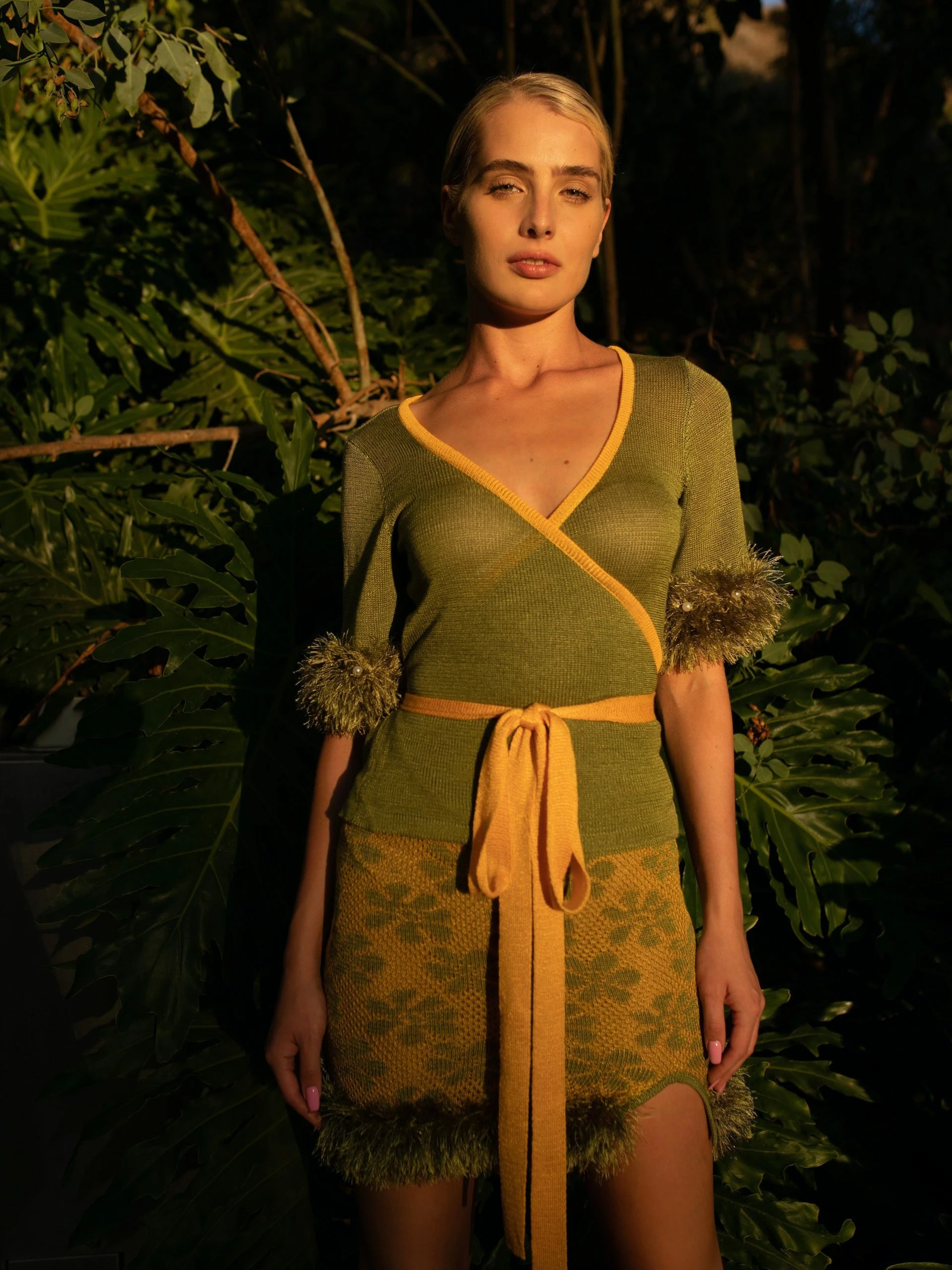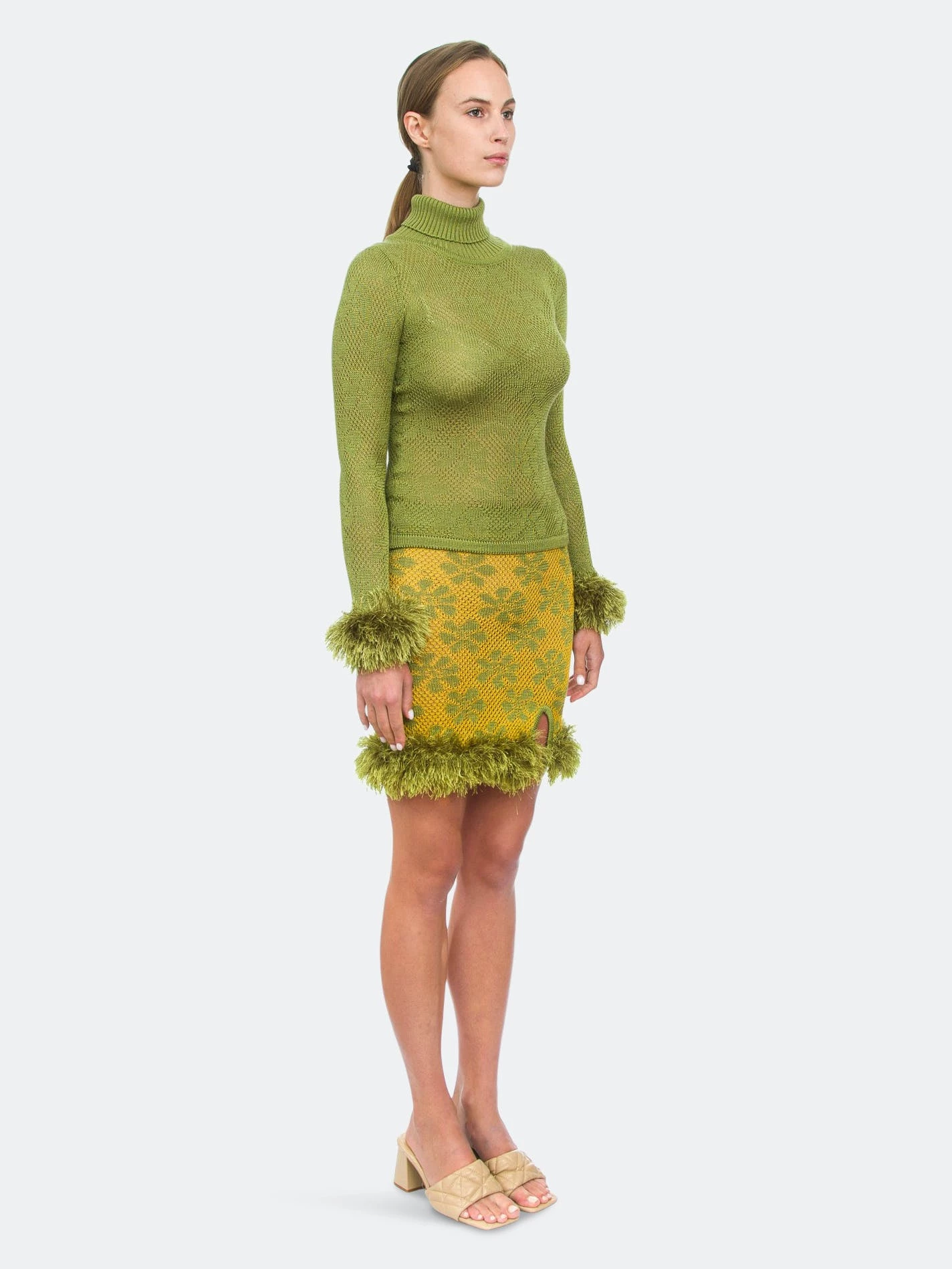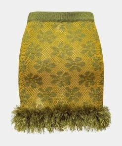 Mini green knit skirt with handmade knit details is cut from lightweight high quality knit with a hint of stretch. The skirt has floral print and handmade knit details. Style the skirt with green knit top and a pair of mules.