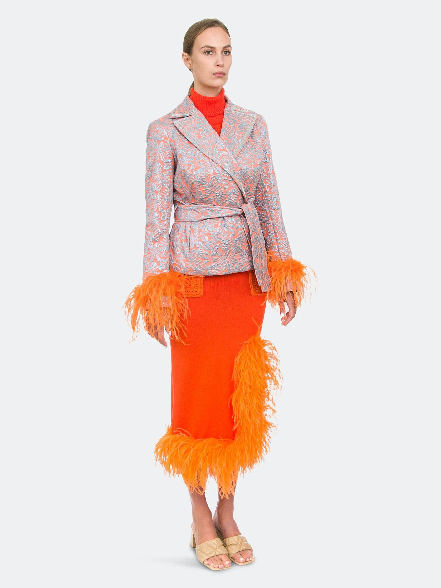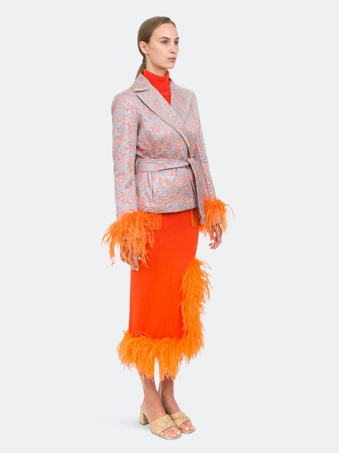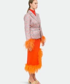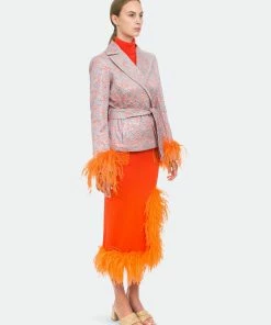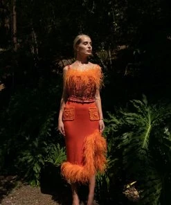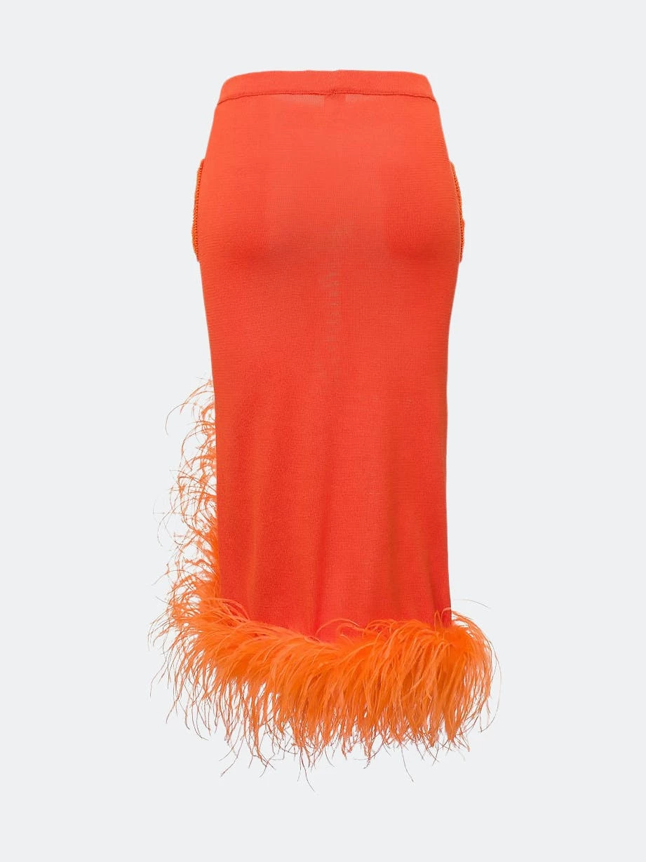 Orange Knit Skirt With Feather Details is cut from lightweight high quality knit with a hint of stretch. The skirt has ruffled feather trim and a belted waist. Style the skirt with Handmade Knit Sweater or Jacket and a pair of mules.