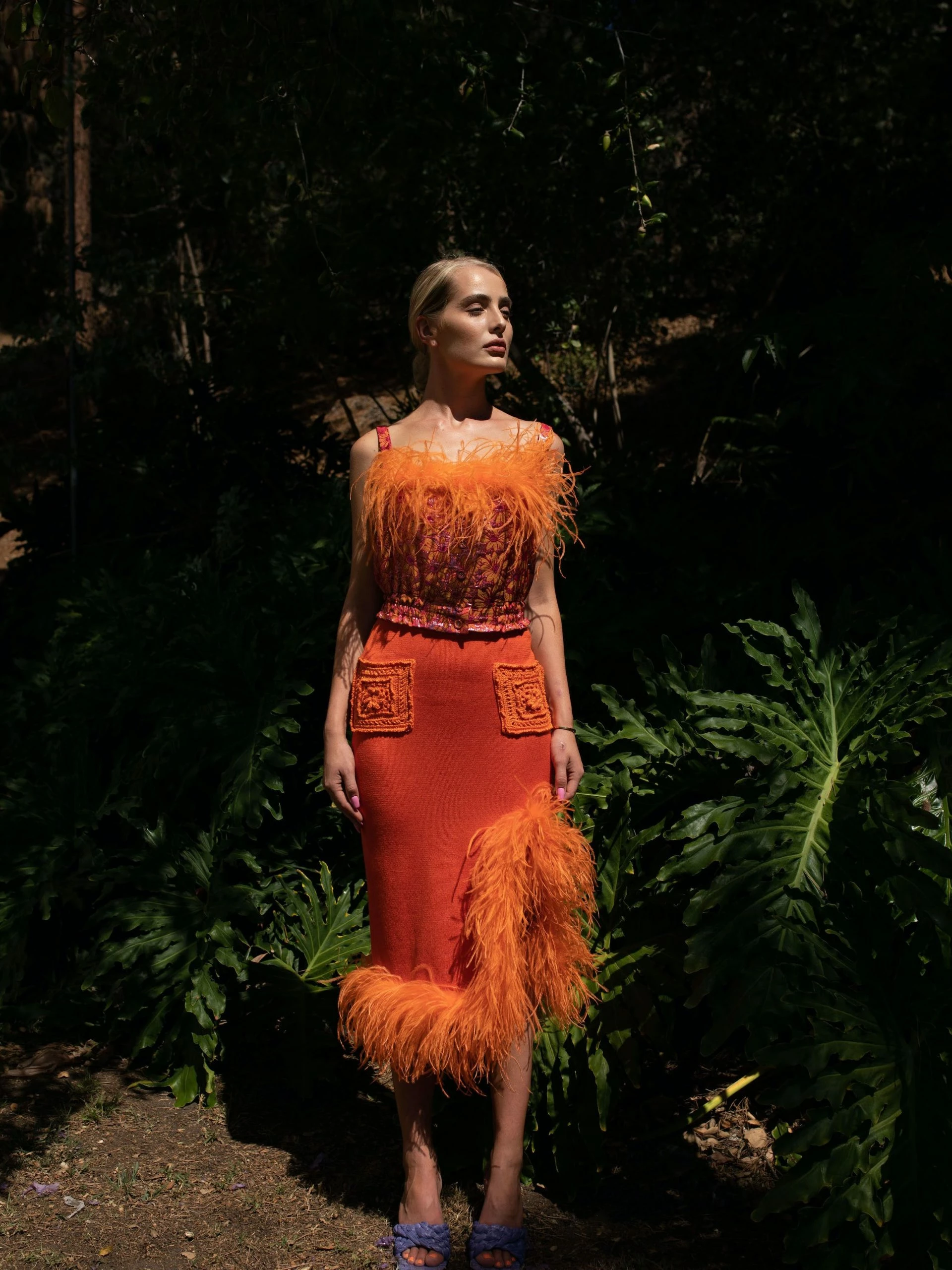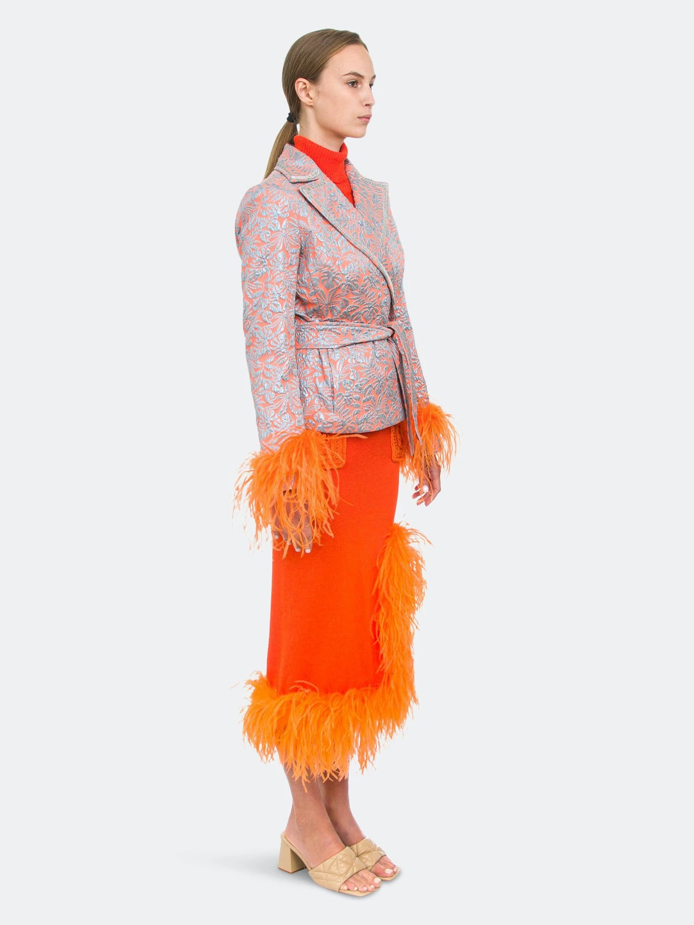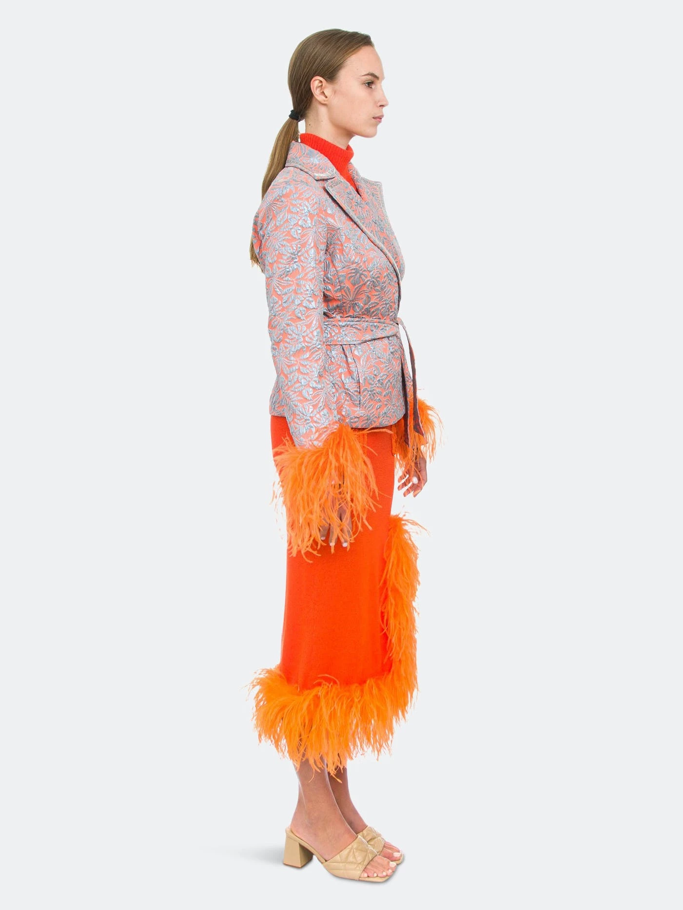Orange Knit Skirt With Feather Details is cut from lightweight high quality knit with a hint of stretch. The skirt has ruffled feather trim and a belted waist. Style the skirt with Handmade Knit Sweater or Jacket and a pair of mules.