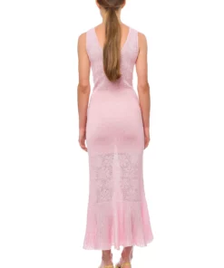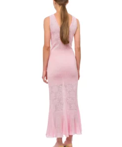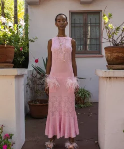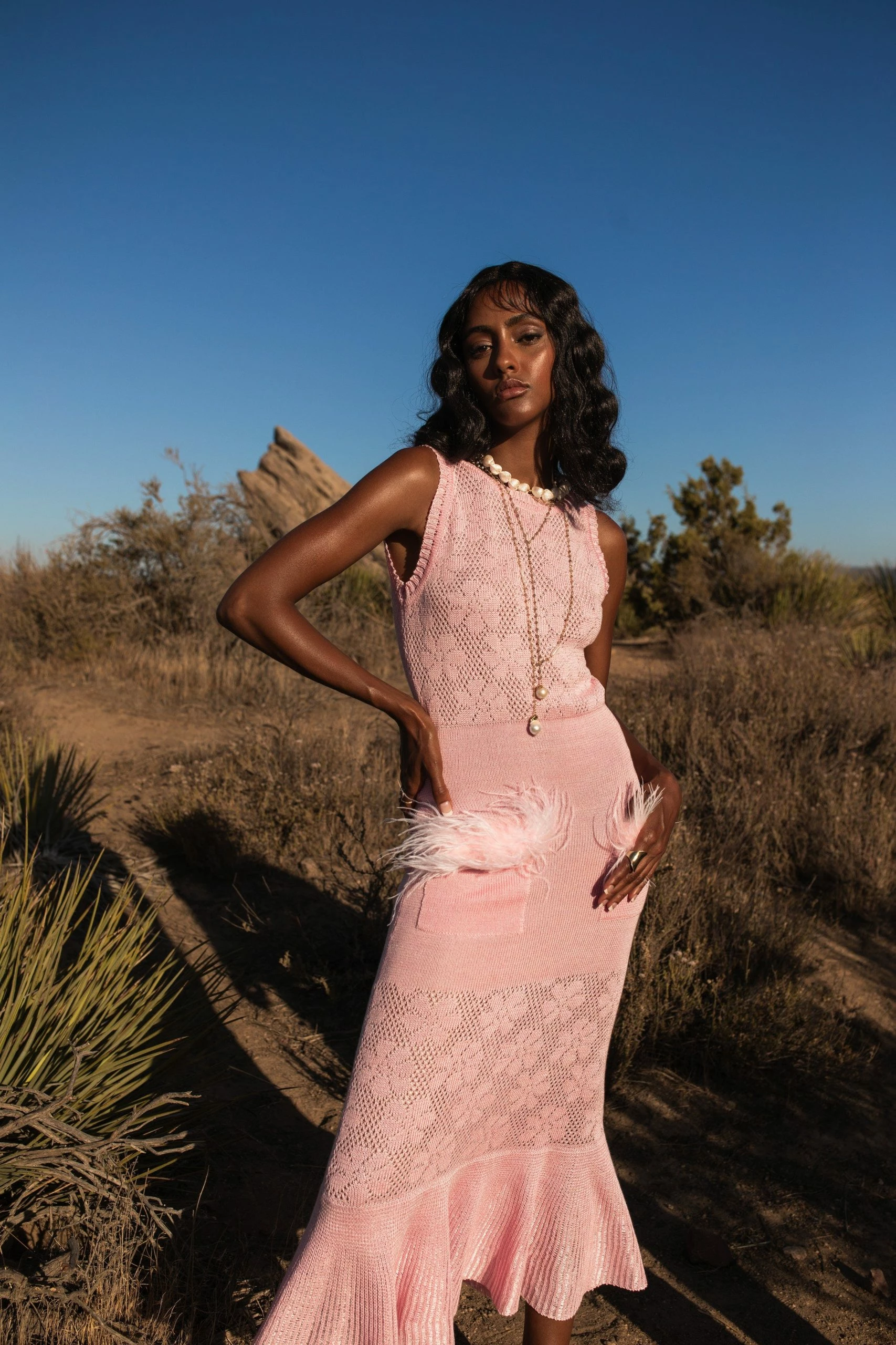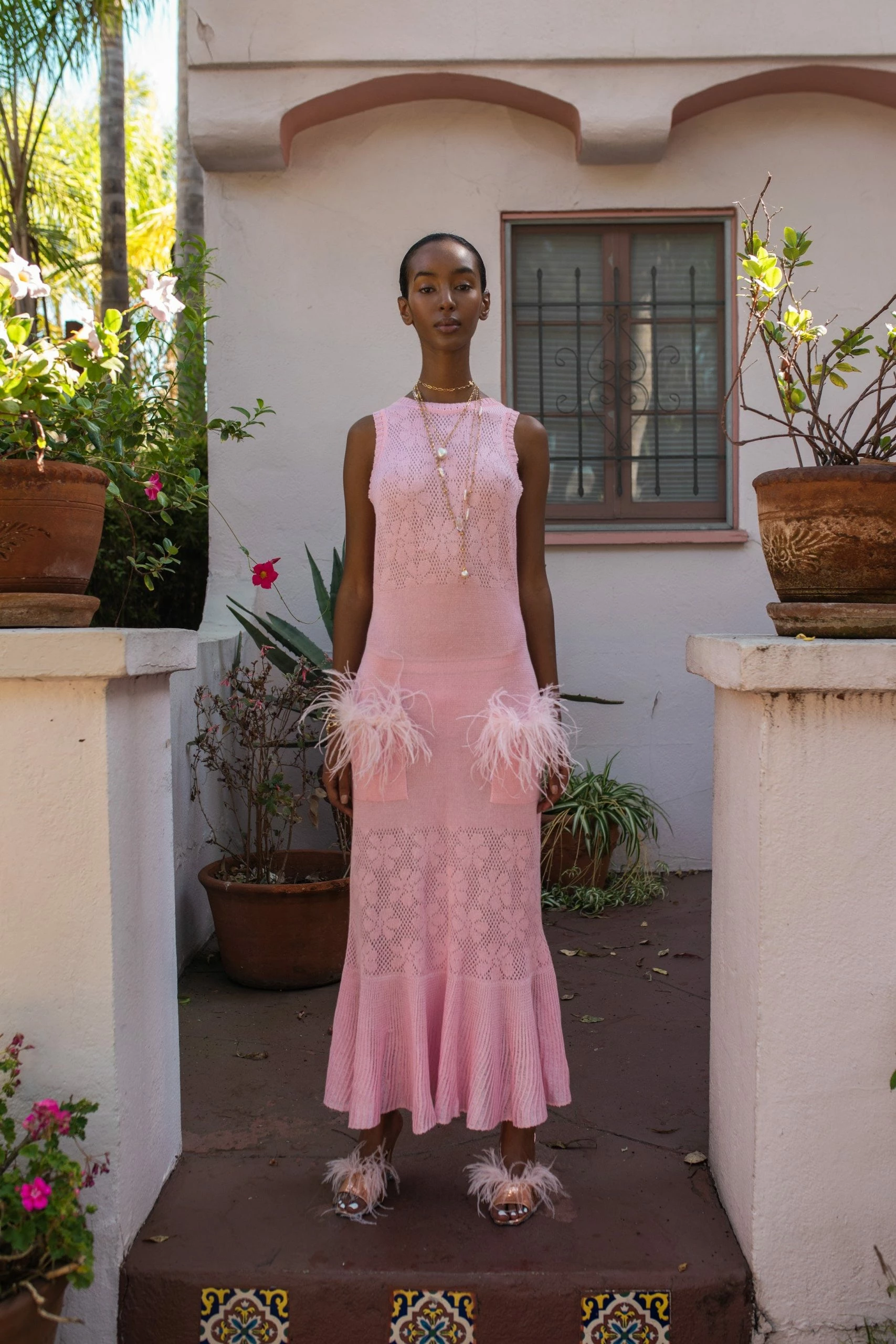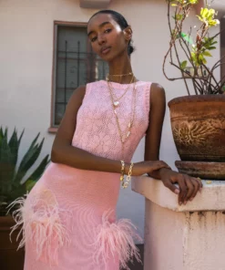 Pink knit dress is designed with a round neck and feathers on the pockets. Perfect fits on the body and create fabulous feminine look. Perfect with sandals, heels and sneaker for any occasion, day or night.