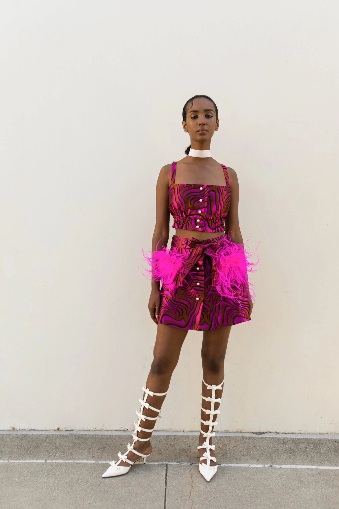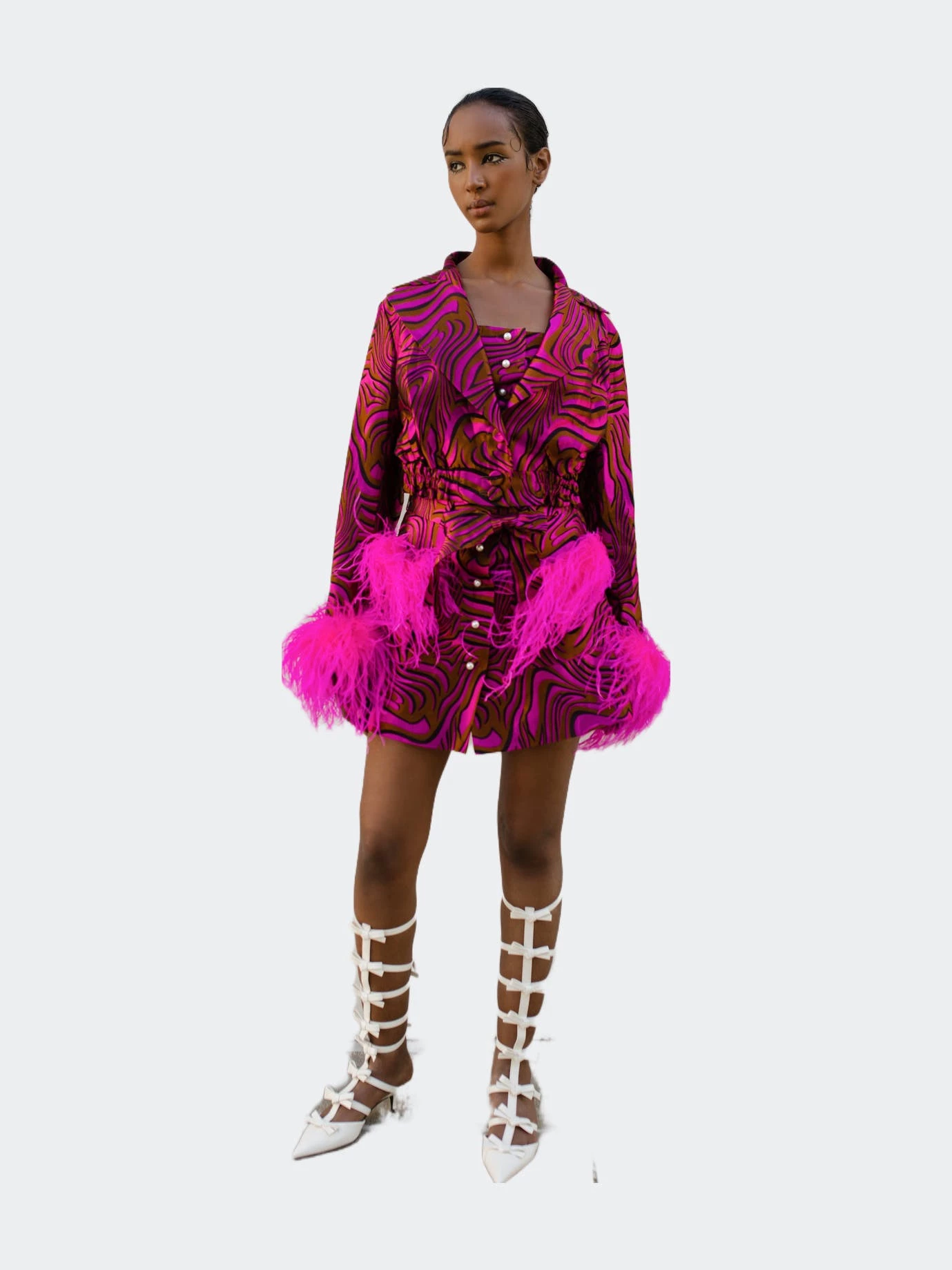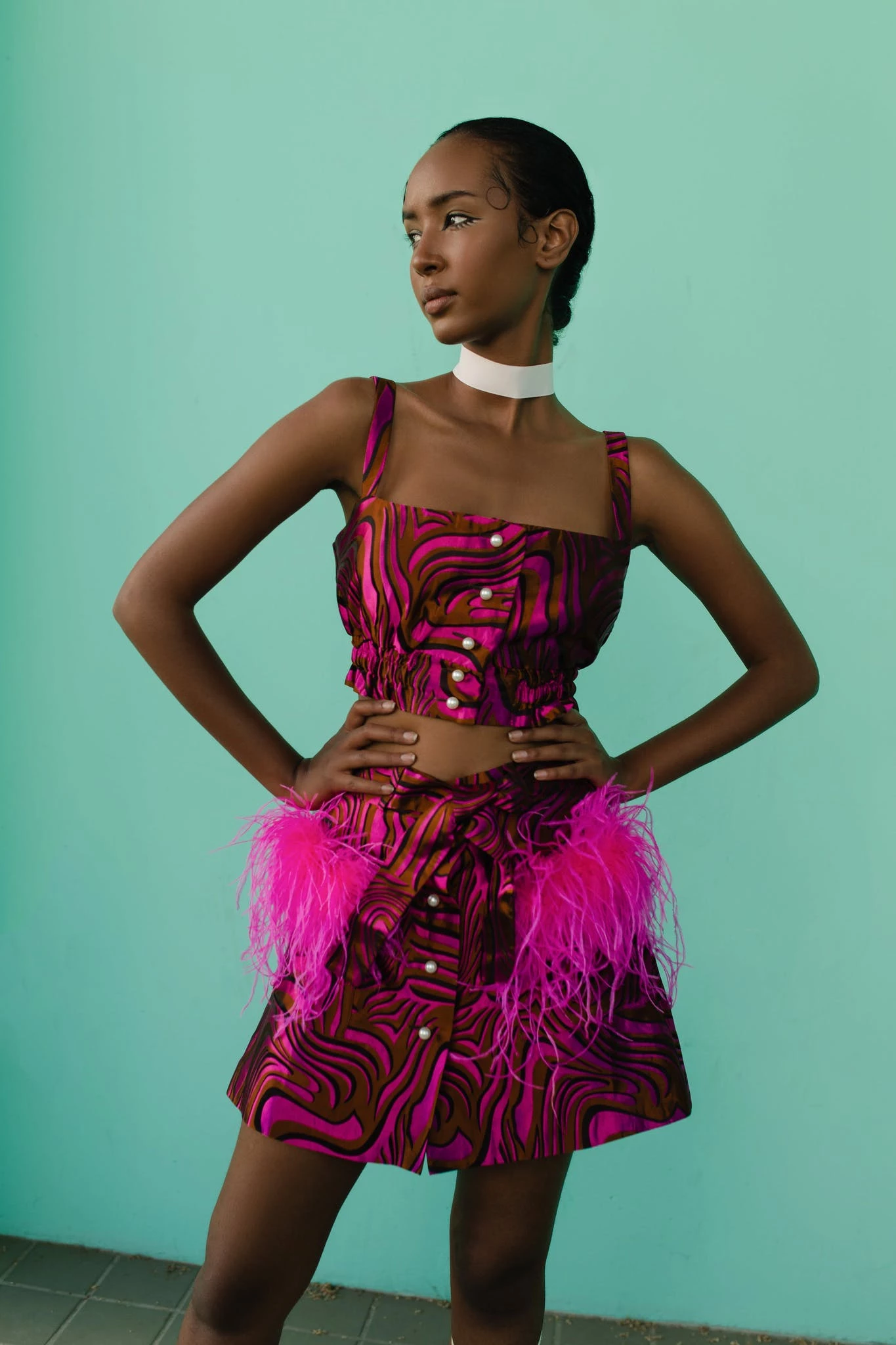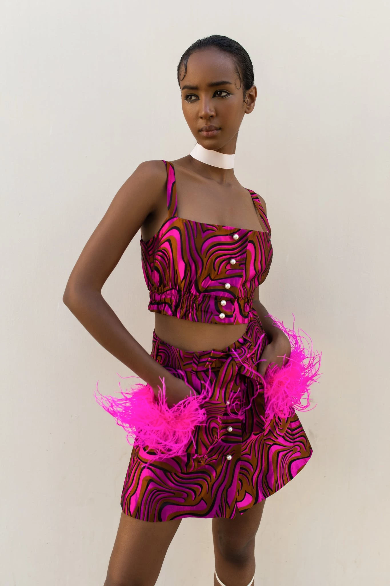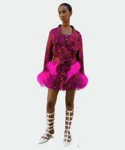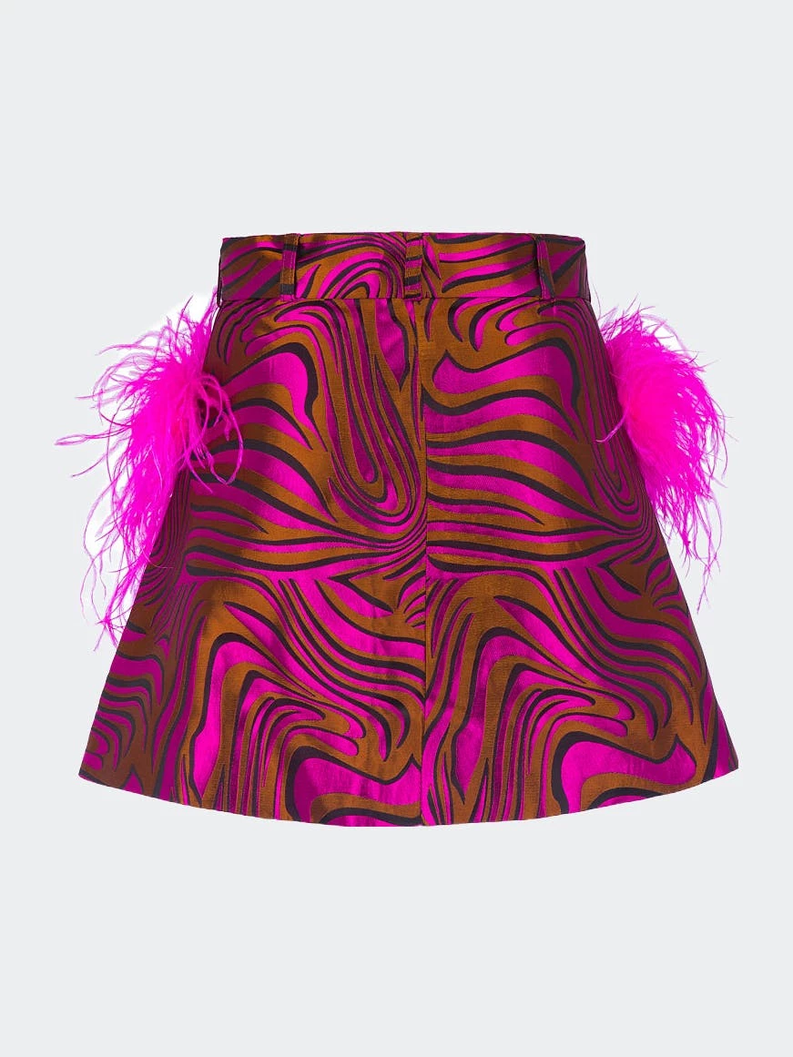 Mint Printed Skirt With Feathers is cut from a lightweight jacquard. The skirt has feather details on the front pockets and pearl buttons on the front. Style yours with Raspberry skirt and a pair of mules.