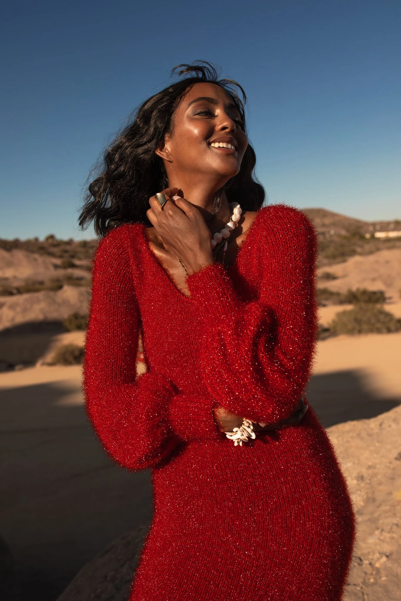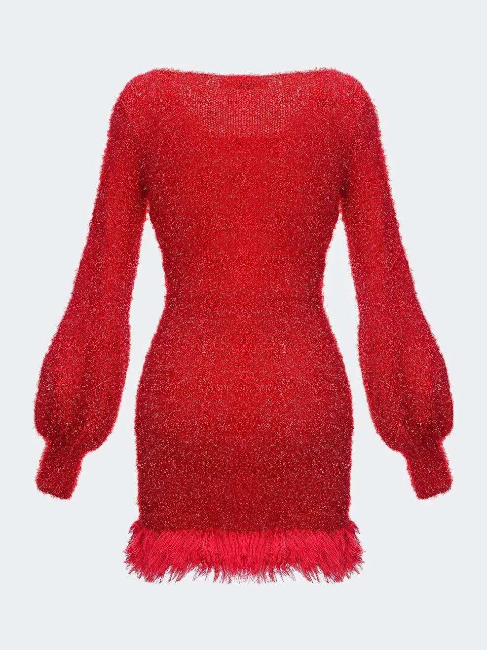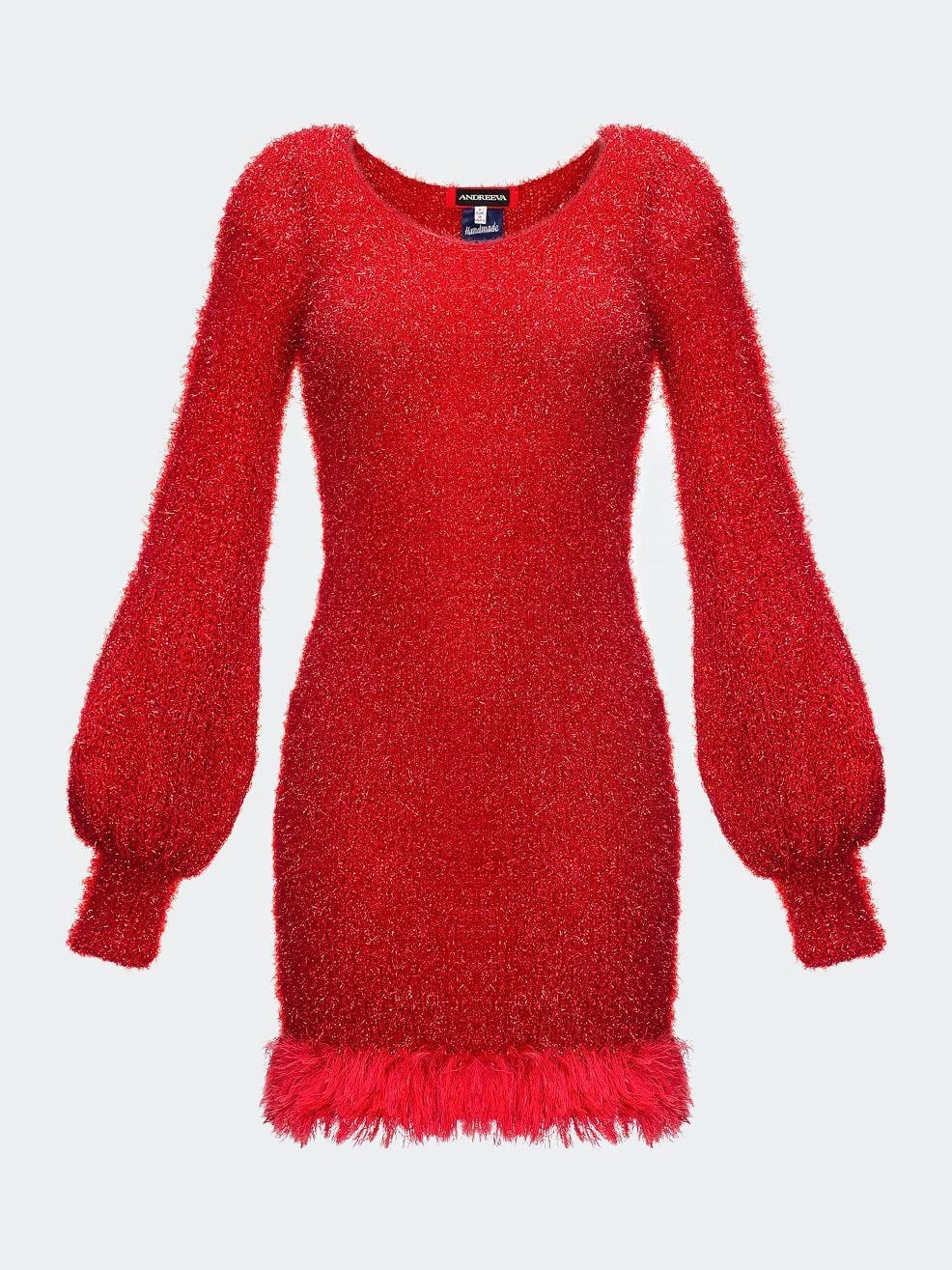 Red Handmade Knit Dress With Glitter is a spun from viscose and silk. The dress creates feminine silhouette and perfect for cocktail or event.