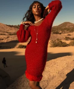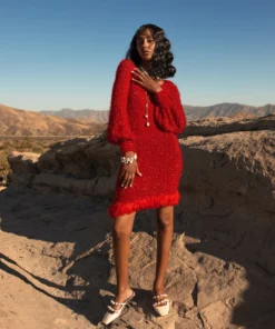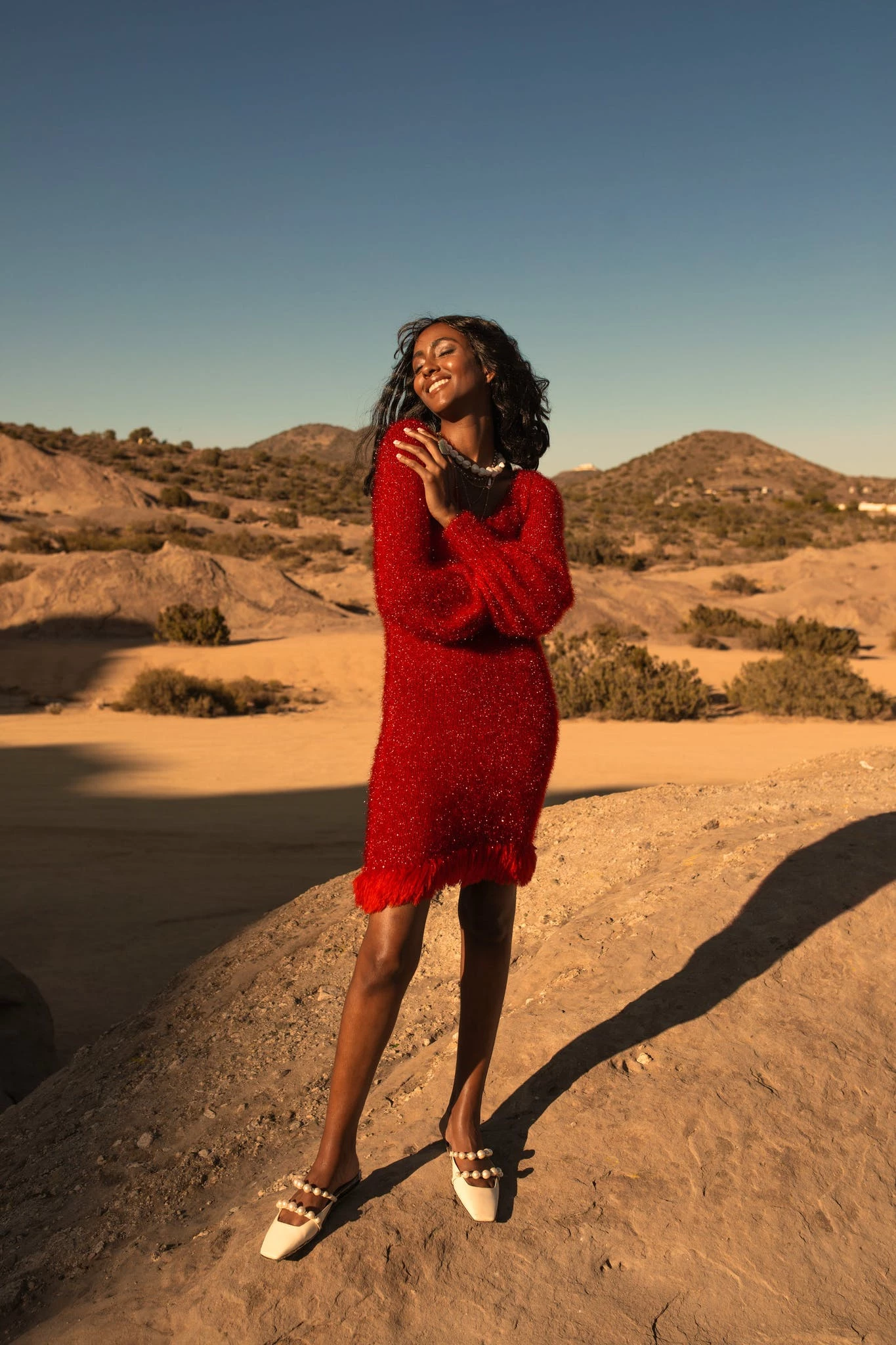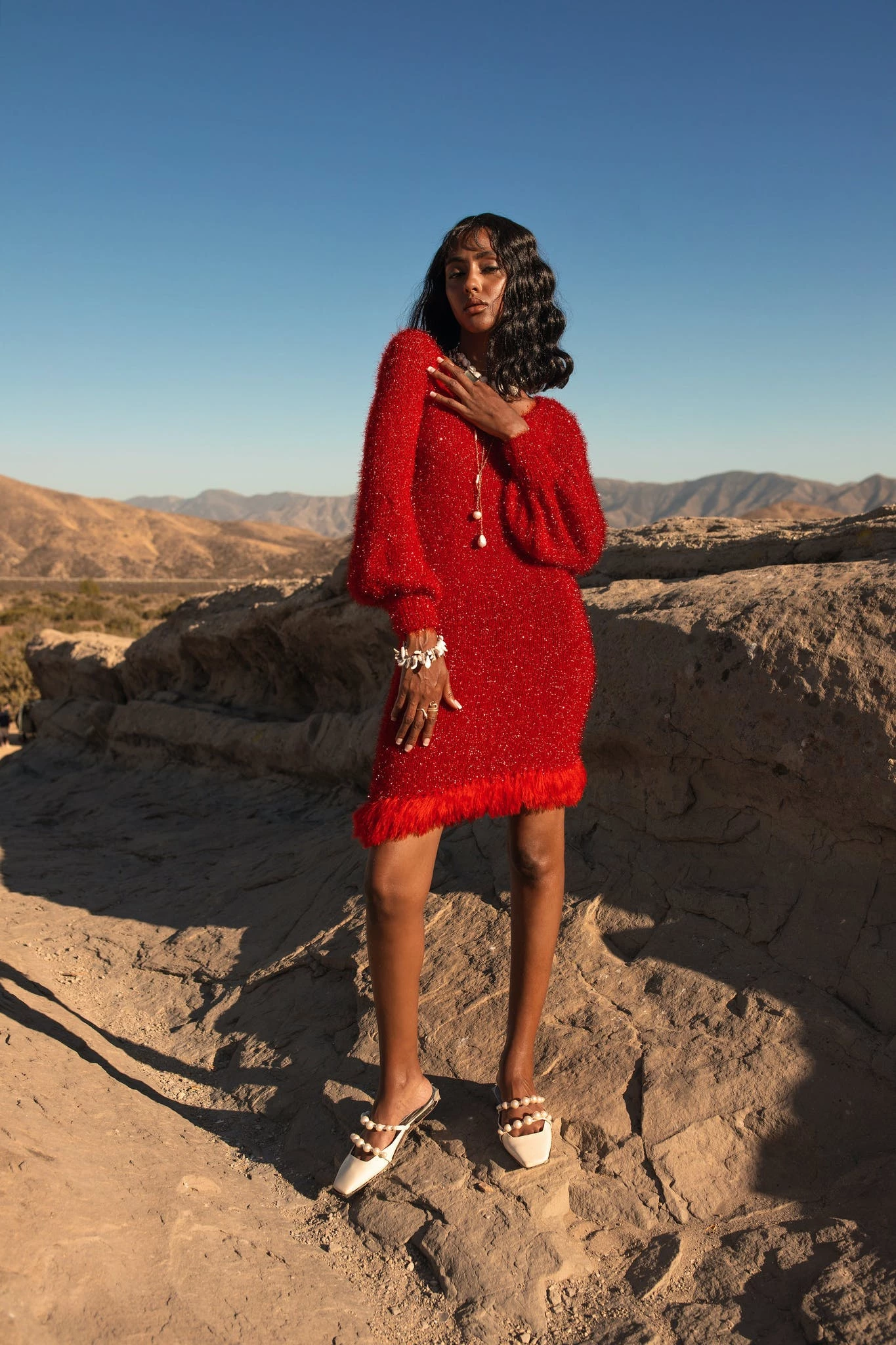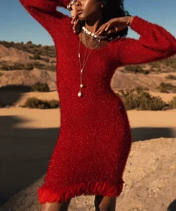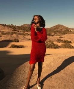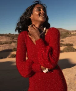 Red Handmade Knit Dress With Glitter is a spun from viscose and silk. The dress creates feminine silhouette and perfect for cocktail or event.