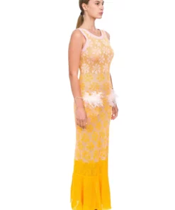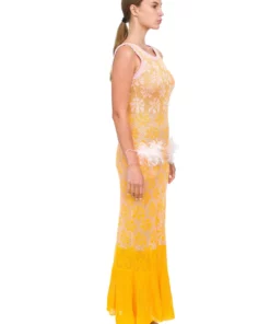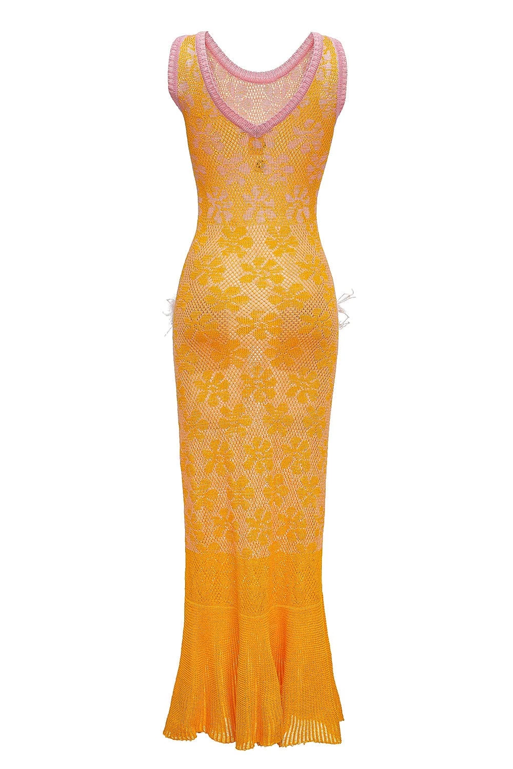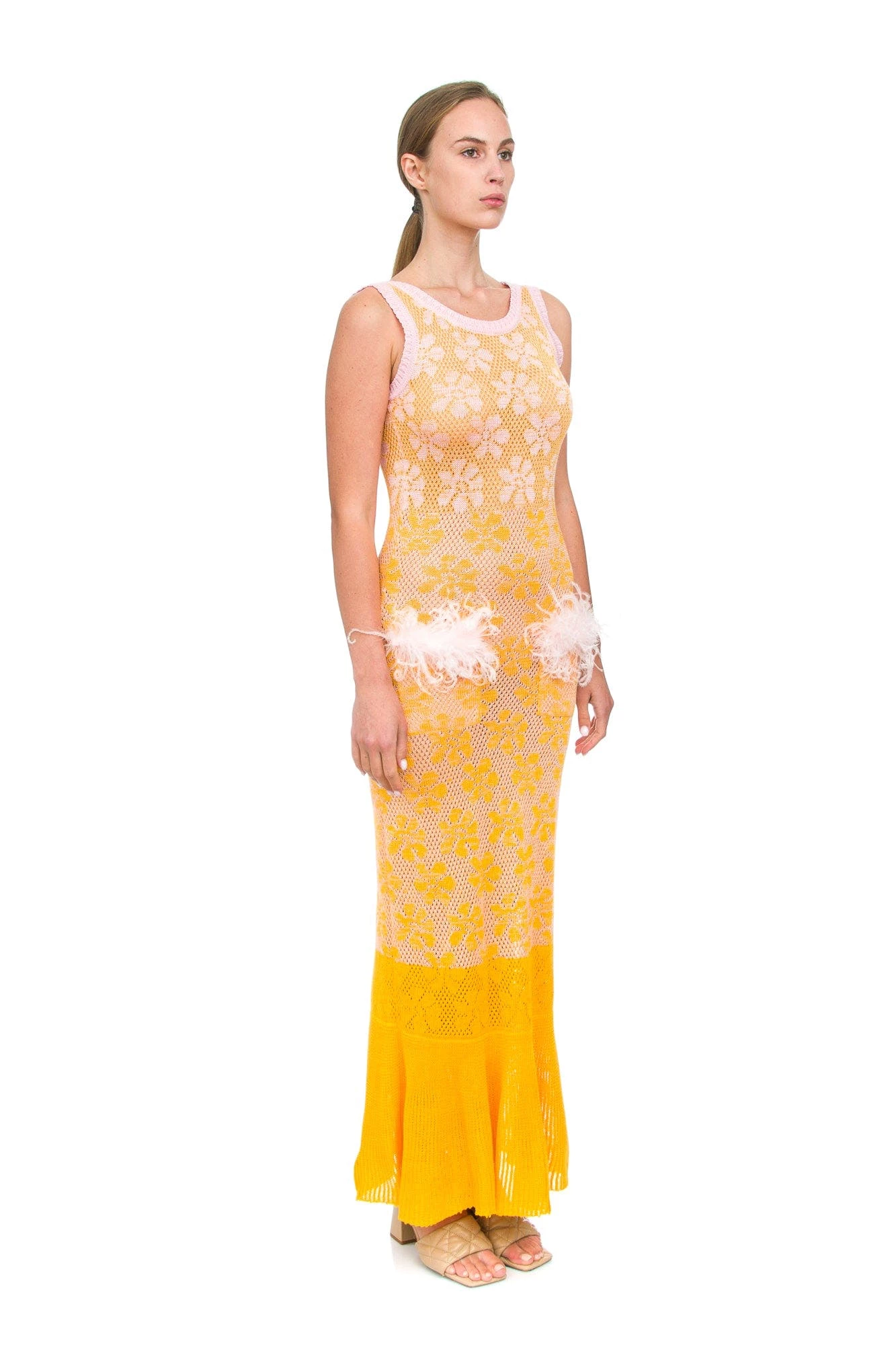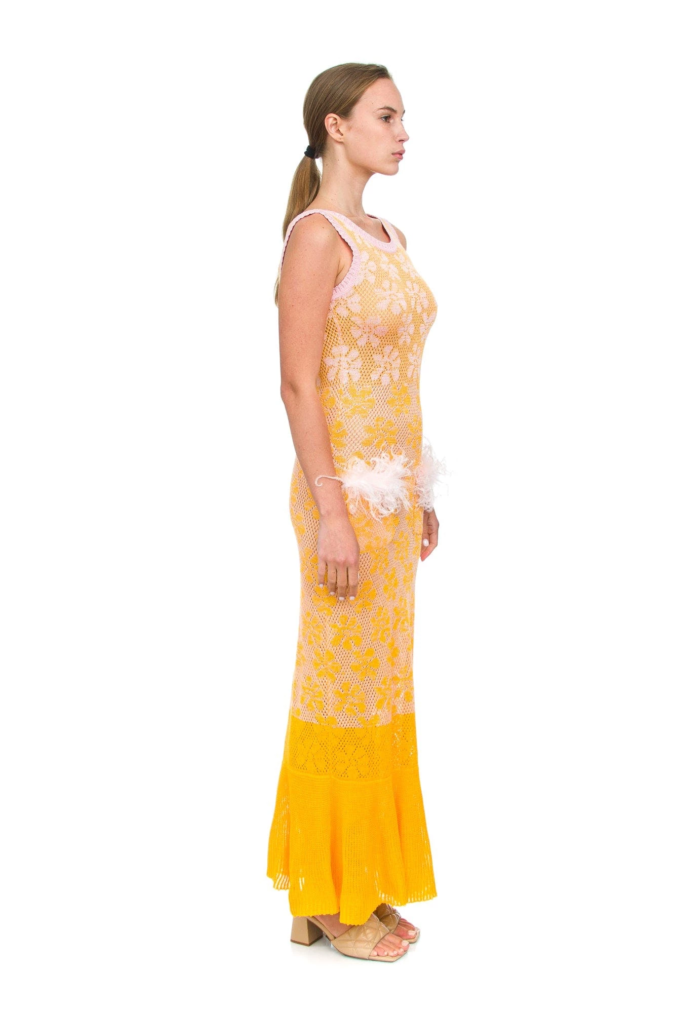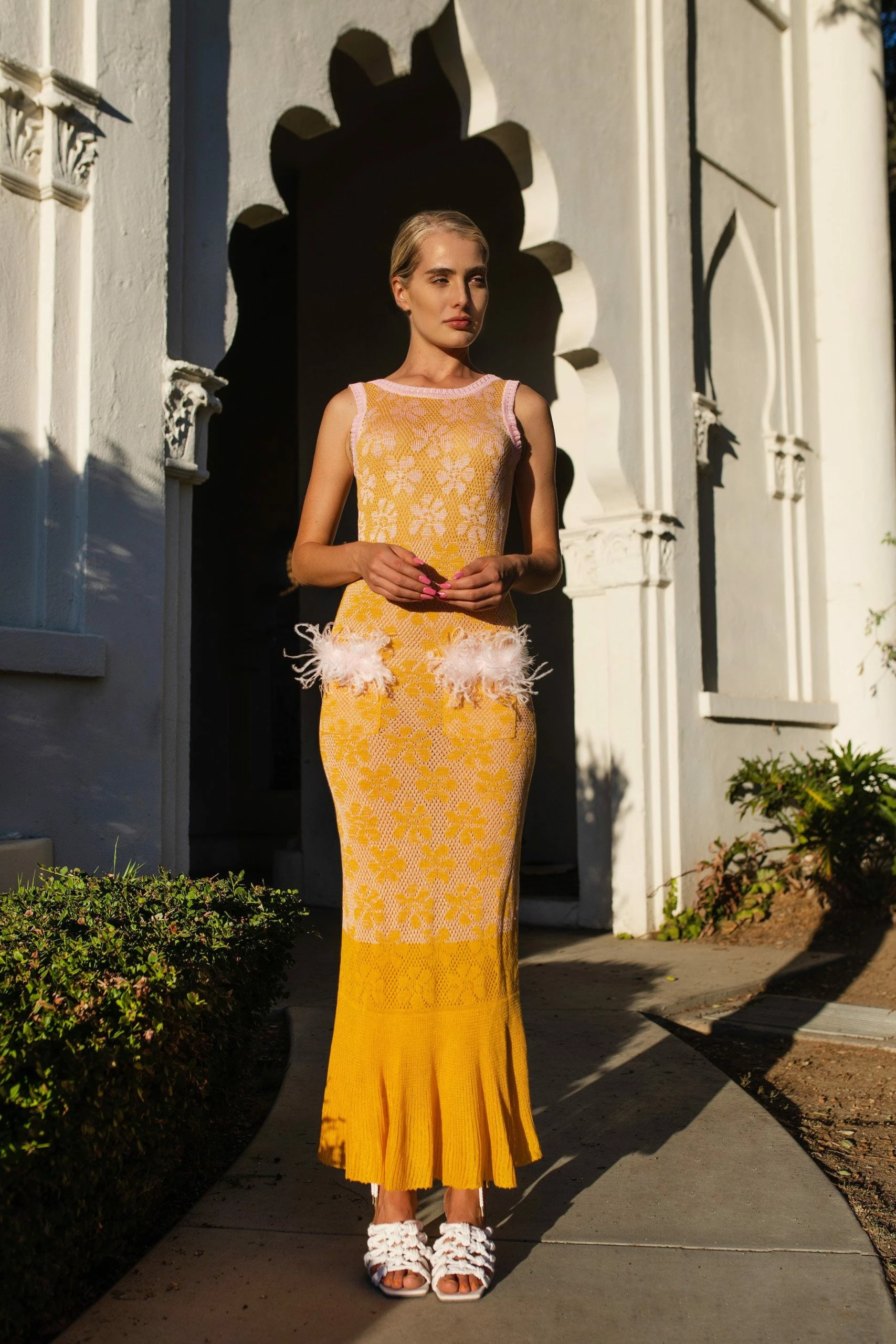 Yellow knit dress is designed with a round neck and feathers on the pockets. Perfect fits on the body and create fabulous feminine look. Perfect with sandals, heels and sneaker for any occasion, day or night.
