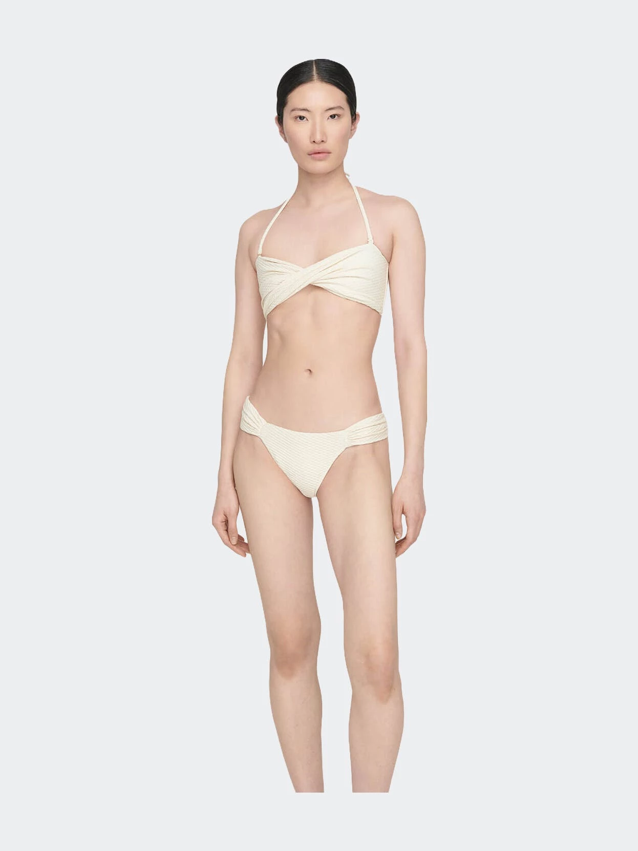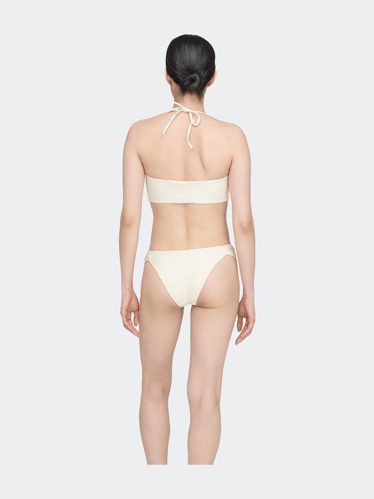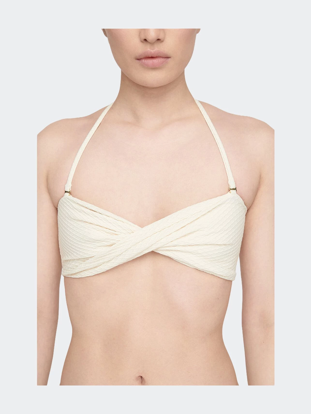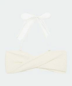 The Rosa bikini top is a bandeau-style swim separate designed with flattering twist-front detailing at the bust and structured boning at the side seams. Constructed from a fully-lined recycled nylon-spandex blend elevated with honeycomb-inspired surface texture. Pair the Rosa bikini top with the coordinating riza bikini bottom to complete the look.