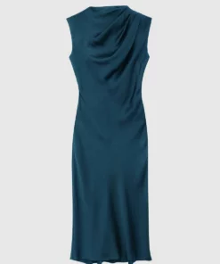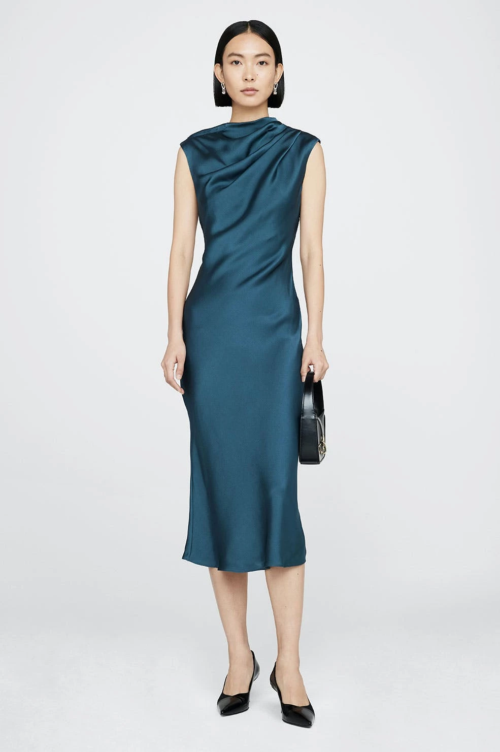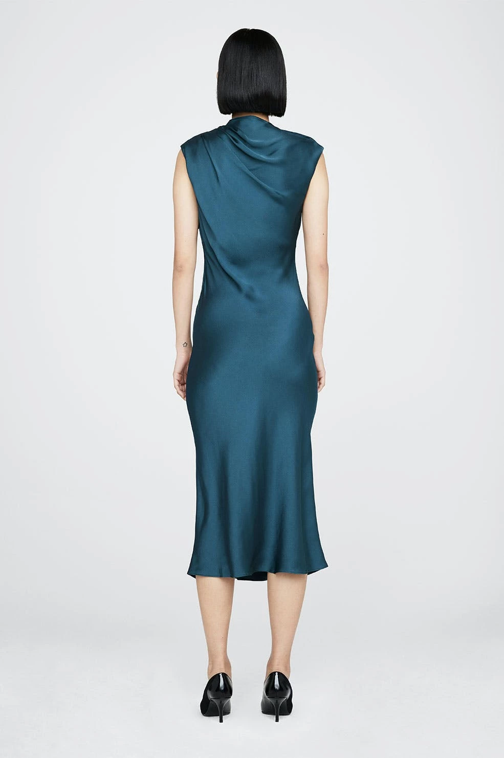 The Samantha Dress is crafted in 100% silk, cut on the bias with elegant asymmetrical draping across the neck and shoulders. Features a discrete snap closure at the shoulder with a relaxed, midi-length hemline.