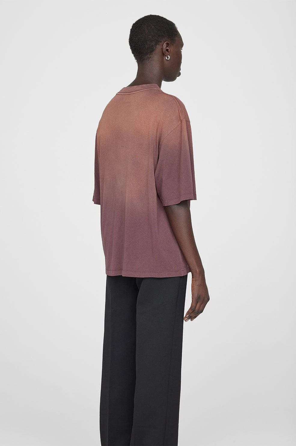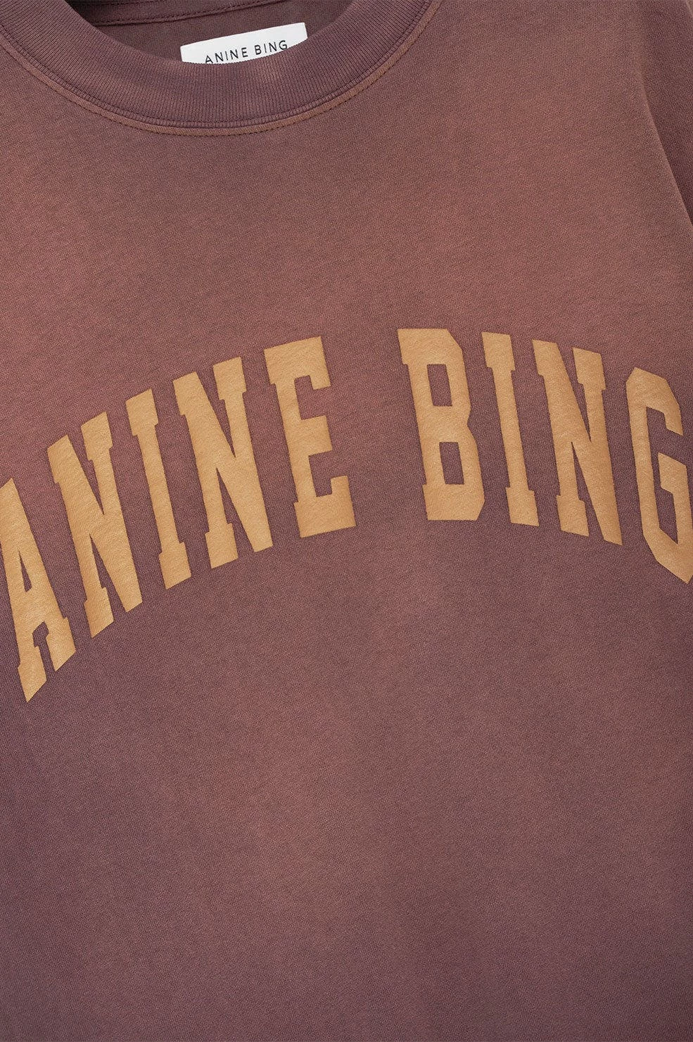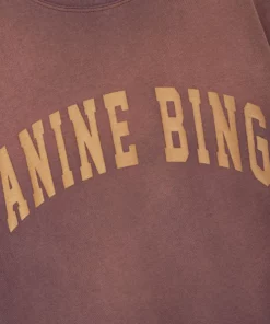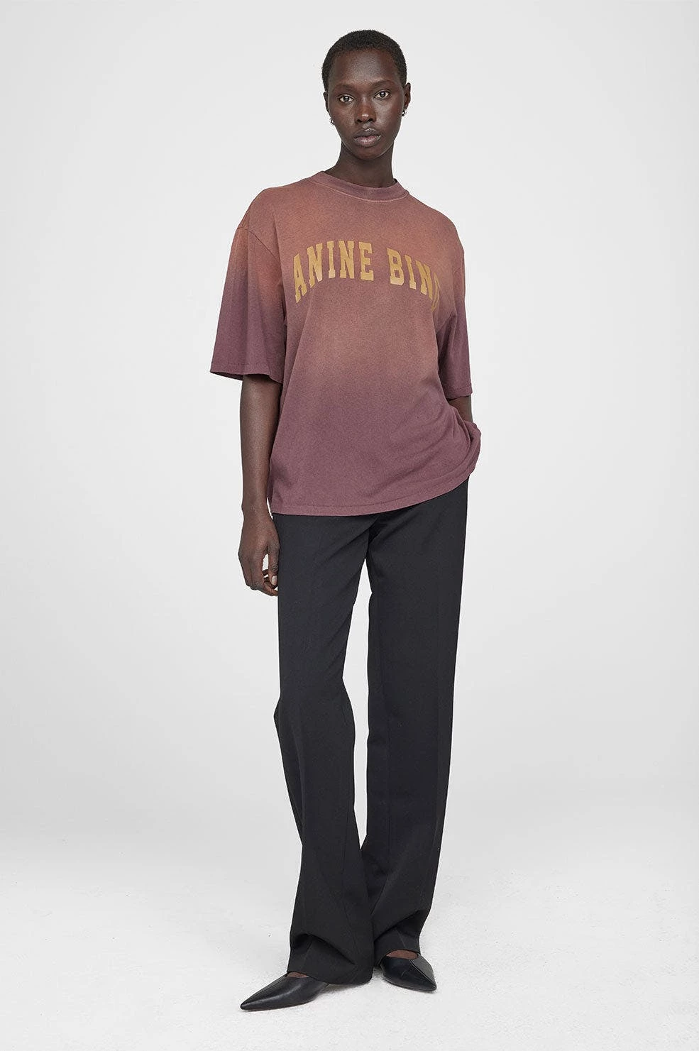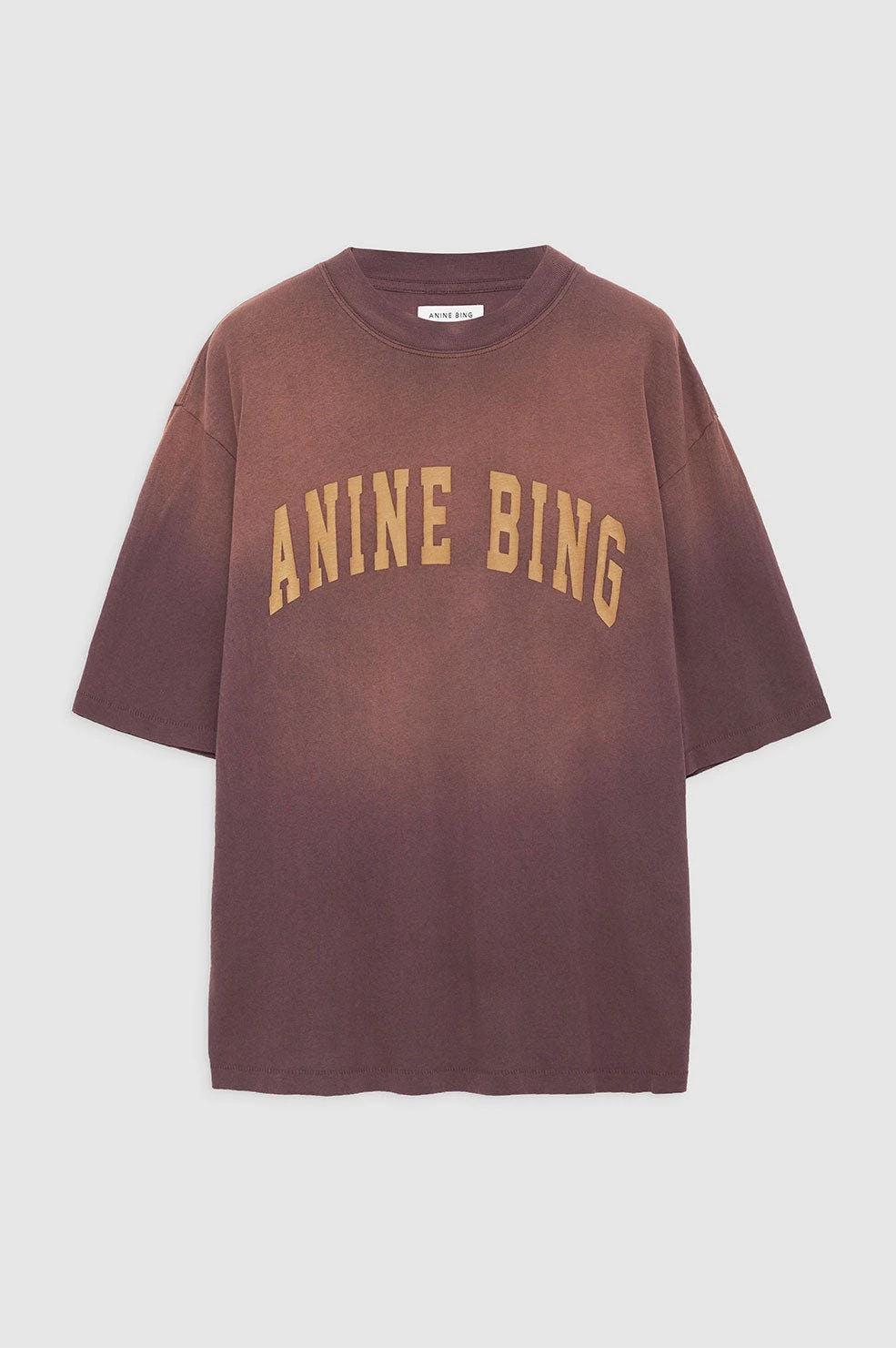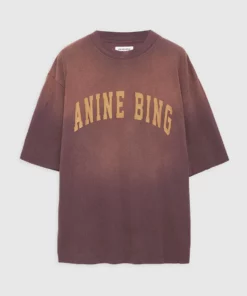 The Avi Tee Anine Bing is an oversized, boxy t-shirt constructed from lightweight cotton jersey in a sun-faded burgundy ombre wash. It features a screen printed Anine Bing graphic in gold collegiate-inspired lettering at the chest. The Avi Tee is cut for a boxy, oversized fit with a slightly longer body and slimmer neckline than the Wes Tee.
