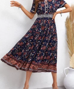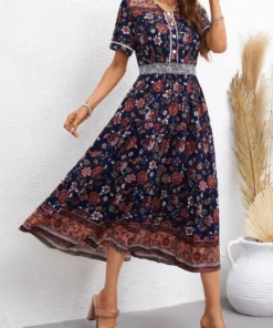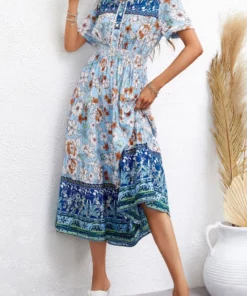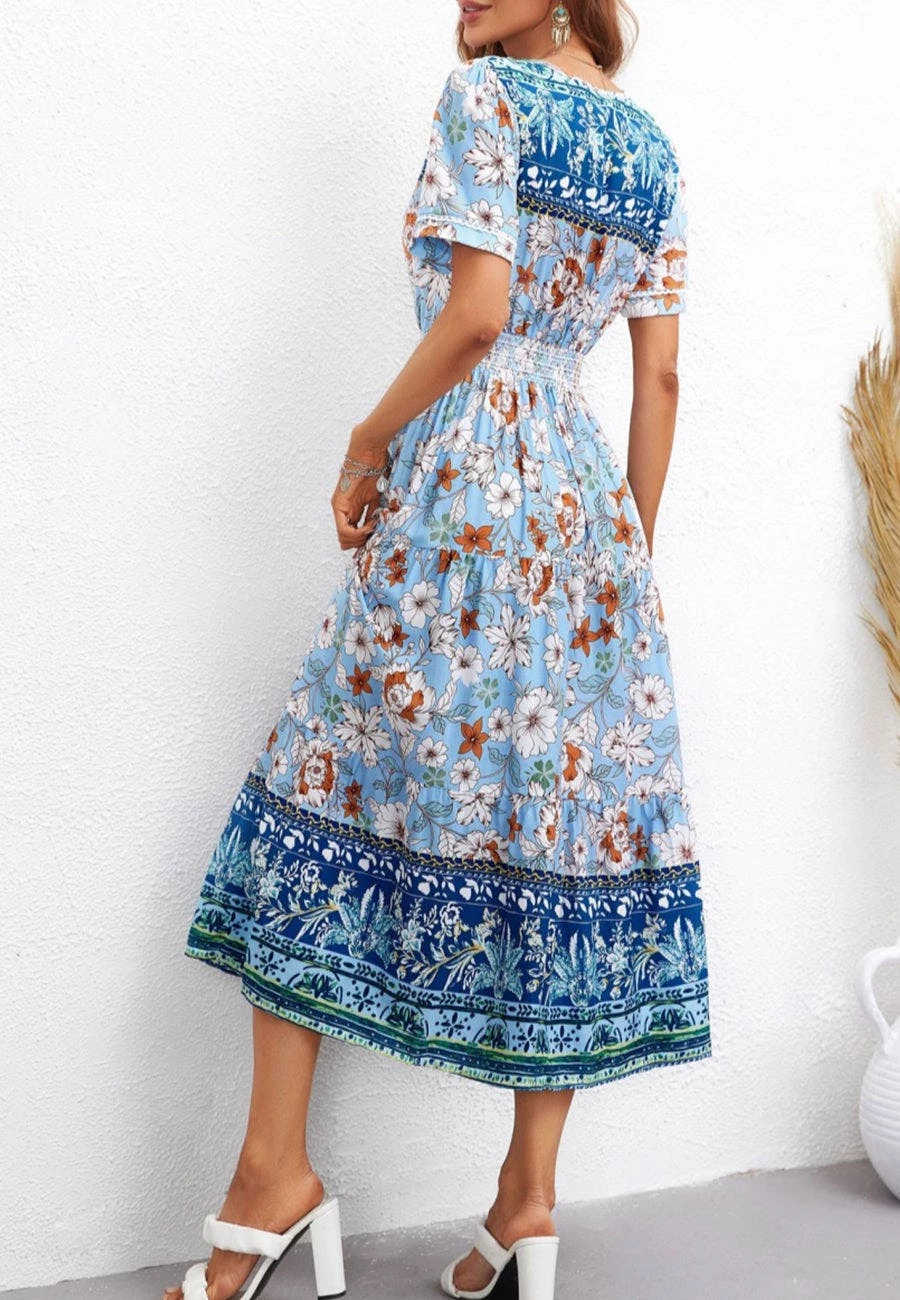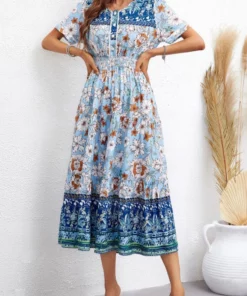 The Anna-Kaci dress is detailed with beautiful bohemian prints. Features a round neck line, button front design, short sleeves, flowy skirt, and mid-calf length. Pair it with a sun hat and sandals for an amazing look.
