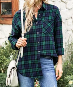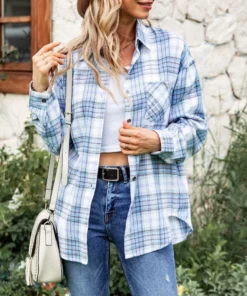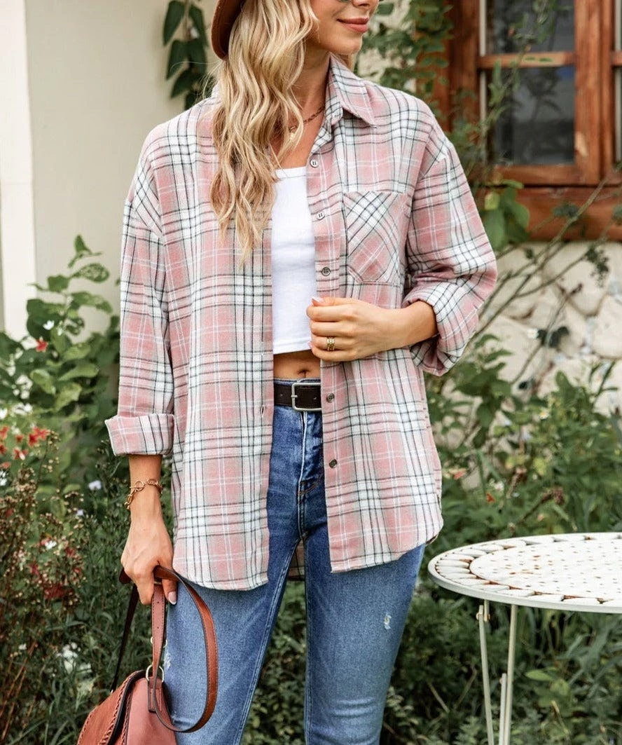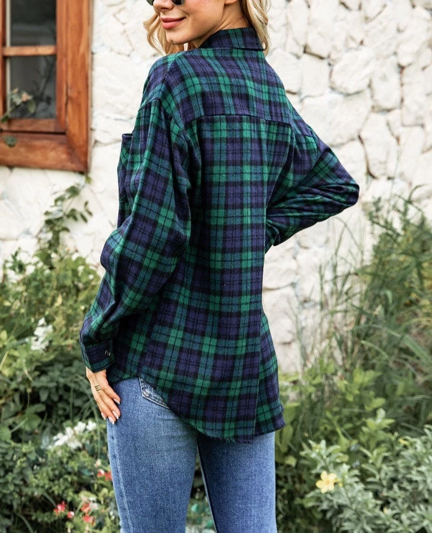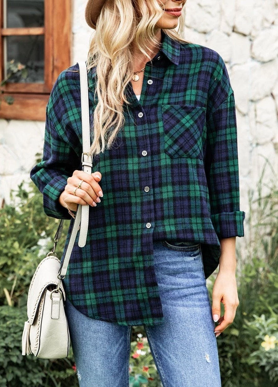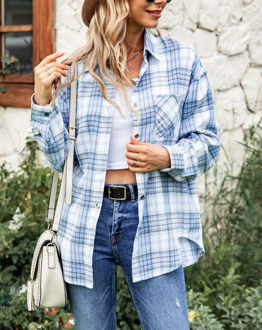 The Anna-Kaci shirt is detailed with a classic checkered print. Features a collar, button down closure, patch pocket, long sleeves, and regular fit. Layer it over a crop top and jeans for an elevated look.