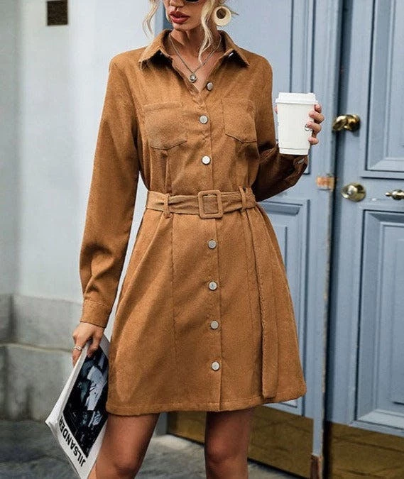 The Anna-Kaci dress is detailed with a classic button down front. Features solid color, collar, long sleeves, a-line silhouette, and above knee length. Pair it with a fedora hat and boots for a cool look.