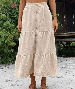 The Anna-Kaci skirt is detailed with a gorgeous tiered design. Features a high waist, button down detail, a-line silhouette, and mid-calf length. Pair it with a white cropped top and espadrilles for a cute summer look.
