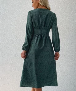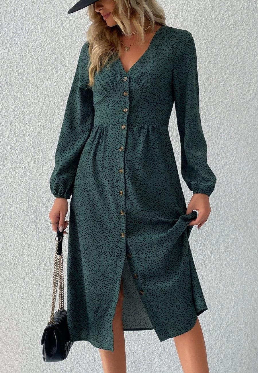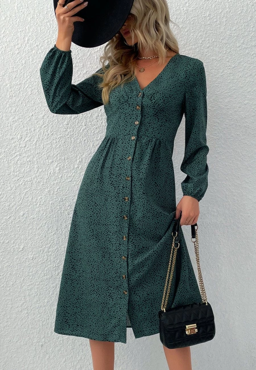 The Anna-Kaci dress is detailed with a bold cheetah print. Features a v neck line, long sleeves, button down design, flowy skirt, and below knee length. Pair it with black sunnies and pointed heels for a cool look.