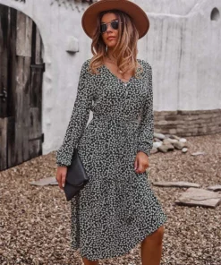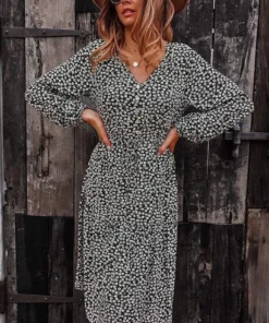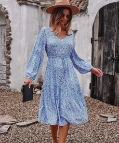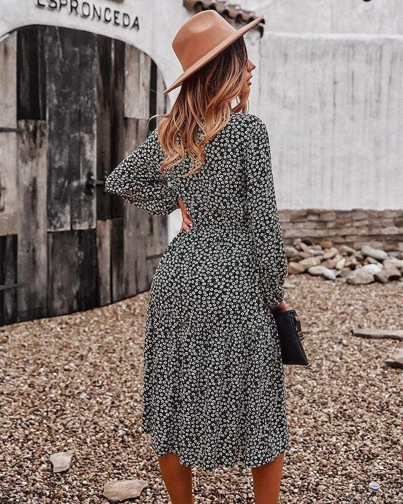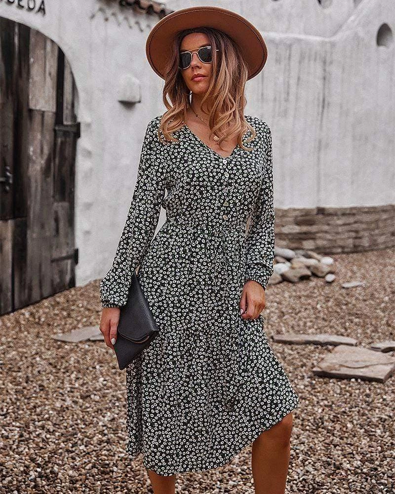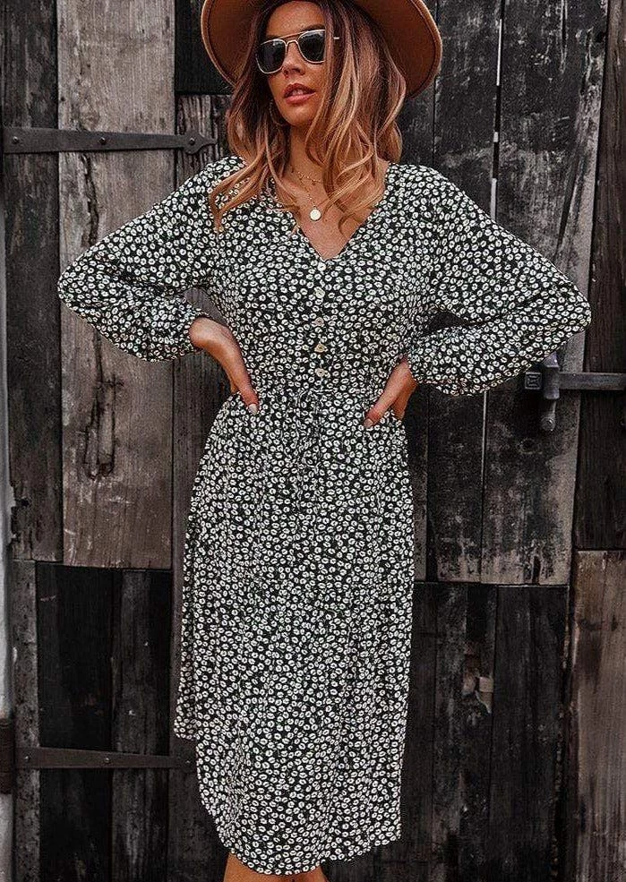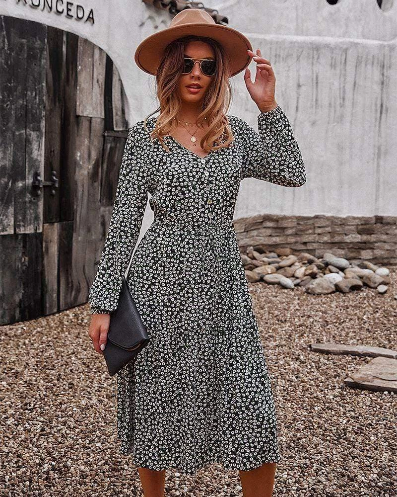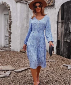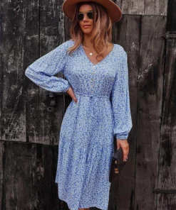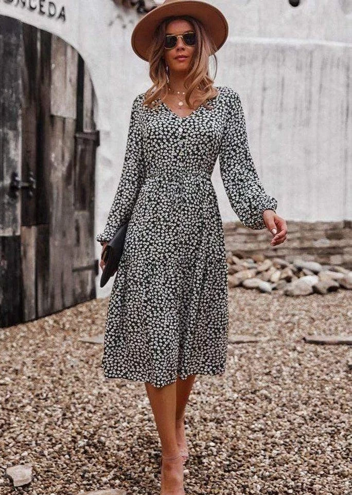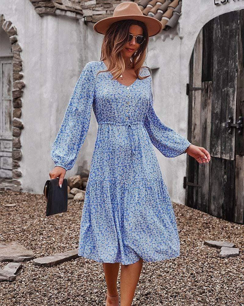 The Anna-Kaci light dress is detailed with dainty floral prints. Features a v neck line, long sleeves, half button down front, tie waist, tiered skirt, a-line silhouette, and knee length. Pair it with block heels and sunnies for a refreshing fall look.