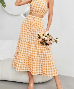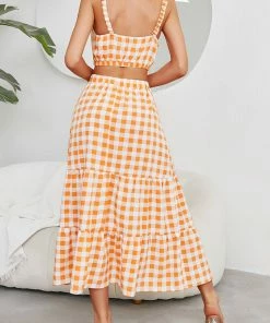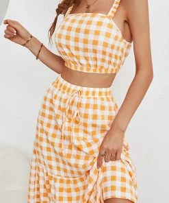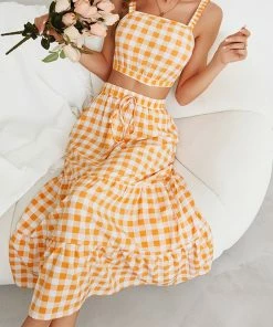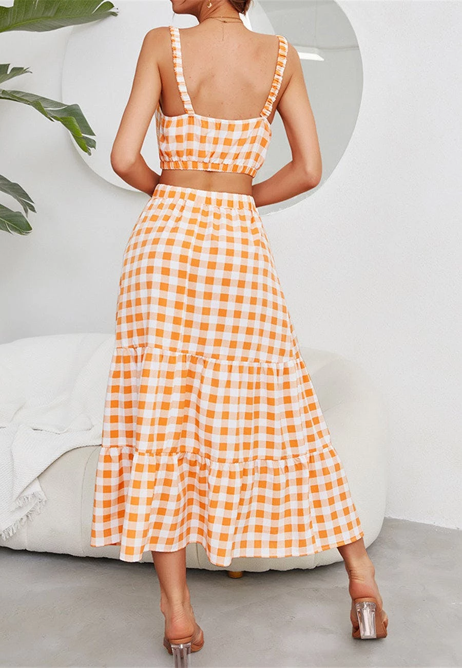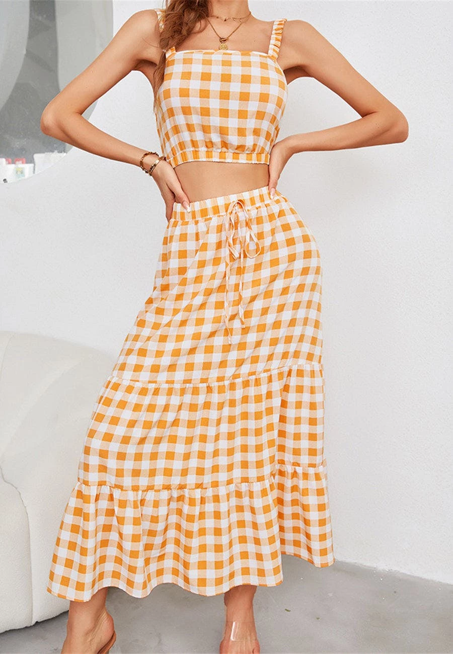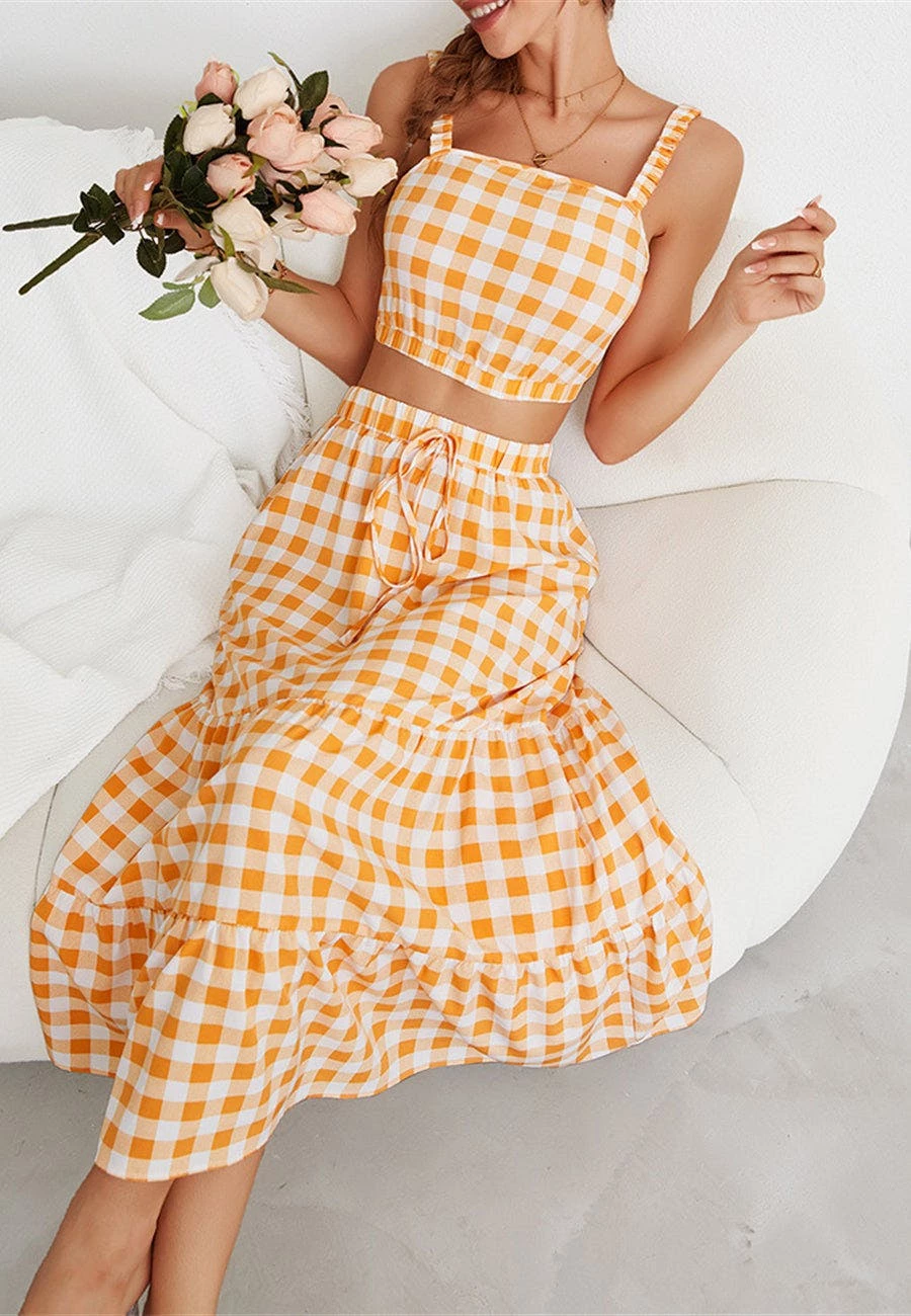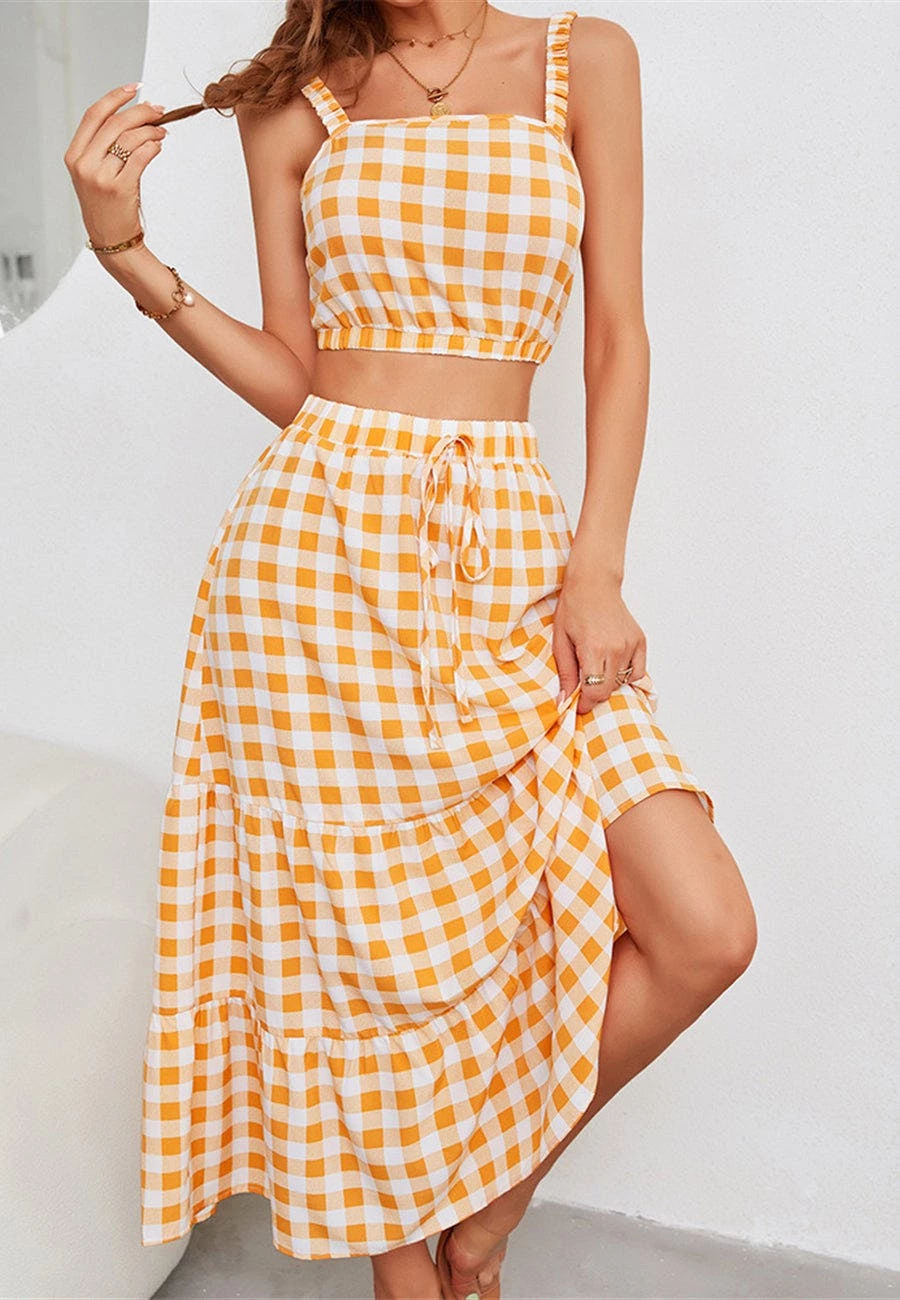 The Anna-Kaci coordinates are detailed with a classic gingham print. Pair it together with sandals and a tote bag for a fun summer look.