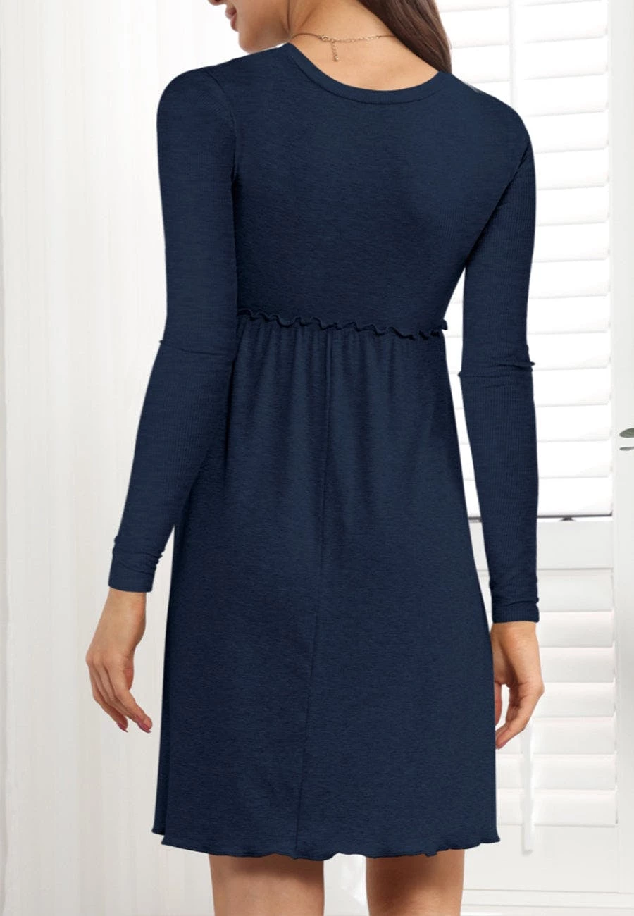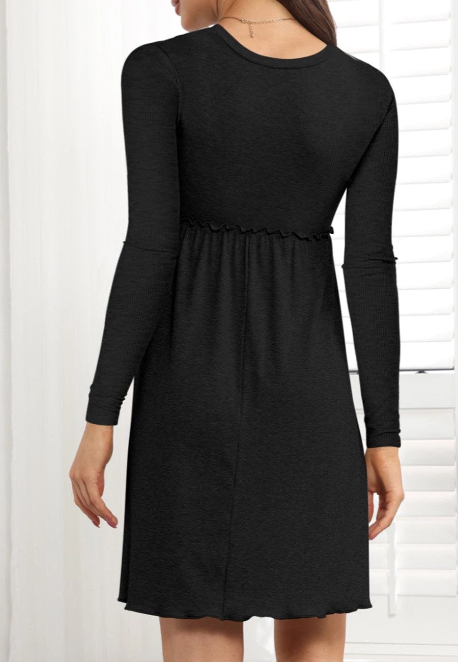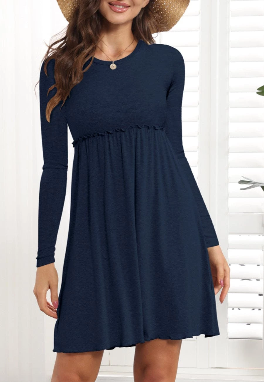 The Anna-Kaci Dress is detailed with a cute lettuce trim. Features a round neck line, empire style, long sleeves, flowy skirt, and above knee length. Pair it with knee-high boots and a bucket hat for a cool look.