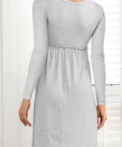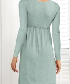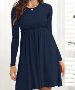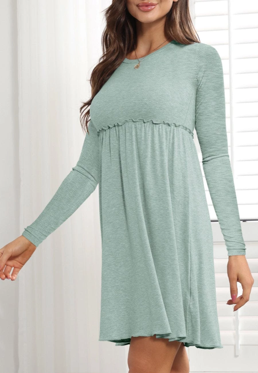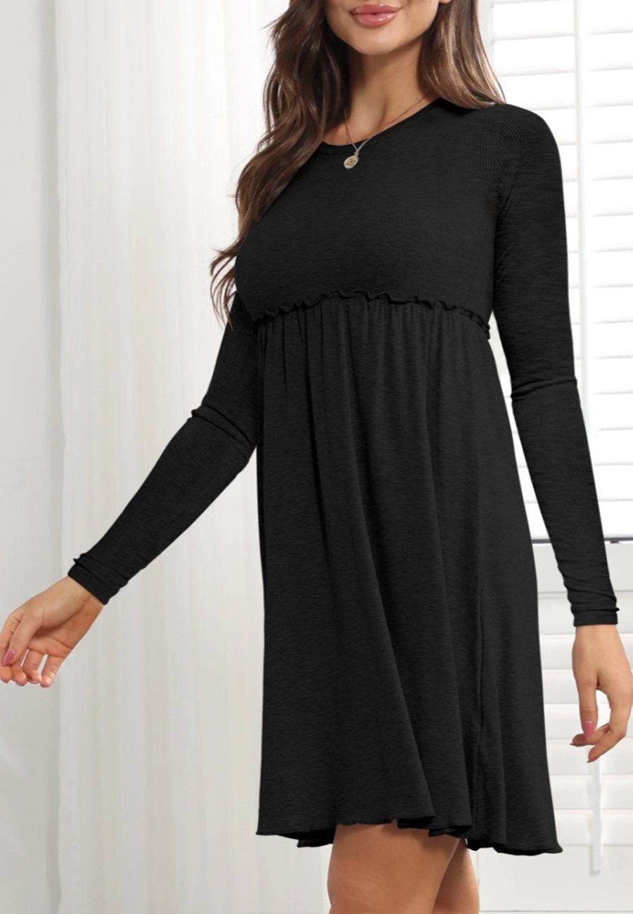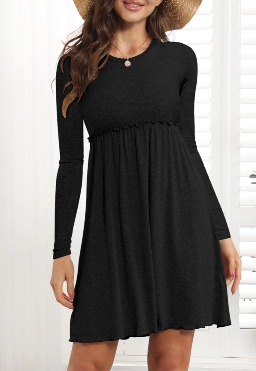 The Anna-Kaci Dress is detailed with a cute lettuce trim. Features a round neck line, empire style, long sleeves, flowy skirt, and above knee length. Pair it with knee-high boots and a bucket hat for a cool look.