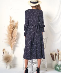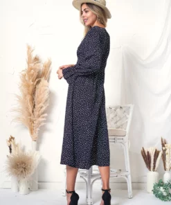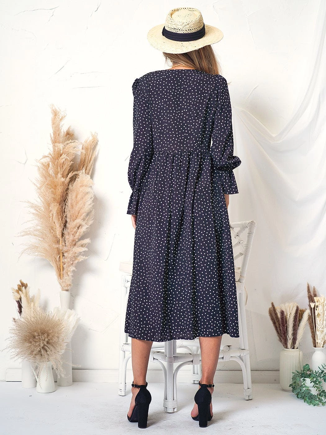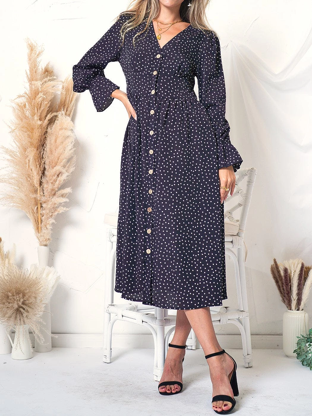 The Anna-Kaci dress is detailed with classic polka dot prints. Features a v neck line, contrast button down design, long sleeves, flowy skirt, and below knee length.
