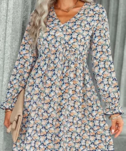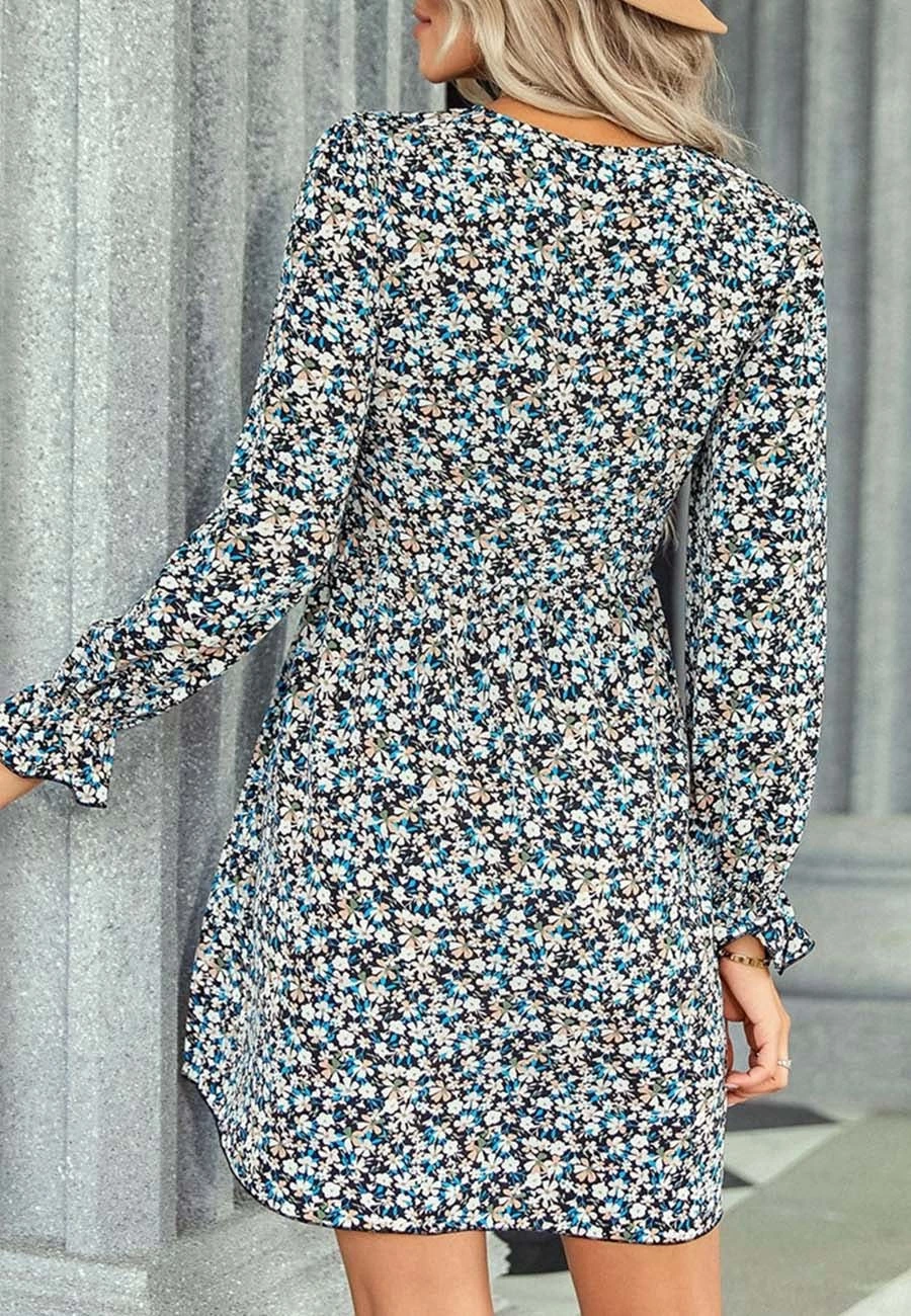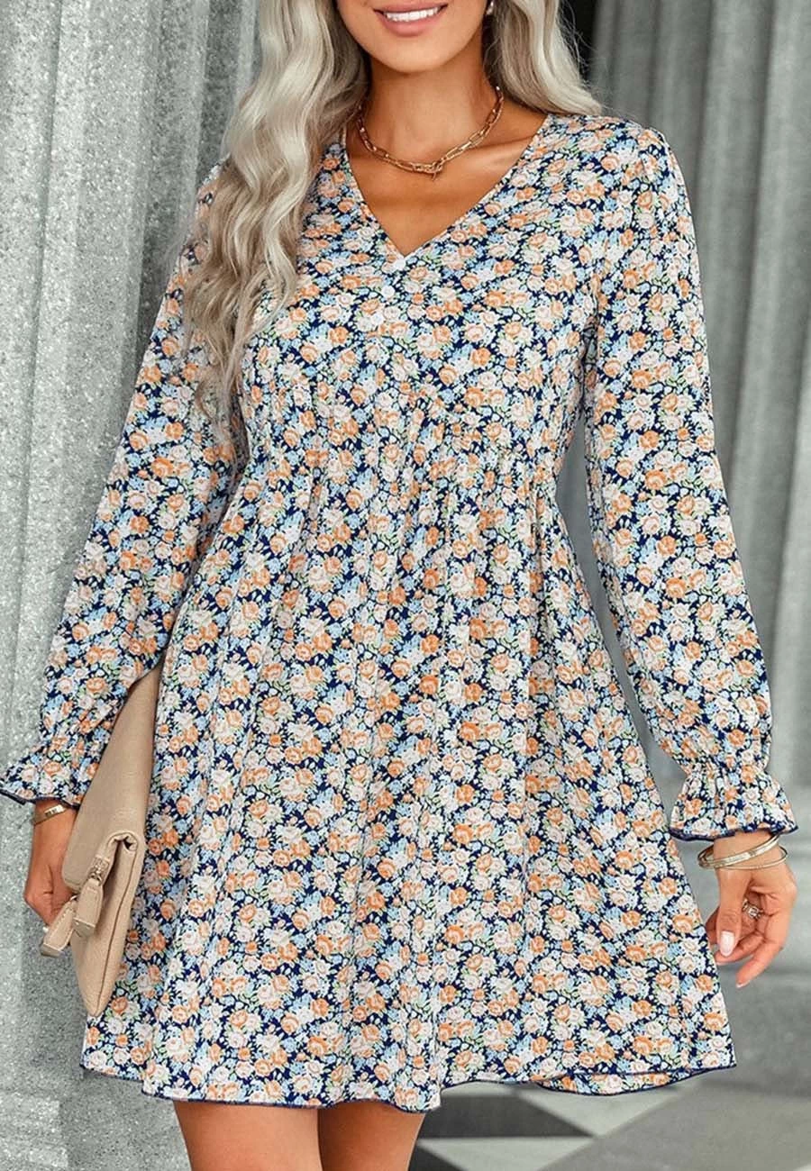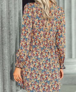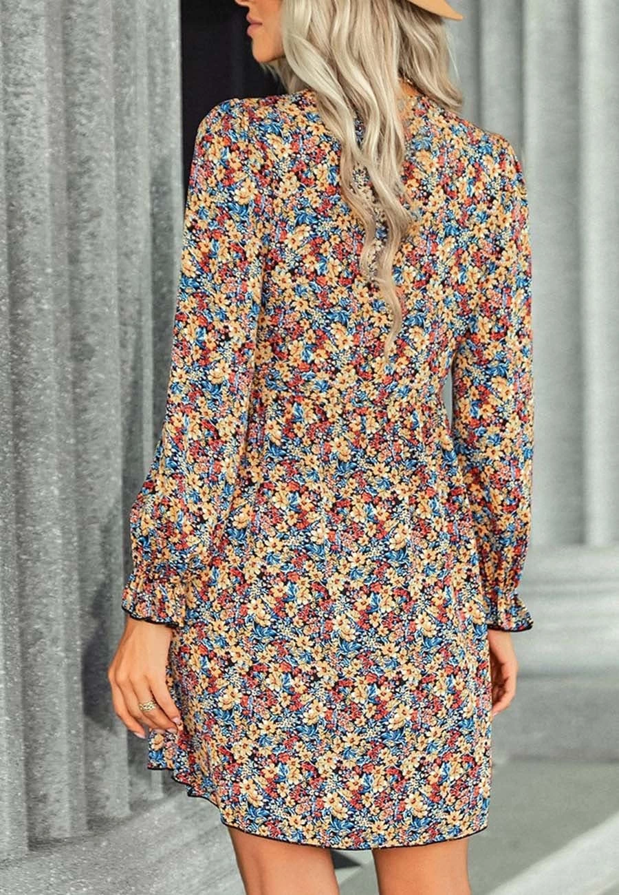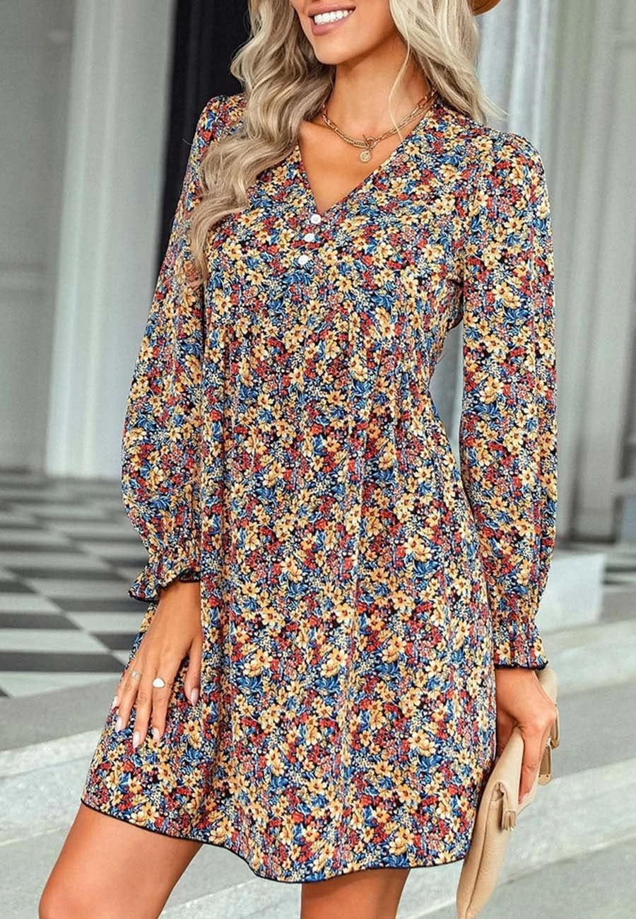 The Anna-Kaci dress is detailed with vintage multicolor floral prints. Pair it with a fedora hat and boots for a cute look.