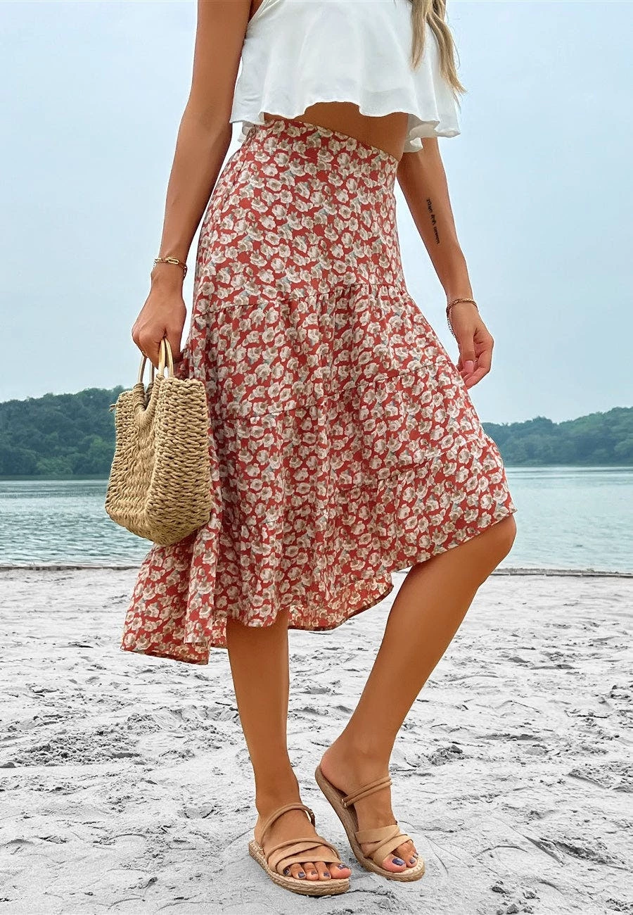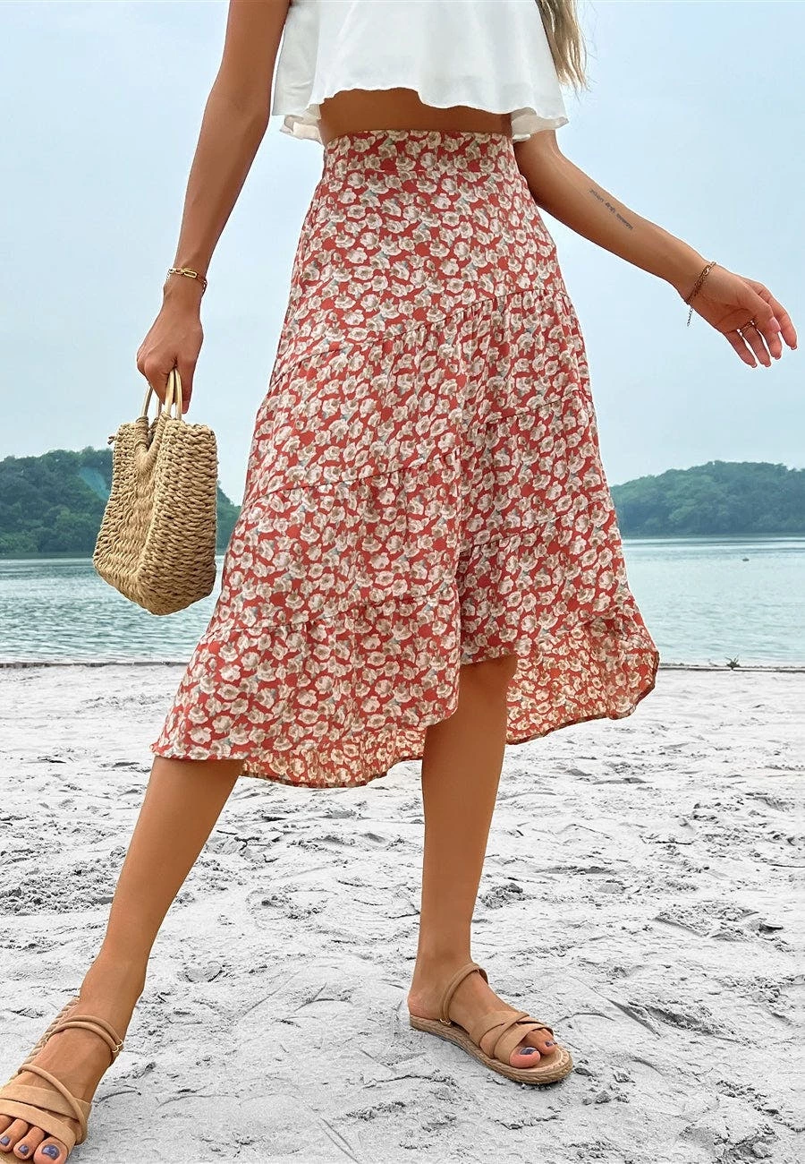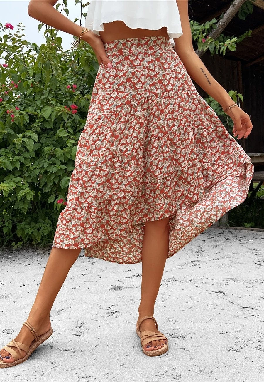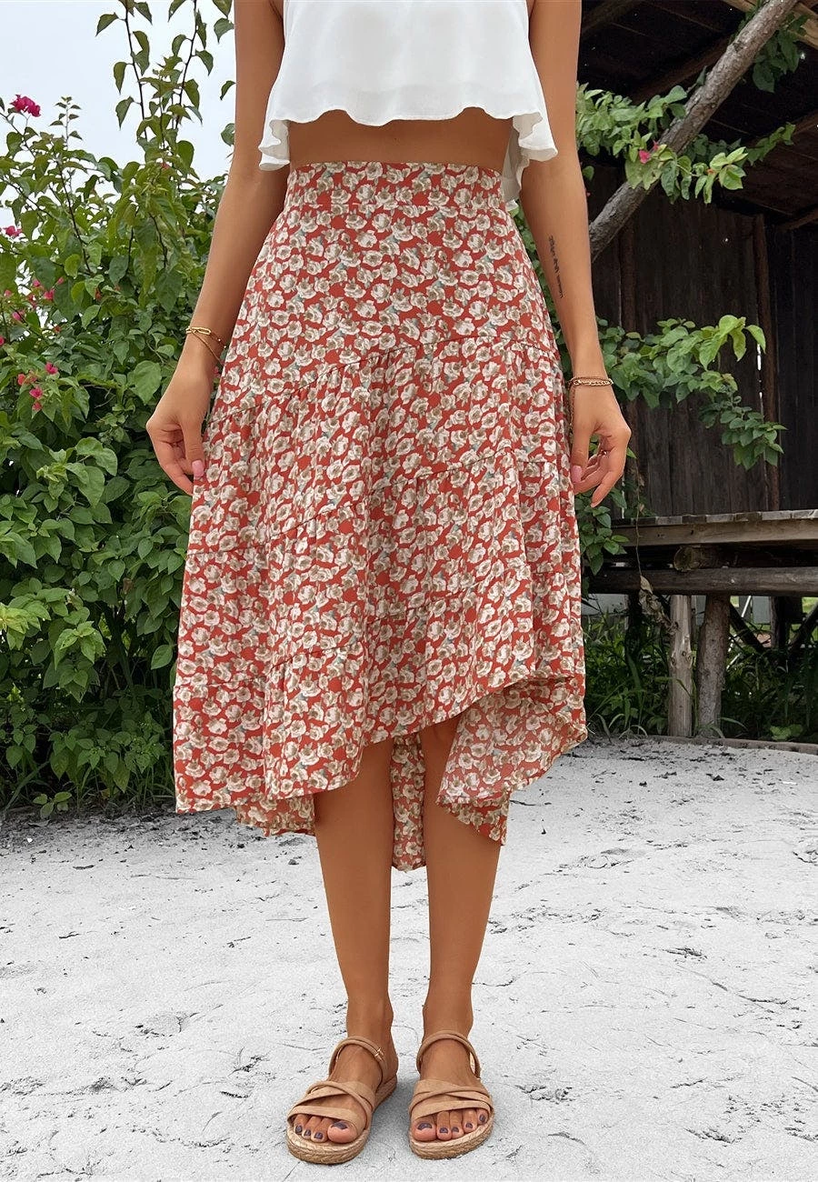 The Anna-Kaci skirt is detailed with a unique asymmetrical hem. Features a fun print, high waist, flowy skirt, and knee length. Pair it with a tank top and sandals for a fabulous look.