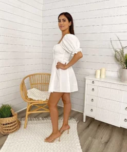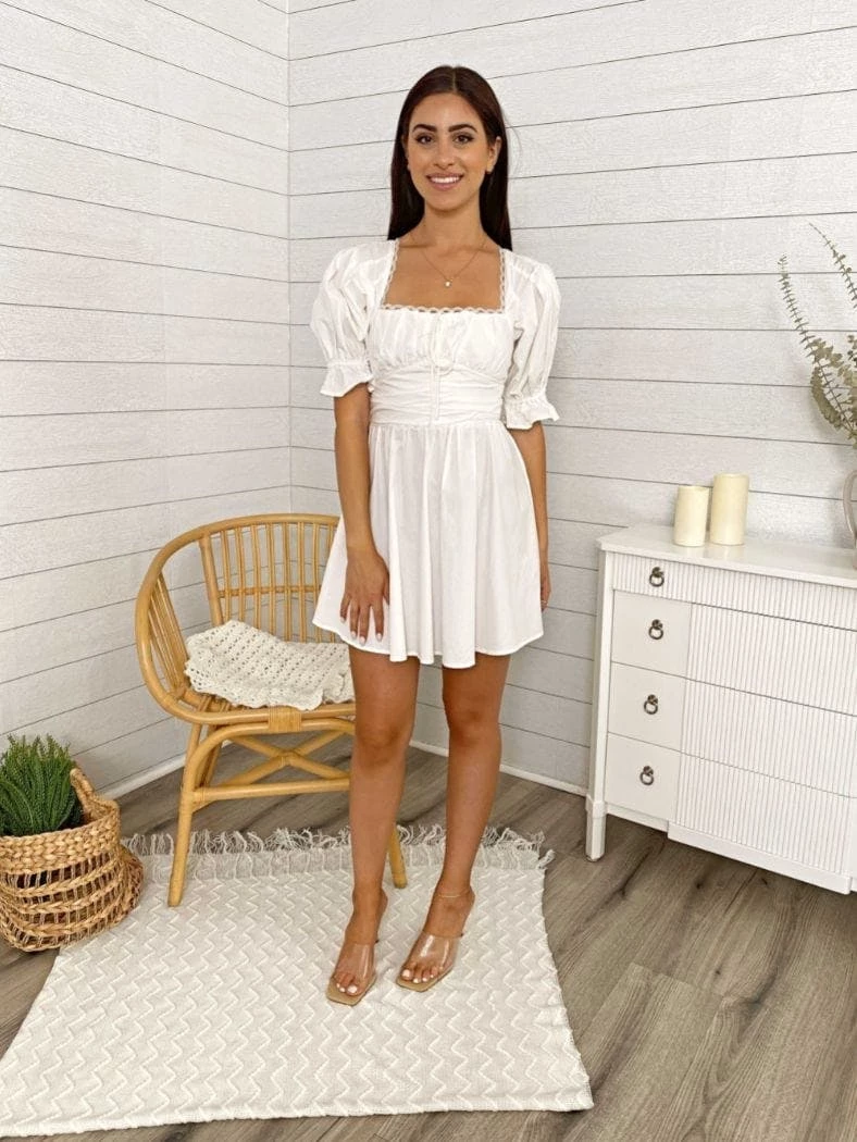 The Anna-Kaci dress is detailed with a squared neckline, puff half sleeves, ruched bust and waist, and front bow tie. Features an open back, and falls at upper thigh at mini length. This lightweight milkmaid peasant styled dress is the perfect summer picnic outfit. Finish the look with some gold jewelry and western boots for a sweet and chic look.