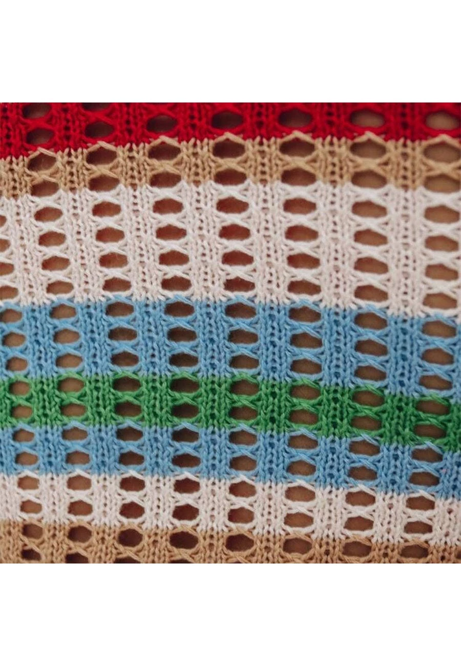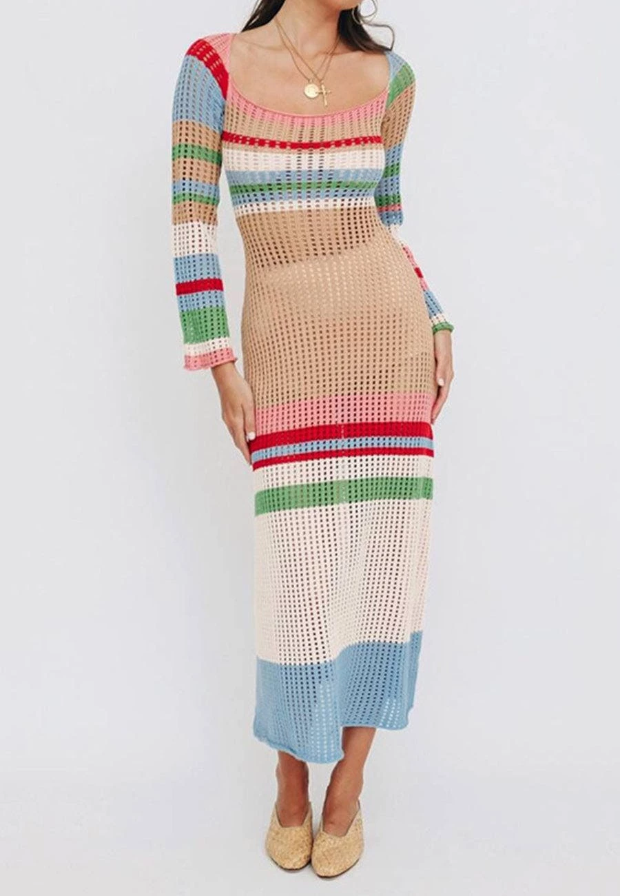 The Anna-Kaci Cover-Up Dress is detailed with a square neckline and flared long sleeves. Features a small circular crochet knit throughout, and falls at maxi length. This bold and boho cover-up dress is perfect to throw on after a long day at the beach. Finish the look with your favorite beach hat.