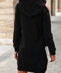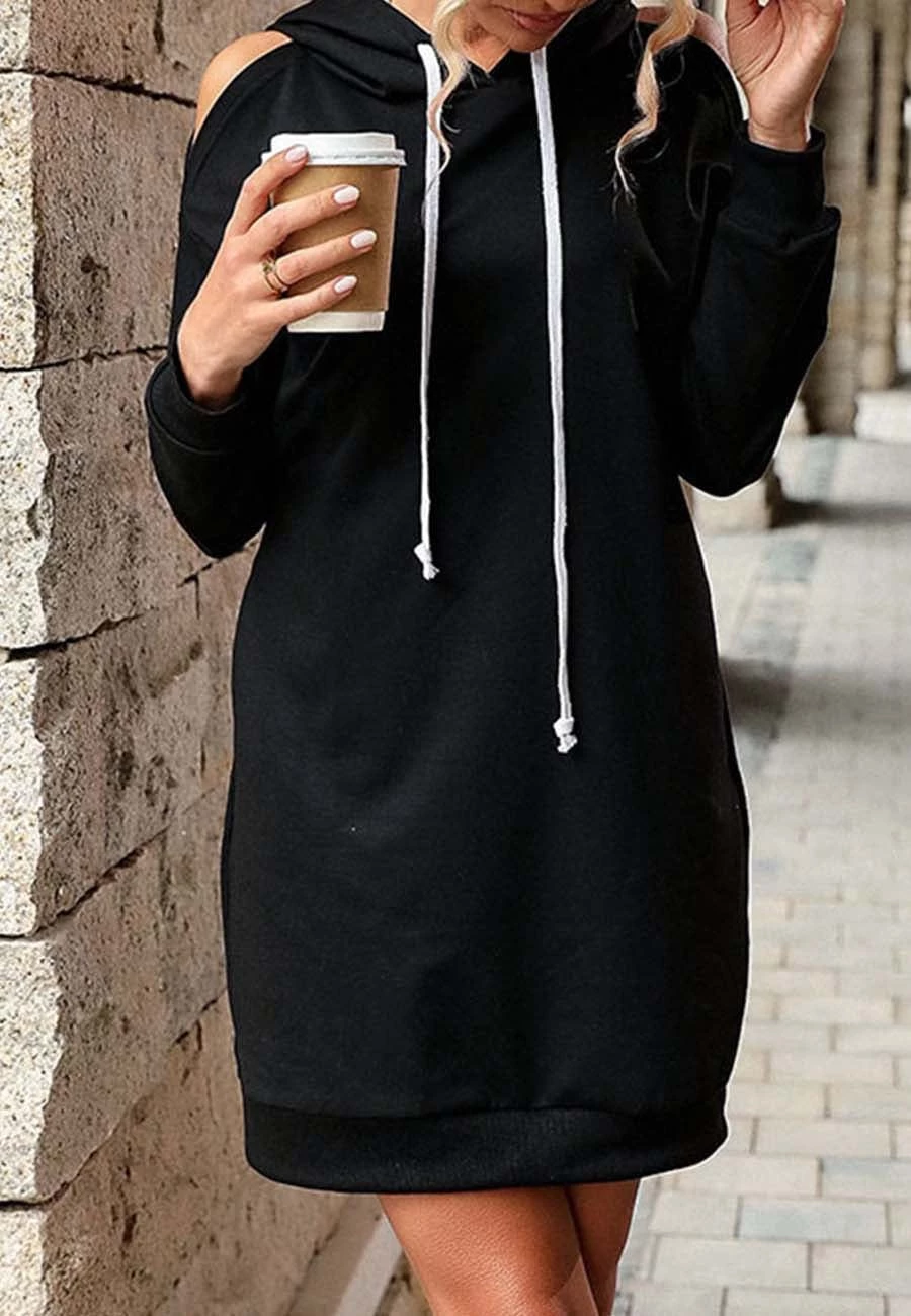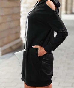The Anna-Kaci dress is detailed with a unique shoulder cutout design. Features solid color, drawstring hood, shift dress silhouette, long sleeves, and above knee length. Pair it with a baseball cap and sneakers for a cool athleisure look.