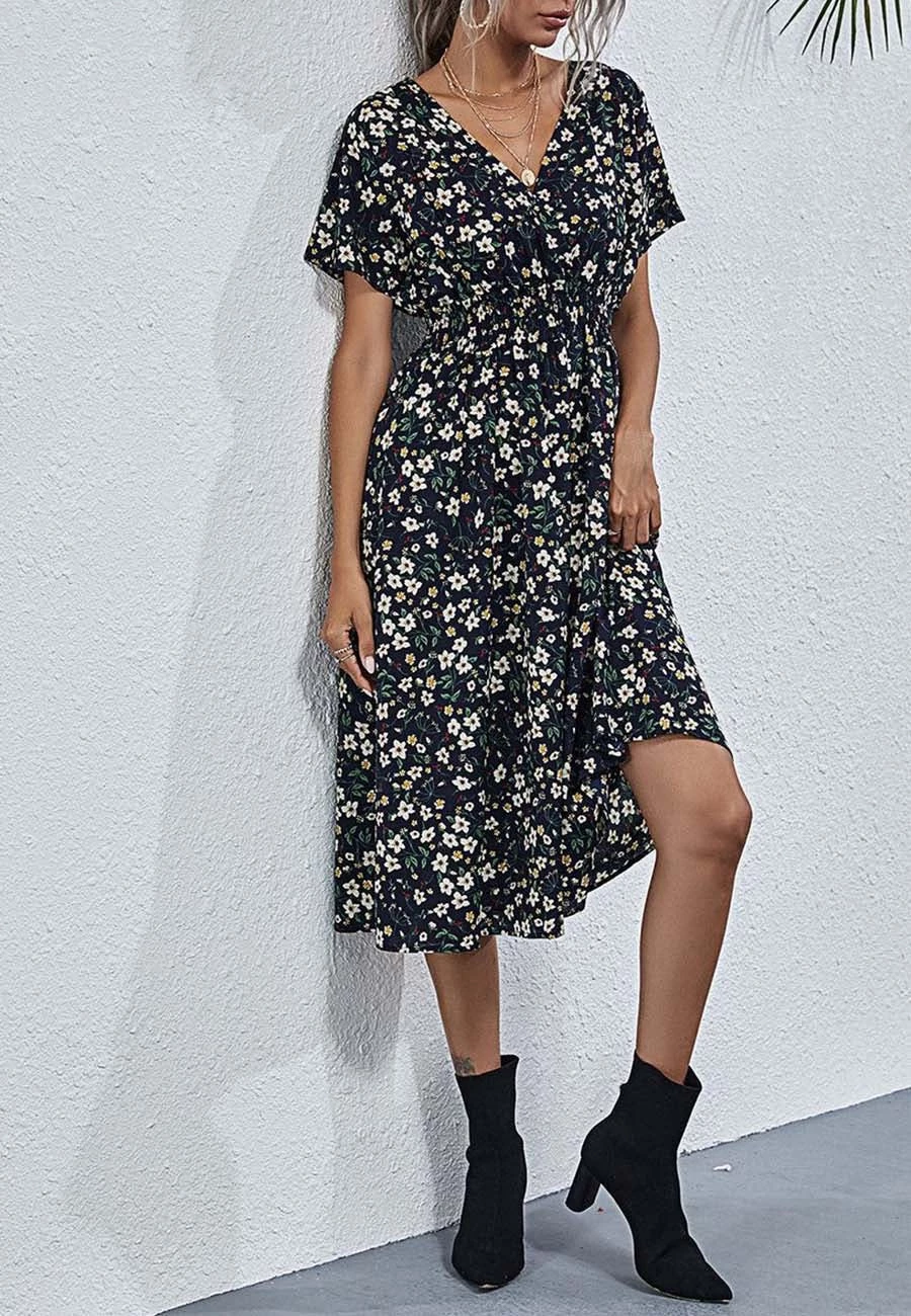 The Anna-Kaci floral print midi dress is detailed with dainty flower patterns across the dress and a crossed front v-neck line giving its charming touch. Easily pair this dress with your favorite leather sandals and summer accessories. After the summer season, you can easily transition to fall with your favorite suede knee-high boots and cardigans.