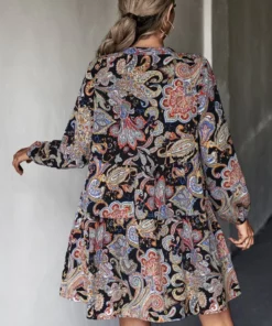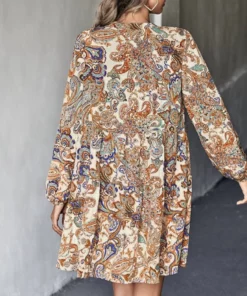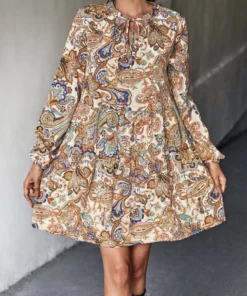 The Anna-Kaci Dress is detailed with a gorgeous paisley print. Features a tie neck detail, long sleeves, shift dress silhouette, and above knee length. Pair it with a fedora hat and boots for a cool look.