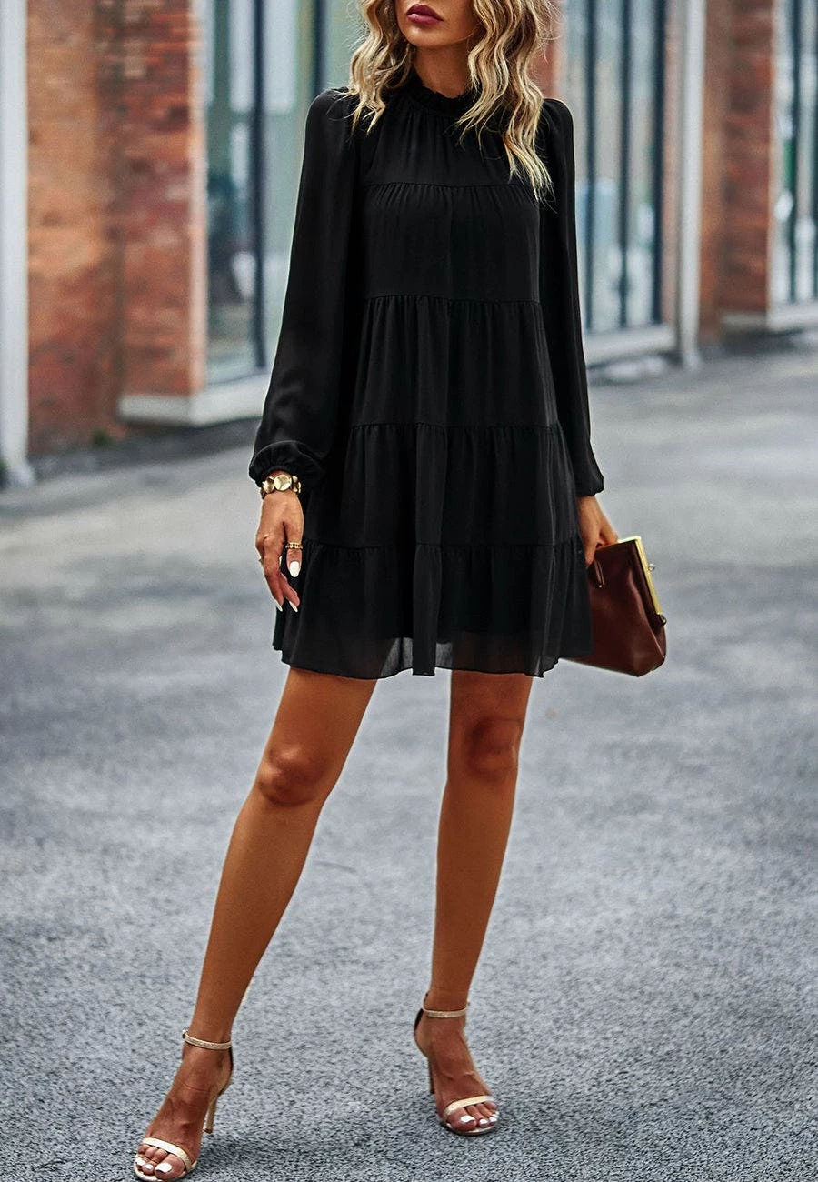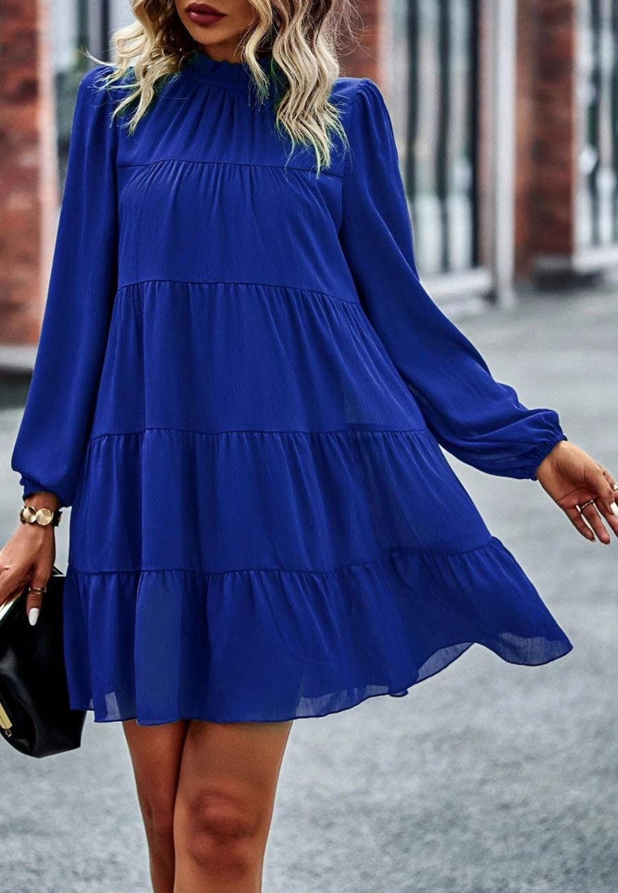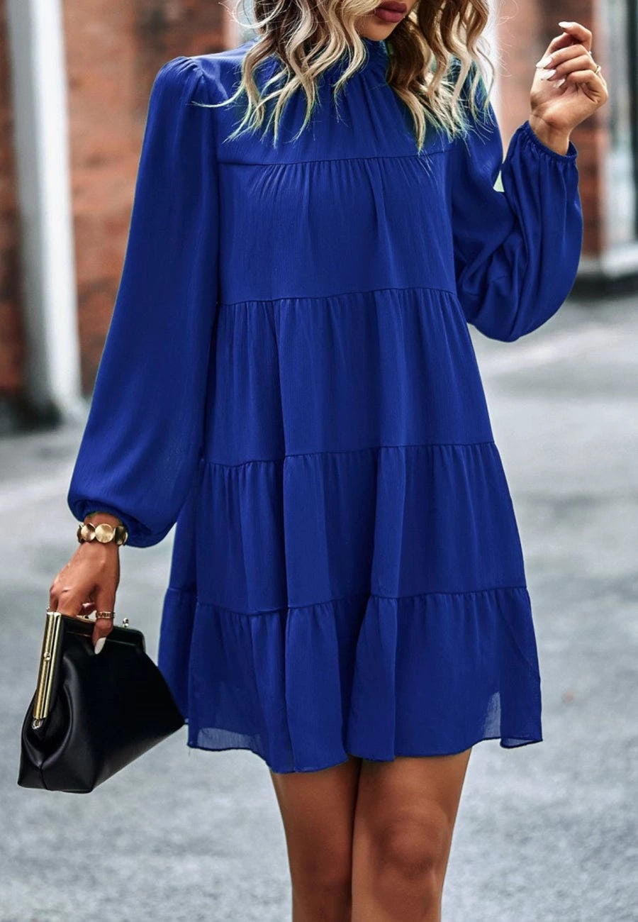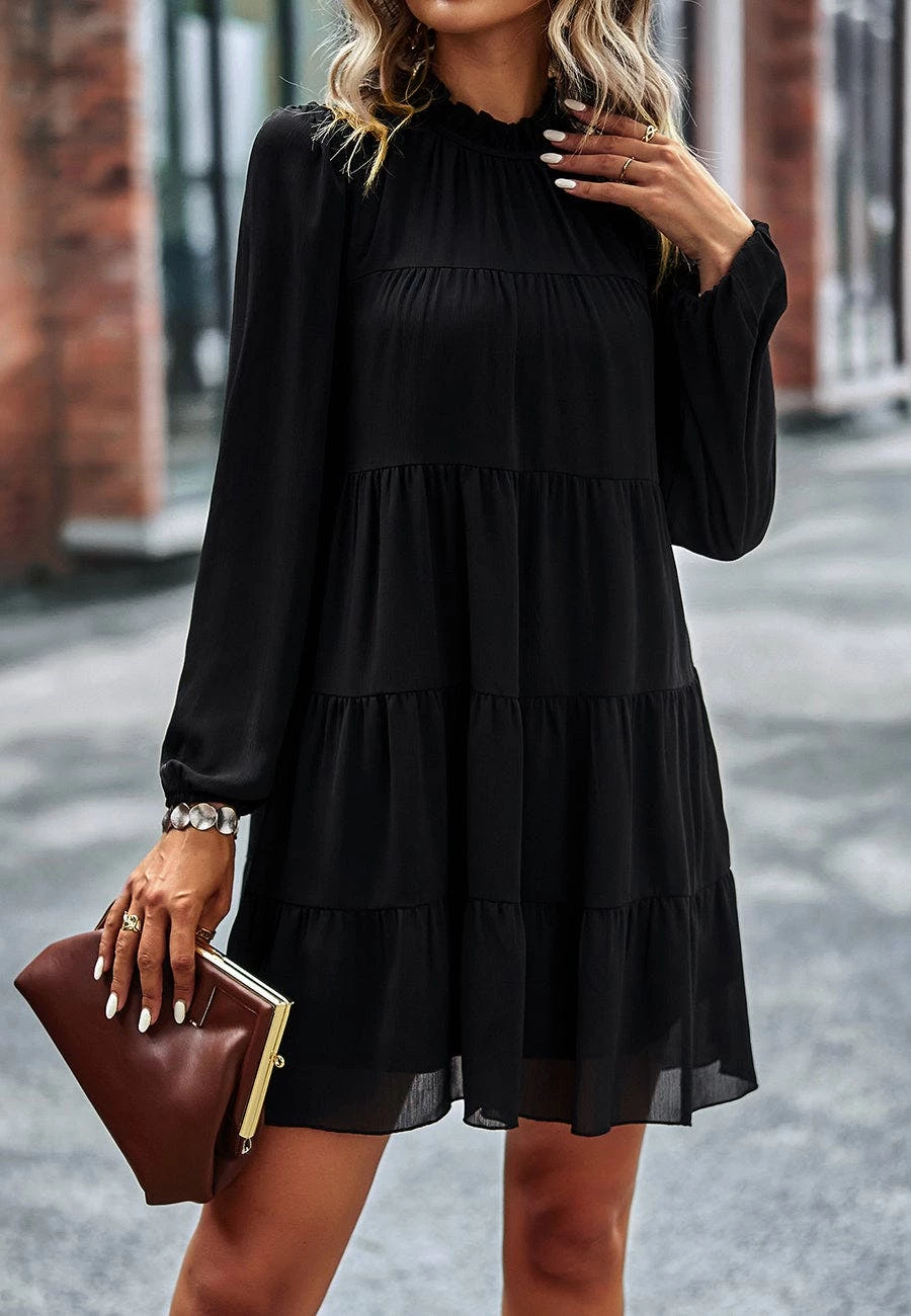 The Anna-Kaci dress is detailed with a cute tie ribbon back detail. Features solid color, long sleeves, high neck line, shift dress silhouette, tiered style, and above knee length. Pair it with gladiator sandals and a handbag for a fantastic look.