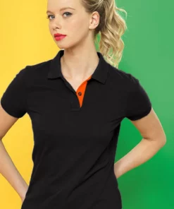 – Fitted polo shirt with contrast collar and placket.- Two contrast coloured buttons on placket.- Contrast colour on side vents.- Twin needle stitching on hem.- Ribbed knit collar and sleeve cuffs.- Machine washable.- Fabric: 100% Cotton.- Size (Chest): XS- 8 (33), S- 10 (35), M- 12 (37), L- 14 (39), XL- 16 (41), 2XL- 18 (43)..- Gender: Women