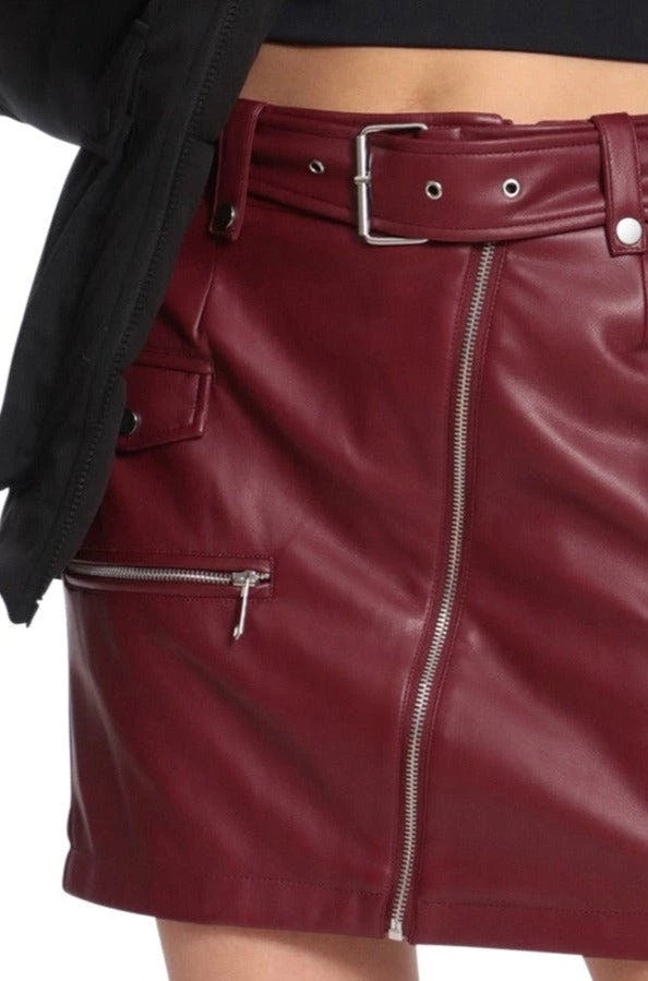 Stretchy Faux Leather belted asymmetrical silver zipper moto Mini Skirt.