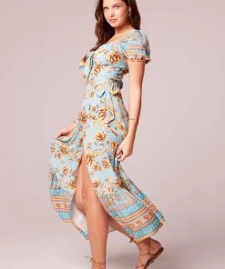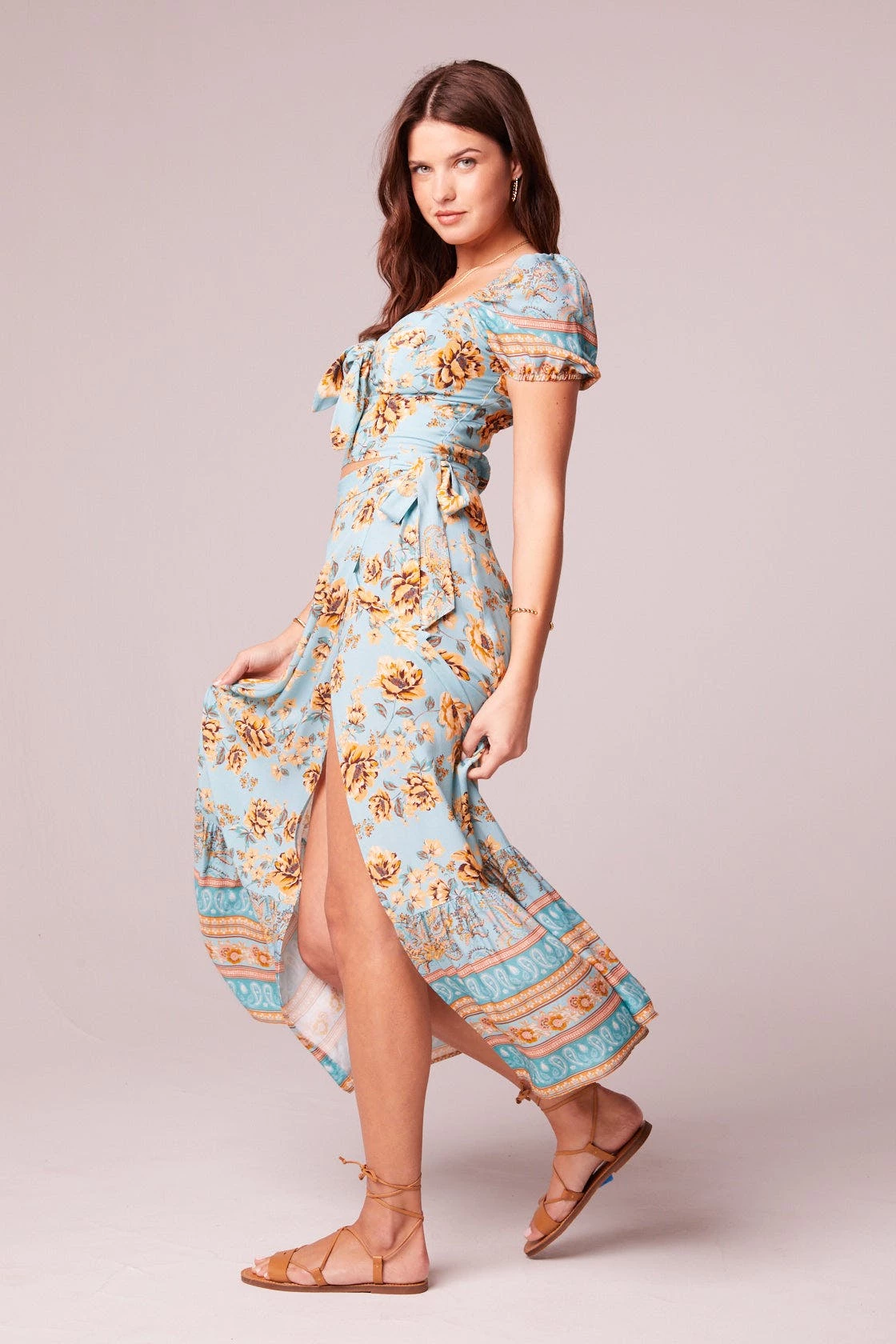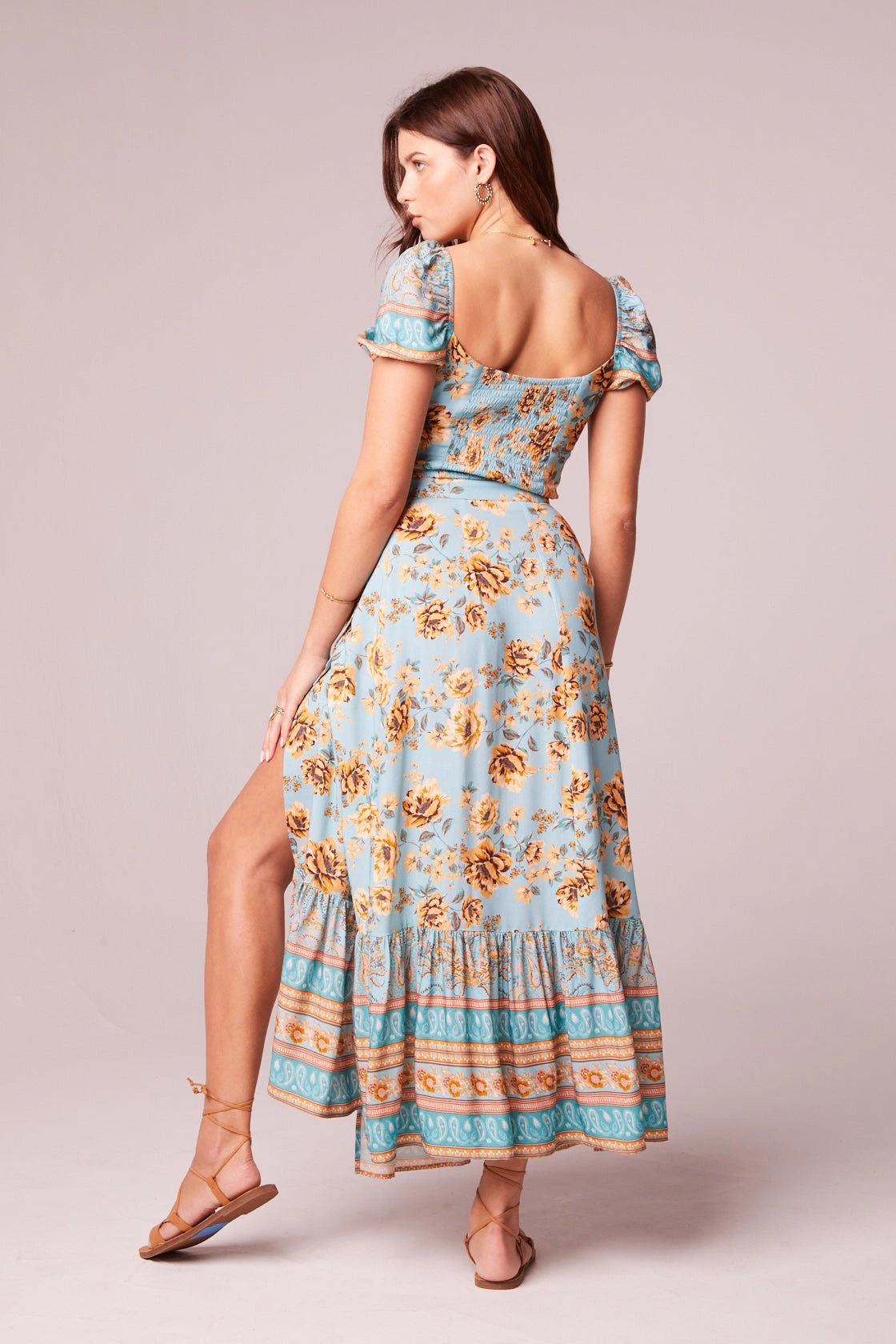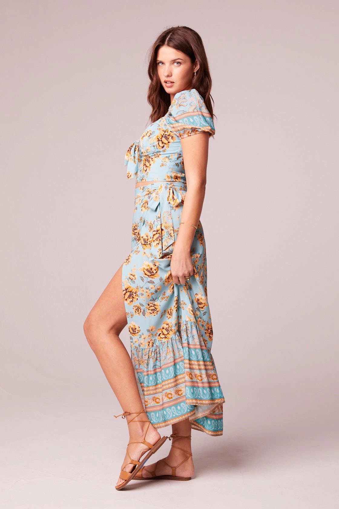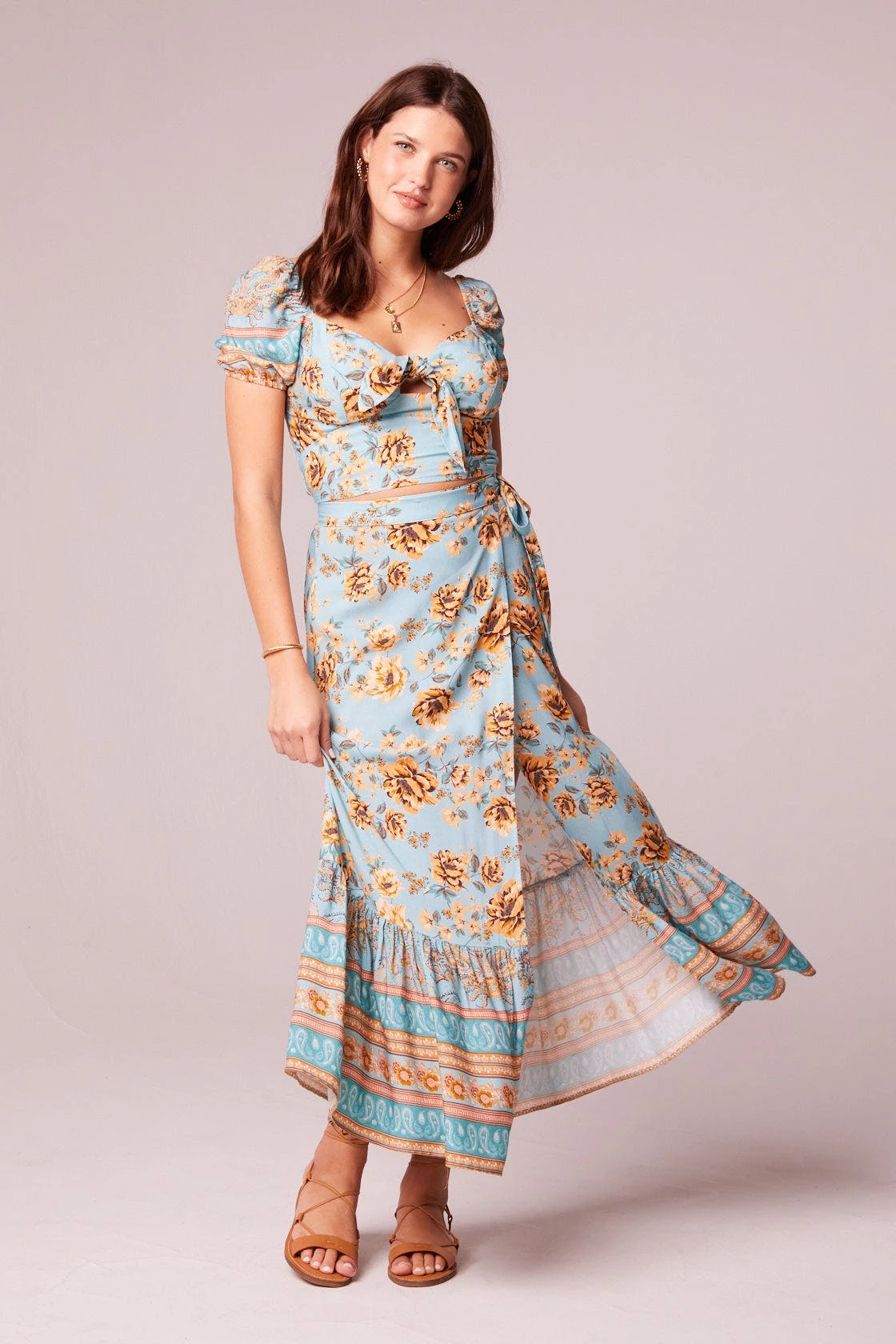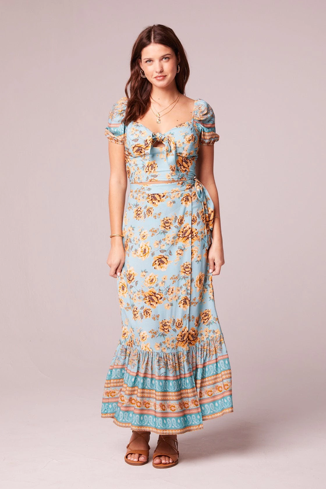 Reminiscent of breezy summer days, the Esmerelda maxi skirts border print and wrap front will have you swooning.