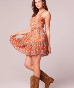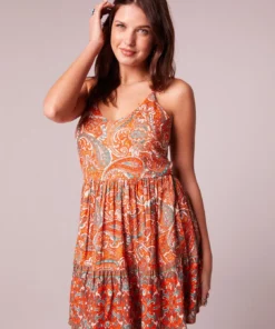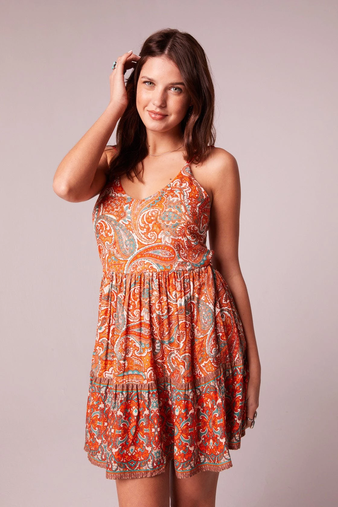 Detailed straps and a swingy skirt add attitude to the Margarita mini dress’s all over paisley print.
