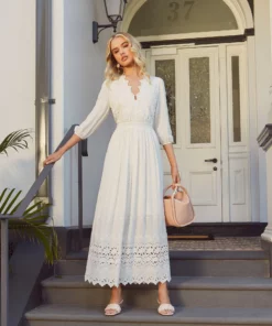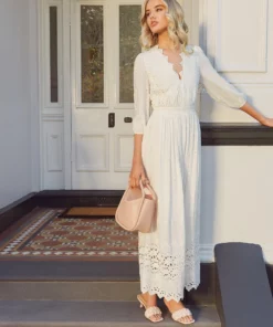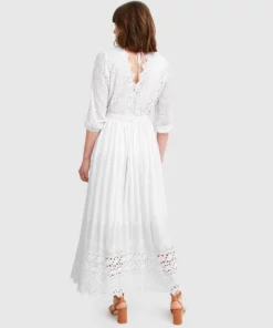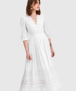 All eyes on me midi dressis effortlessly bohemian inspired, featuring intricate lace throughout with 3/4 cuffed sleeves and scalloped edges.