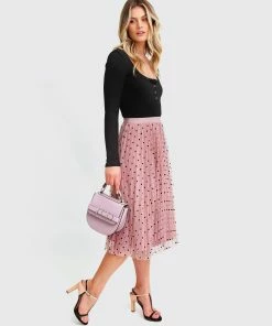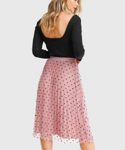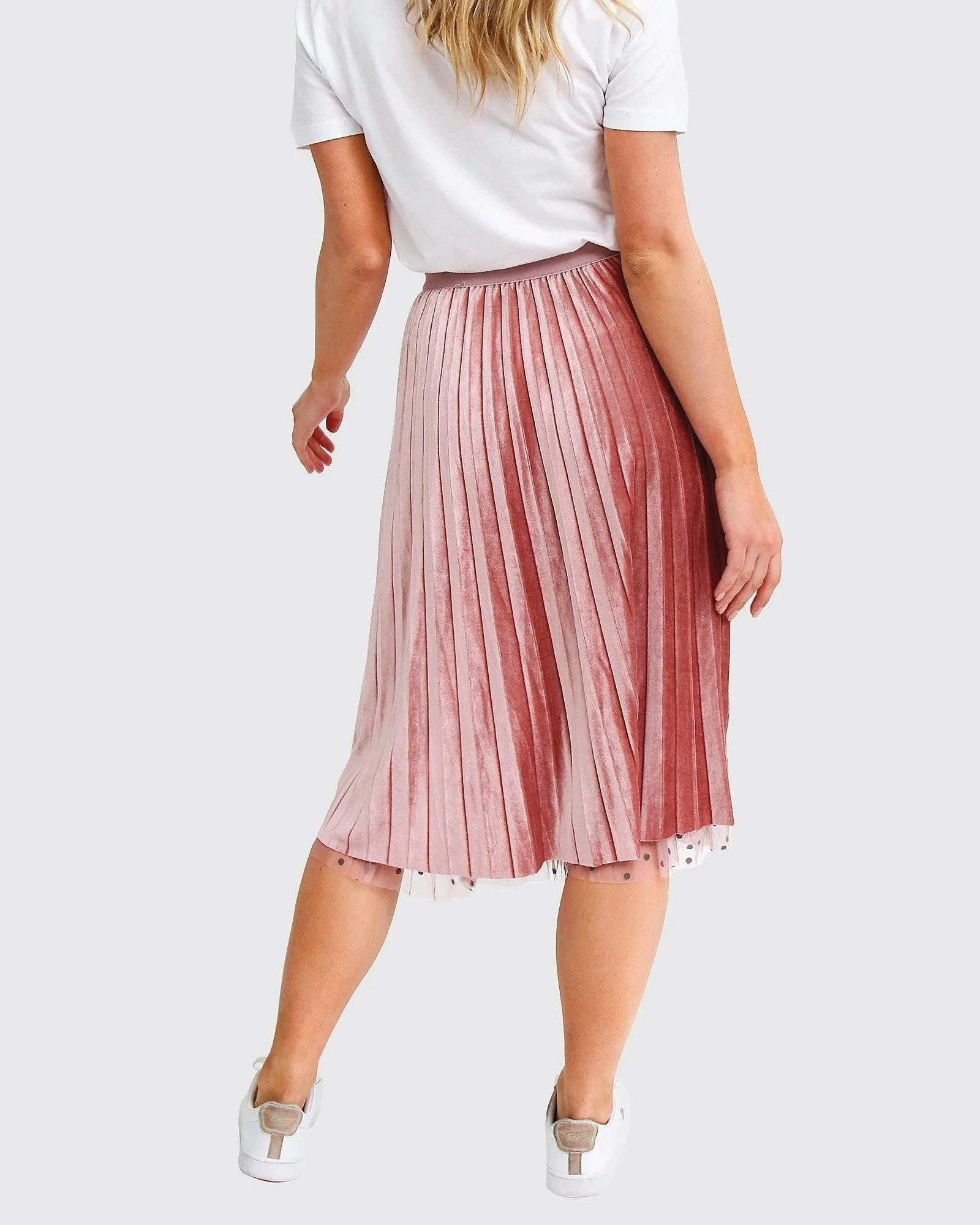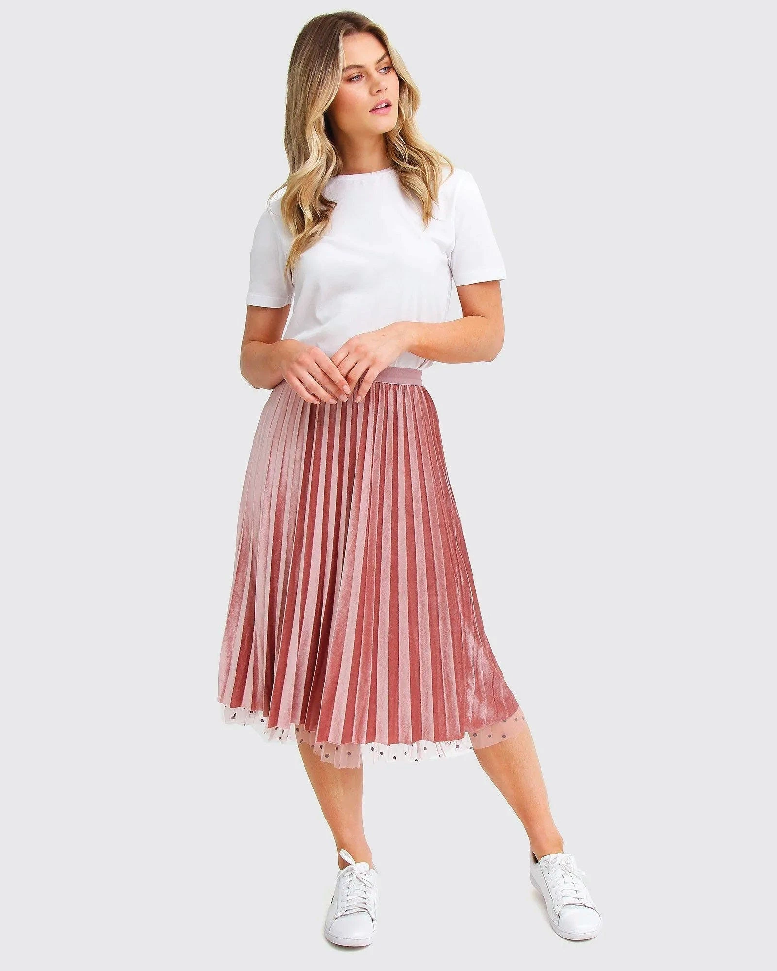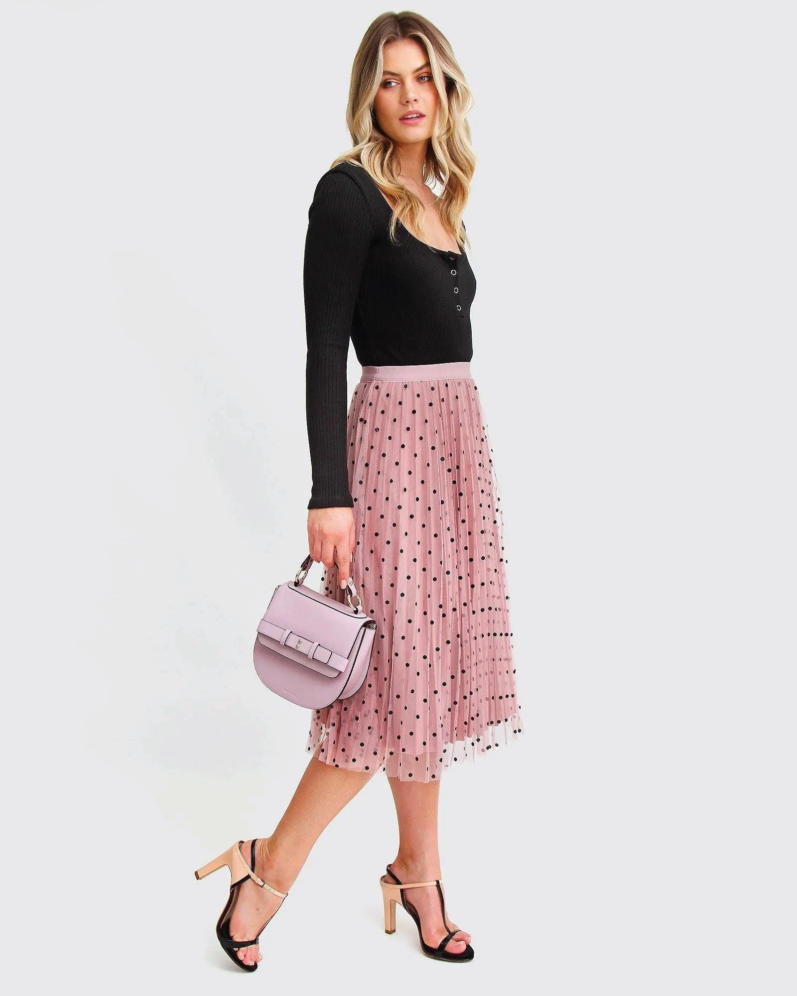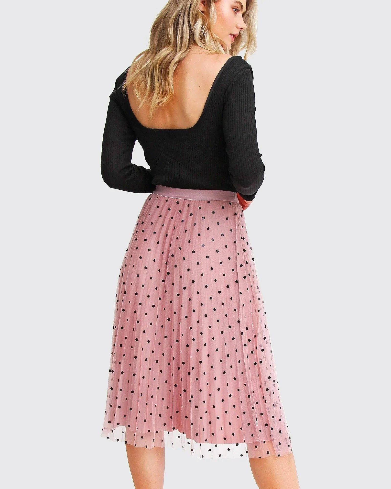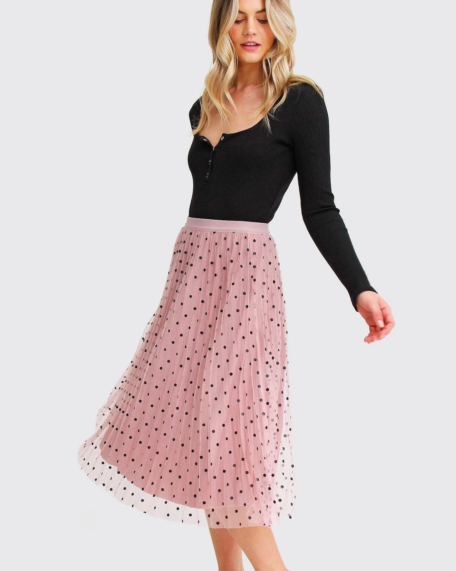 Don’t know what to wear? We have the perfect answer! Mixed Feeling Reversible Skirt features velour pleats on one side and flock polka dots on tulle inside. Turn it inside out anytime! It will become your go-to style on any occasion.