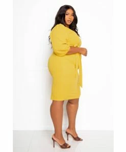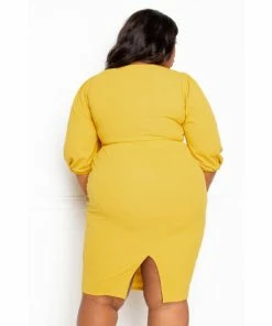 – Mustard yellow- Wrapped top with tie closure- Surplice v-neck- 3/4 sleeves- Knee-length bodycon skirt with high waistbend- 95% polyester, 5% spandex- Machine wash cold on gentle cycle. Do not bleach- Imported- True to size- 1x=14-16, 2x=18-20, 3x=22-24- Our model is 5’8″- Wearing 2x
