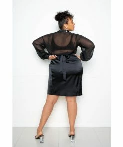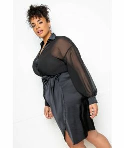 – Spread collared- Front button closure- Oversized fit with dropped shoulders- Long sleeves with buttoned cuffs- Wrapped skirt with waist tie