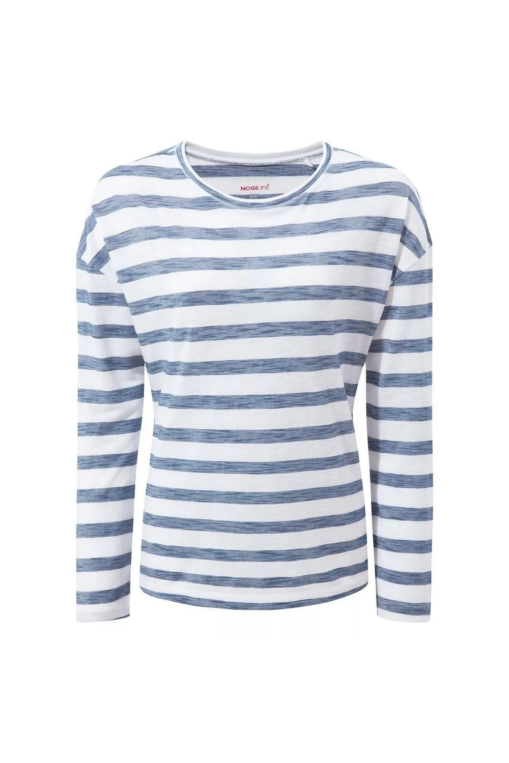 Striped stretch travel top featuring NosiLife anti-insect protection with moisture- and odour-control fabric tech for day-long freshness. Lightweight and packable.