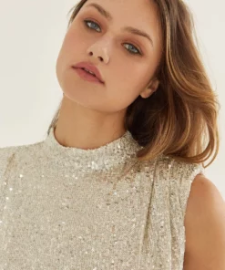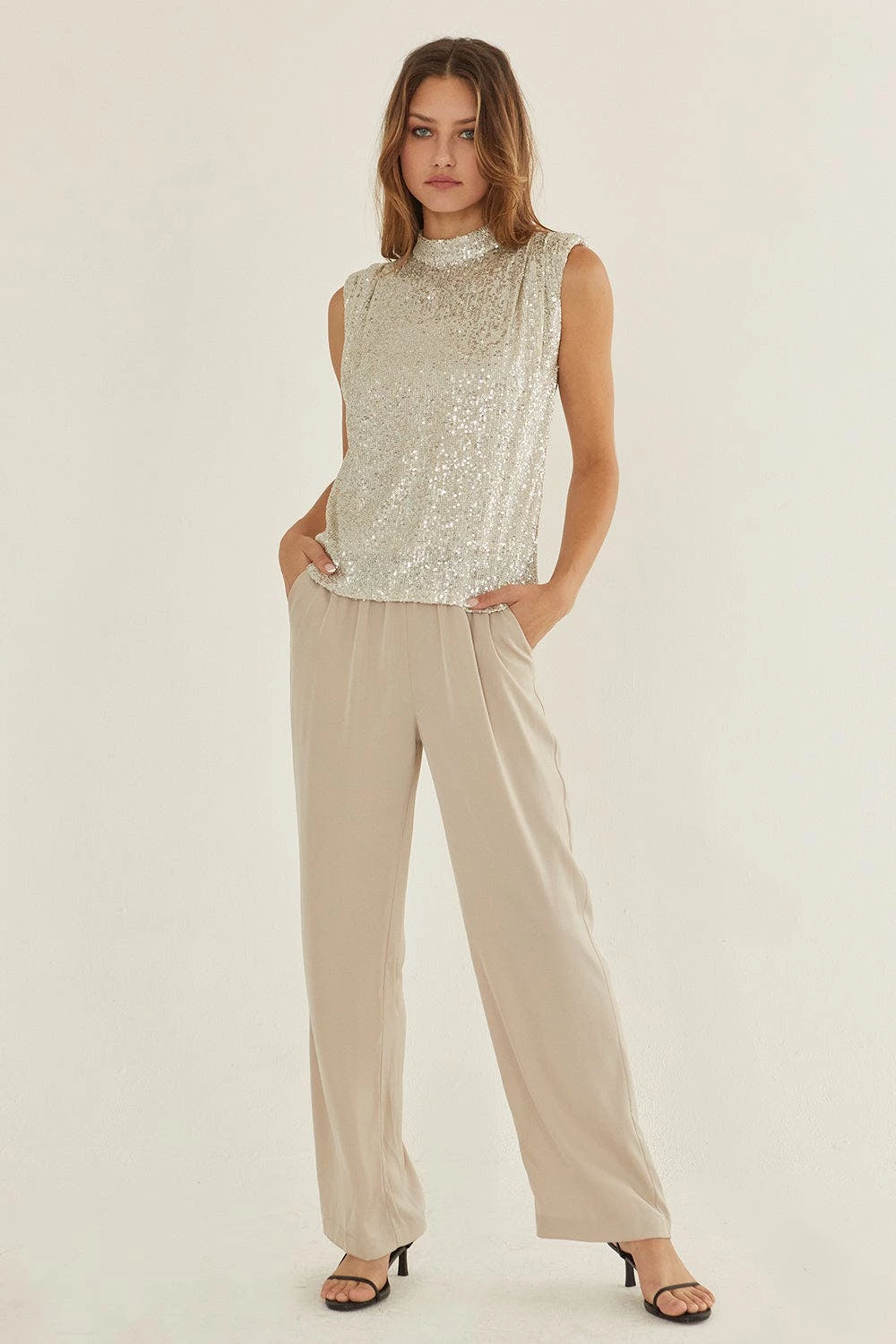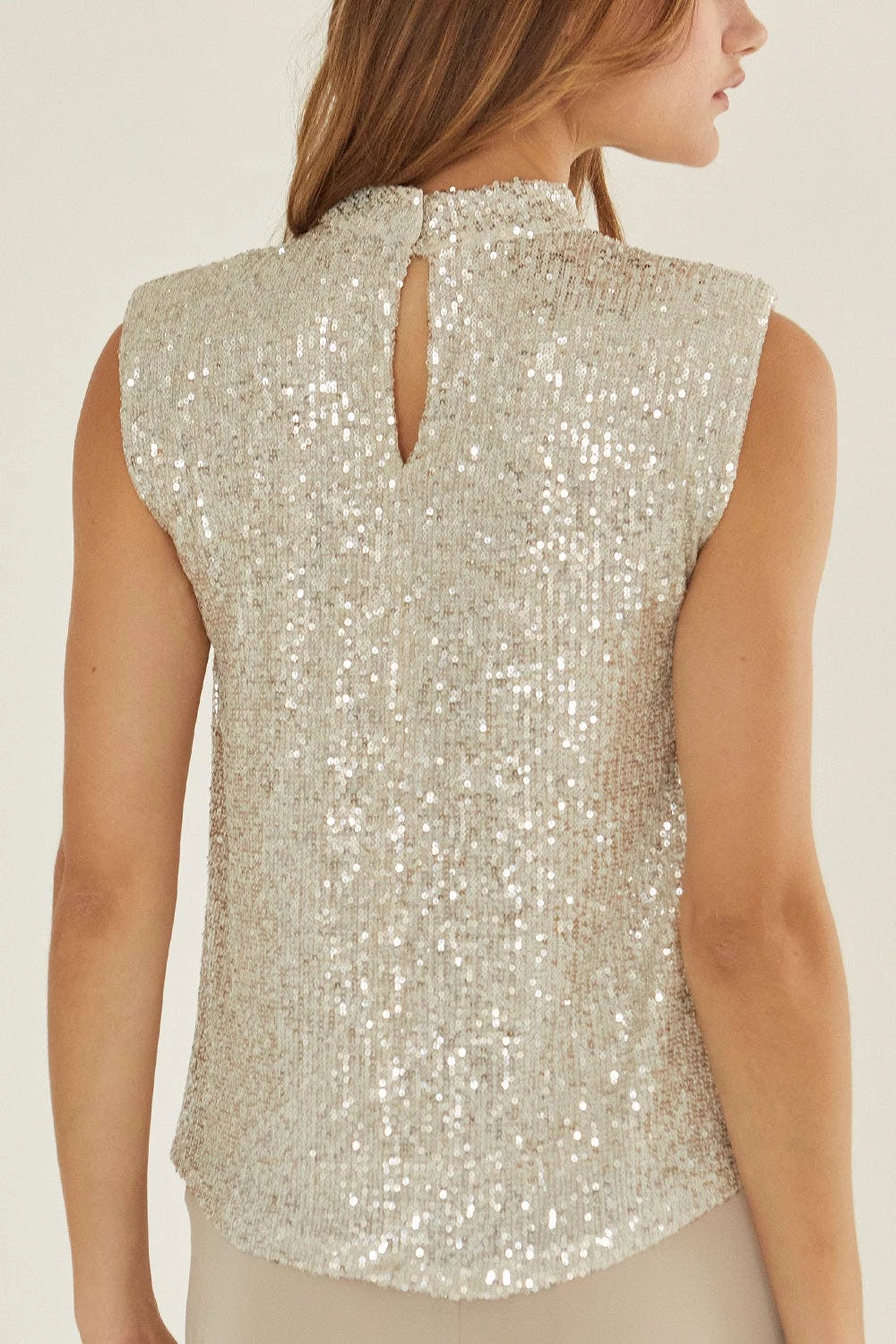 Perfect for the holidays, This Sequin Top features mock neck, sleeveless body with lightly padded shoulders, back keyhole and snap button closure.