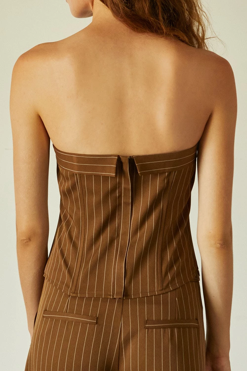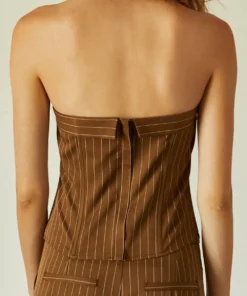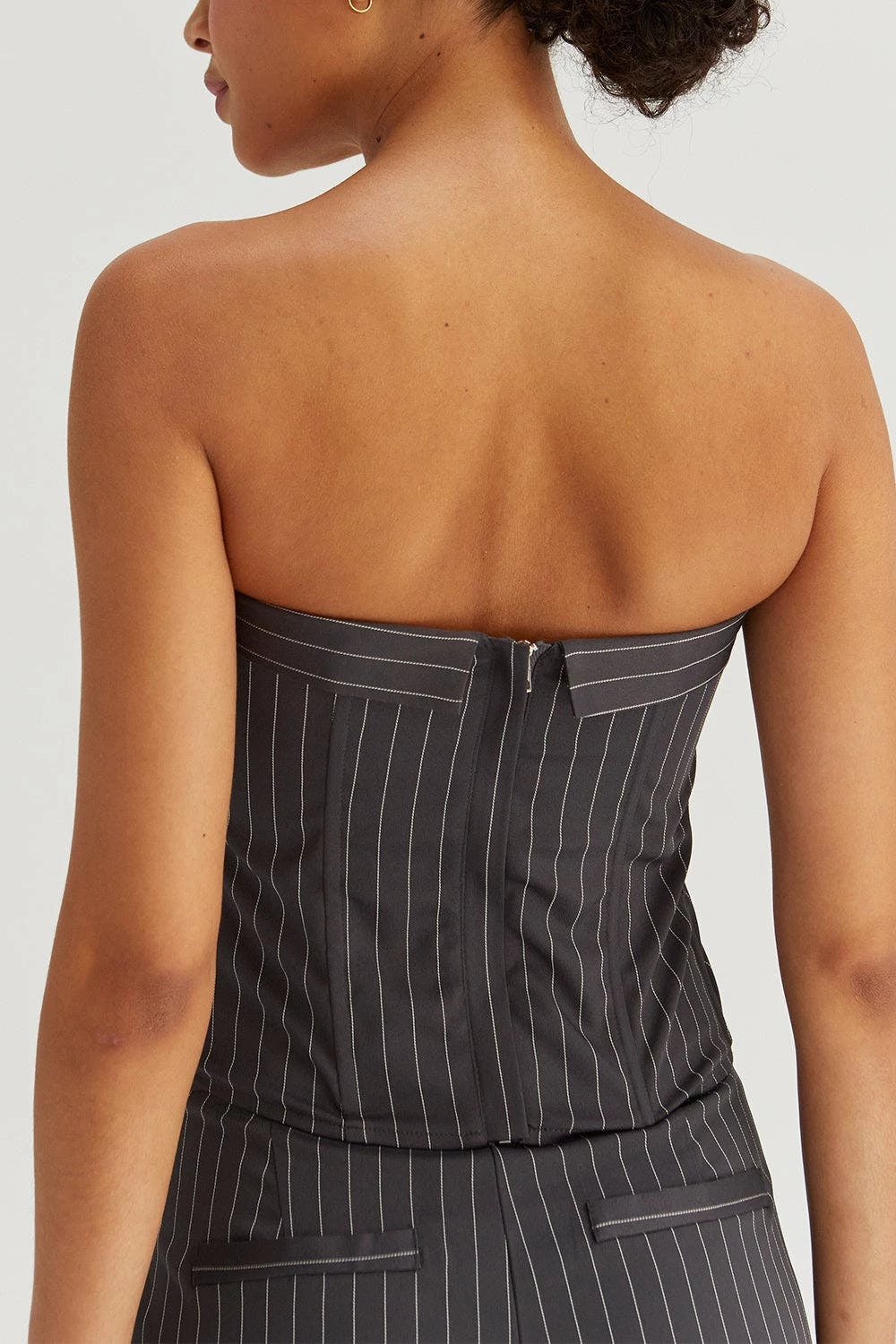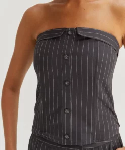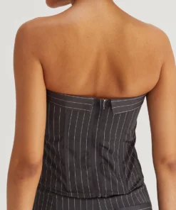This corset top is made with pinstriped woven material, featuring structured boning, faux front button detail, back zipper closure in a strapless, fitted bodice. Style it with the matching jayda pinstripe blazer and gwen pinstripe trousers to create an up-to-date work to night out look.