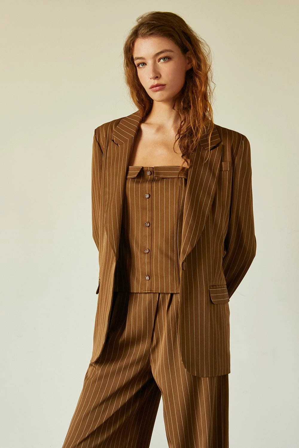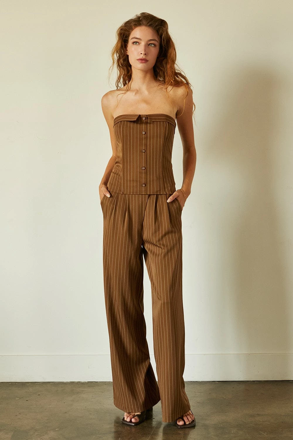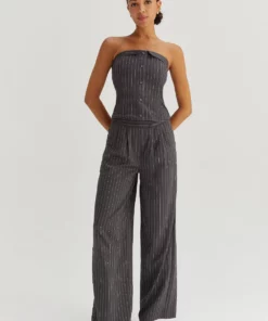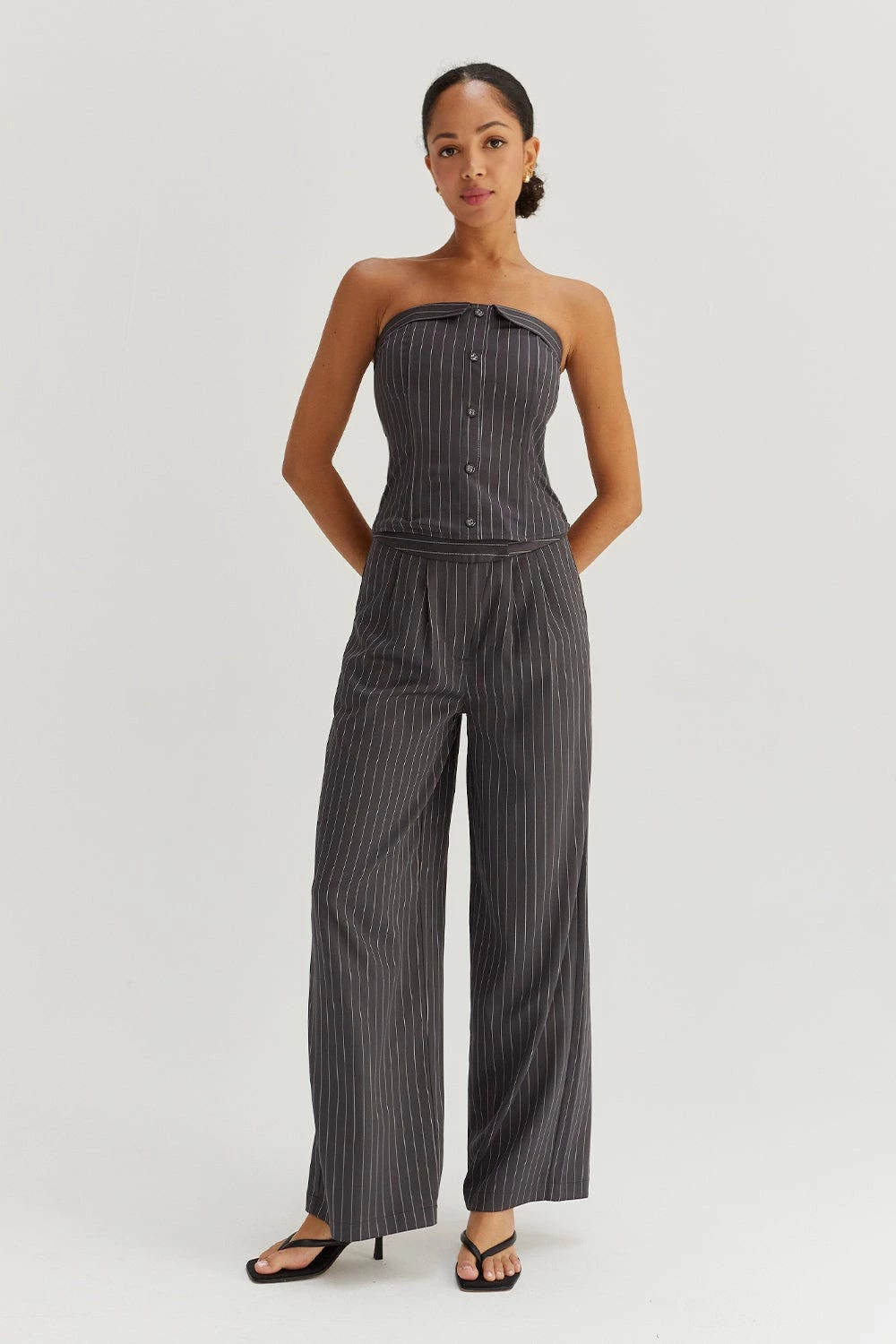 This corset top is made with pinstriped woven material, featuring structured boning, faux front button detail, back zipper closure in a strapless, fitted bodice. Style it with the matching jayda pinstripe blazer and gwen pinstripe trousers to create an up-to-date work to night out look.