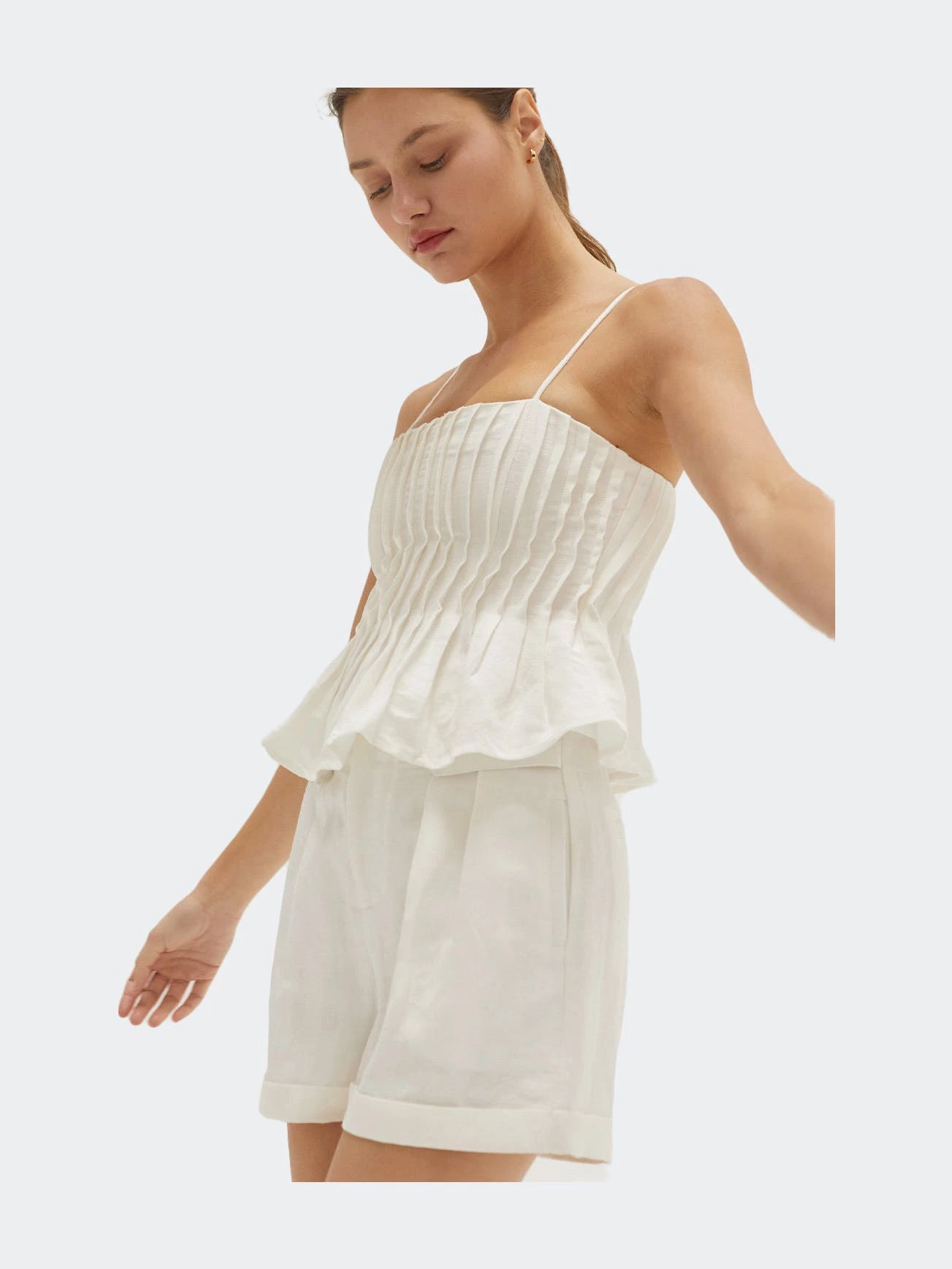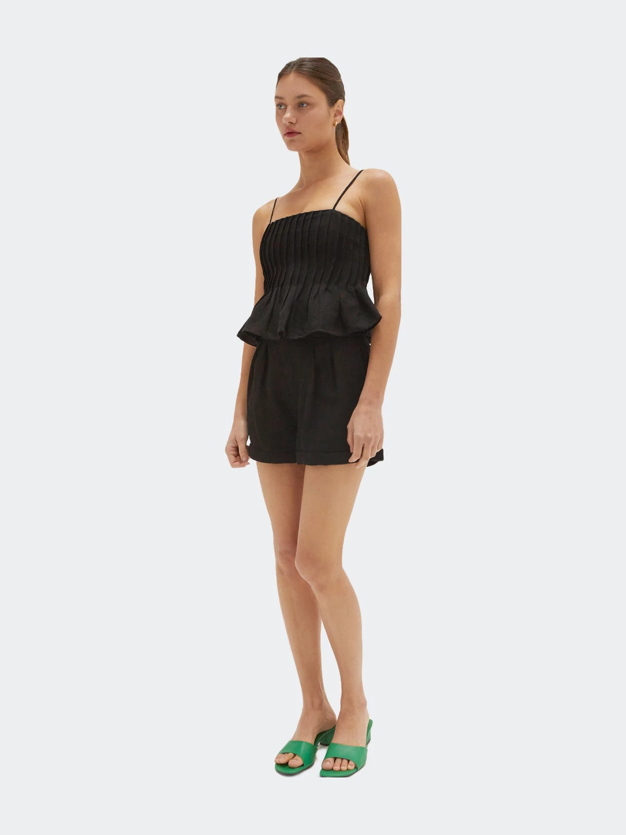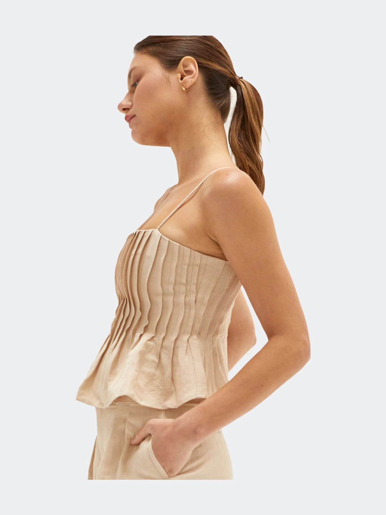 This linen-blend top is cut in a slightly cropped length with all over pleat detail and adjustable spaghetti straps.