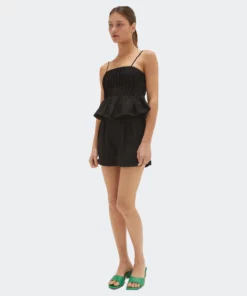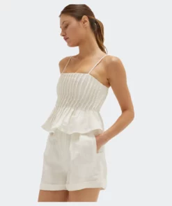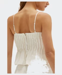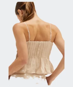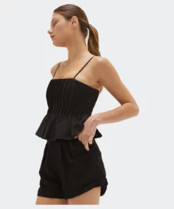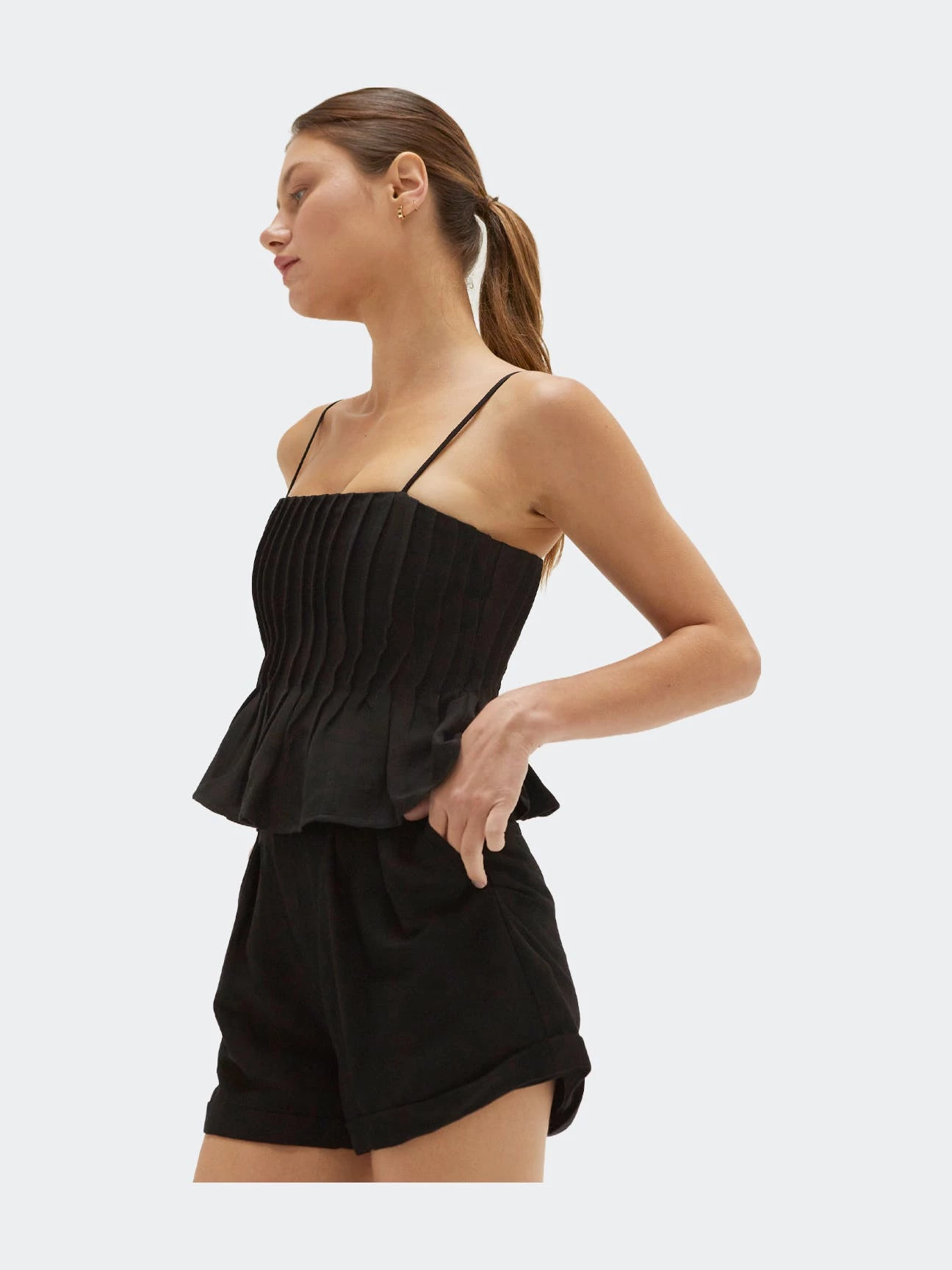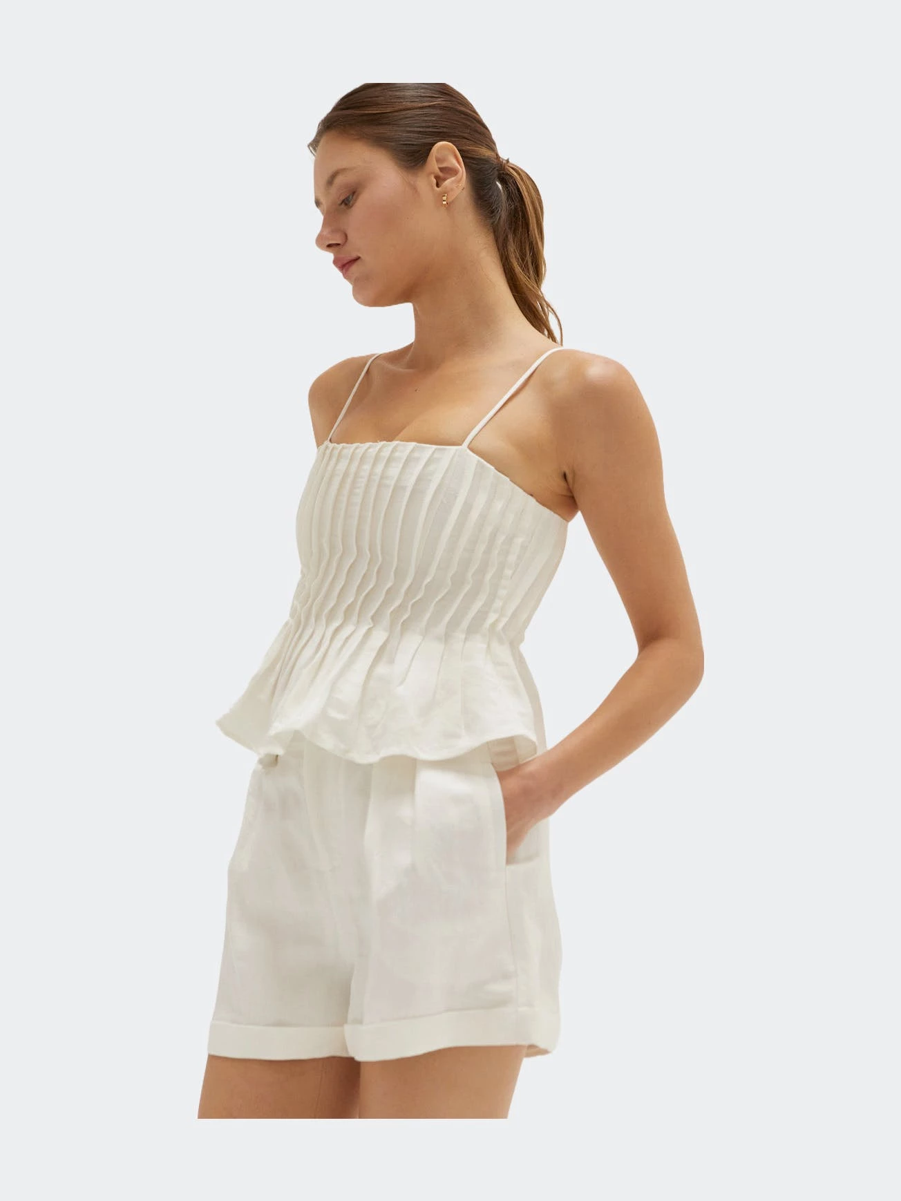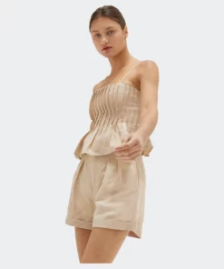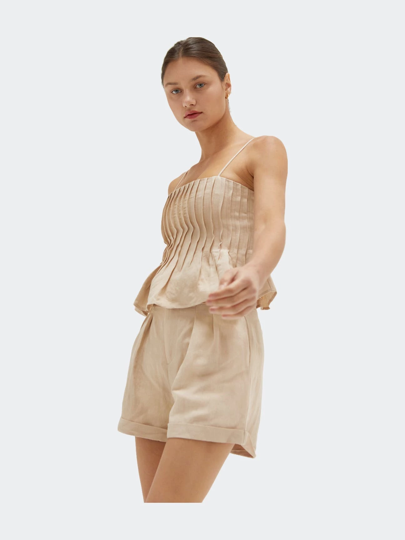 This linen-blend top is cut in a slightly cropped length with all over pleat detail and adjustable spaghetti straps.