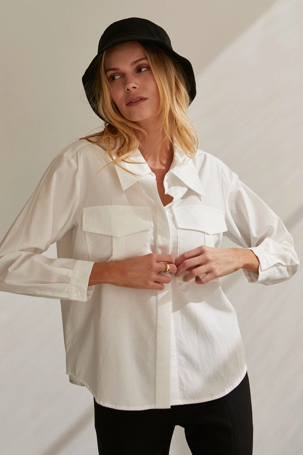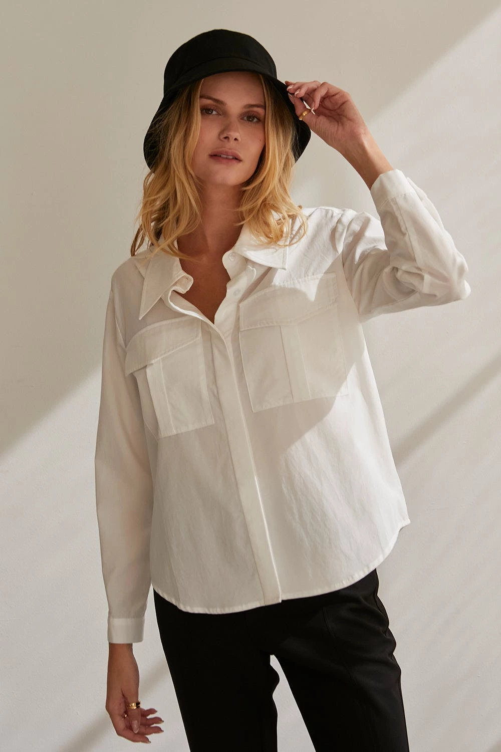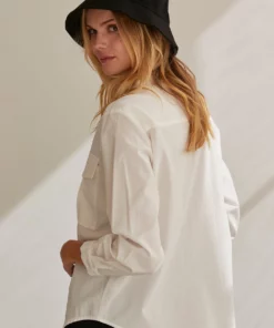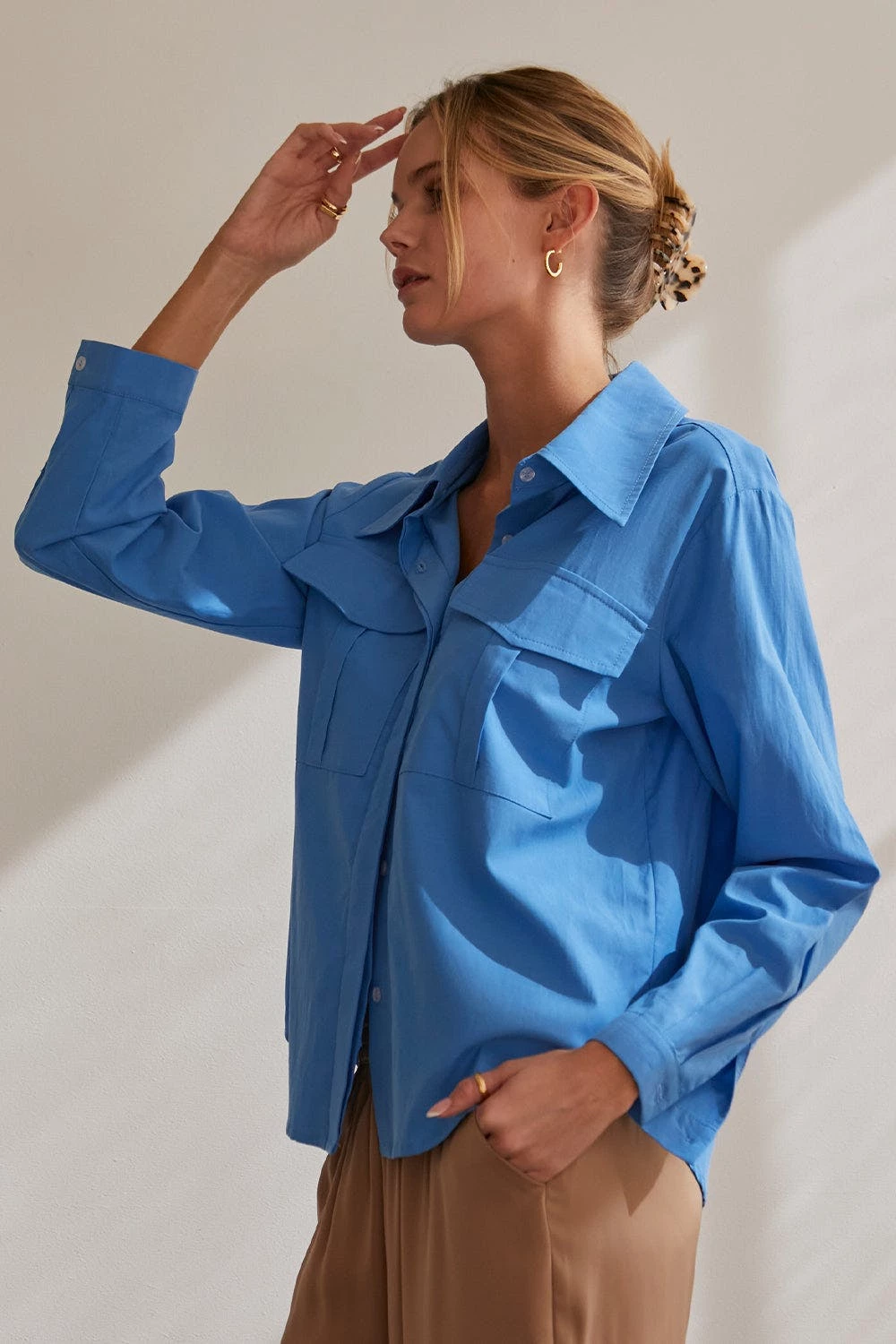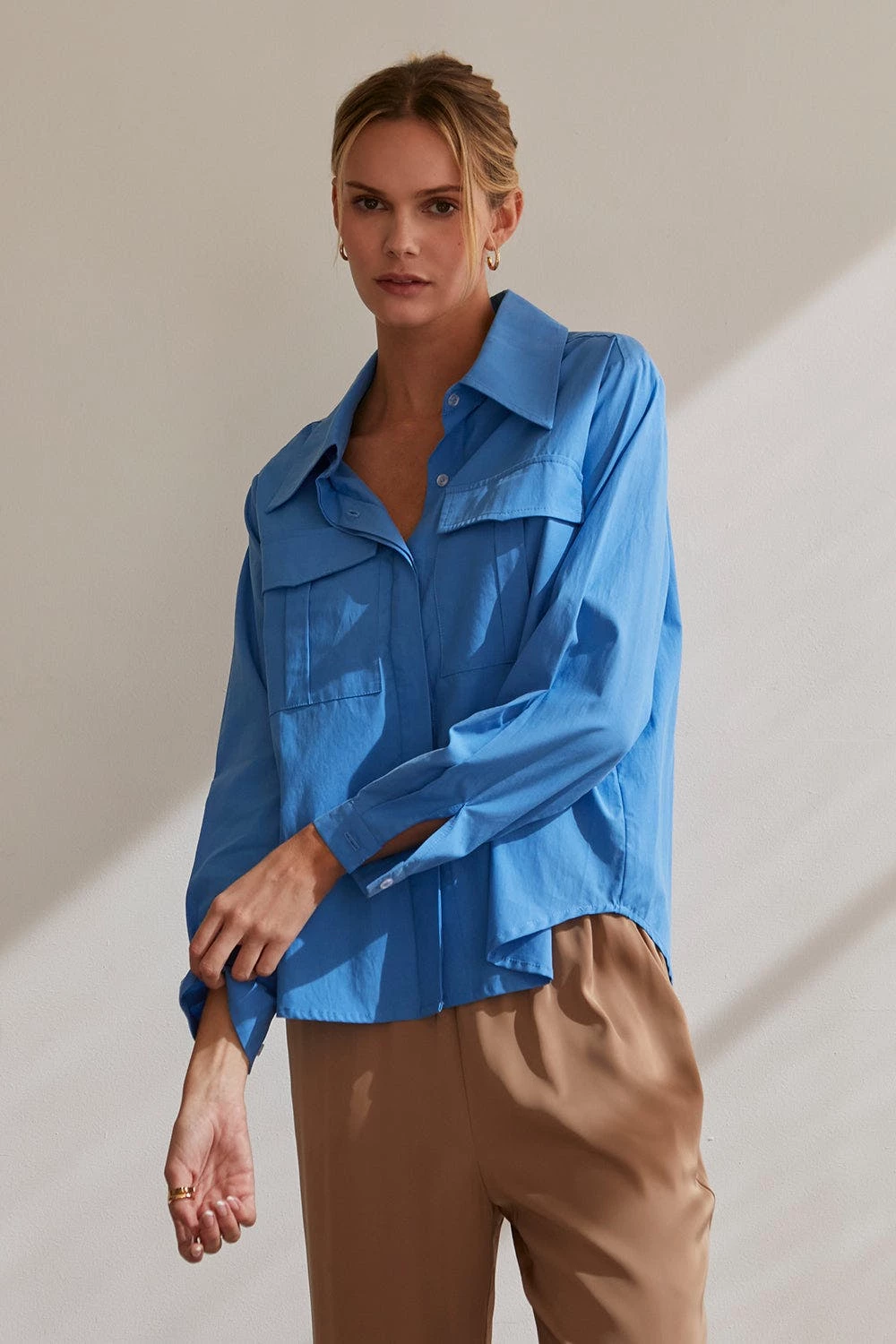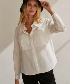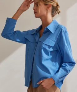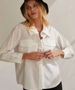 – Cora button up utility blouse- Two front utility pockets- Front button closure- Hidden button placket- Cuffs with button closure