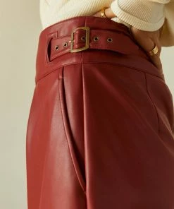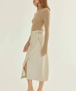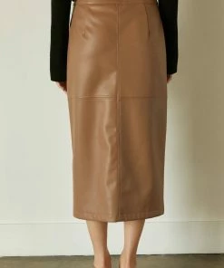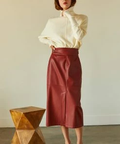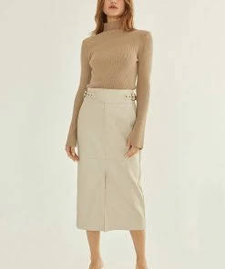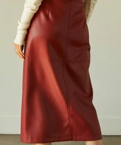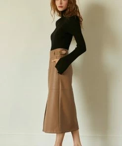 This vegan leather midi skirt features side adjustable buckles, center horizontal and vertical seam detail in front and back, side pockets and front slit. Made with soft and stretchy vegan leather material.