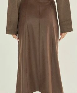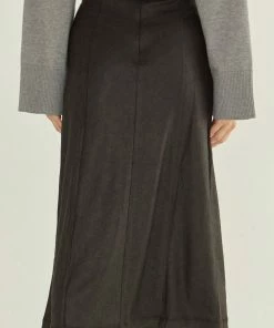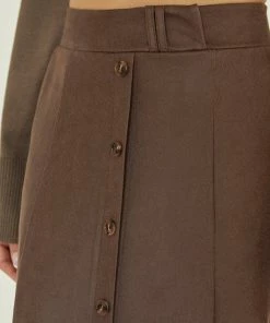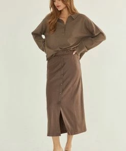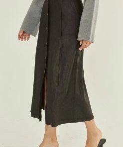 This soft vegan suede midi skirt features faux front placket with self cover buttons, front slit, and back zipper closure.