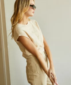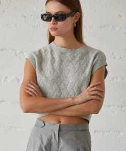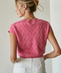 Made with a soft and lightweight sweater material, the Rae Knit Top is the perfect spring/summer sweater. Features crew neckline, cap sleeves, and diamond knitting pattern. Cut in a relaxed fit with cropped length.